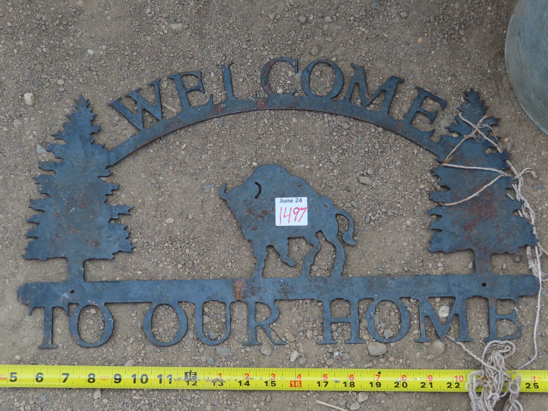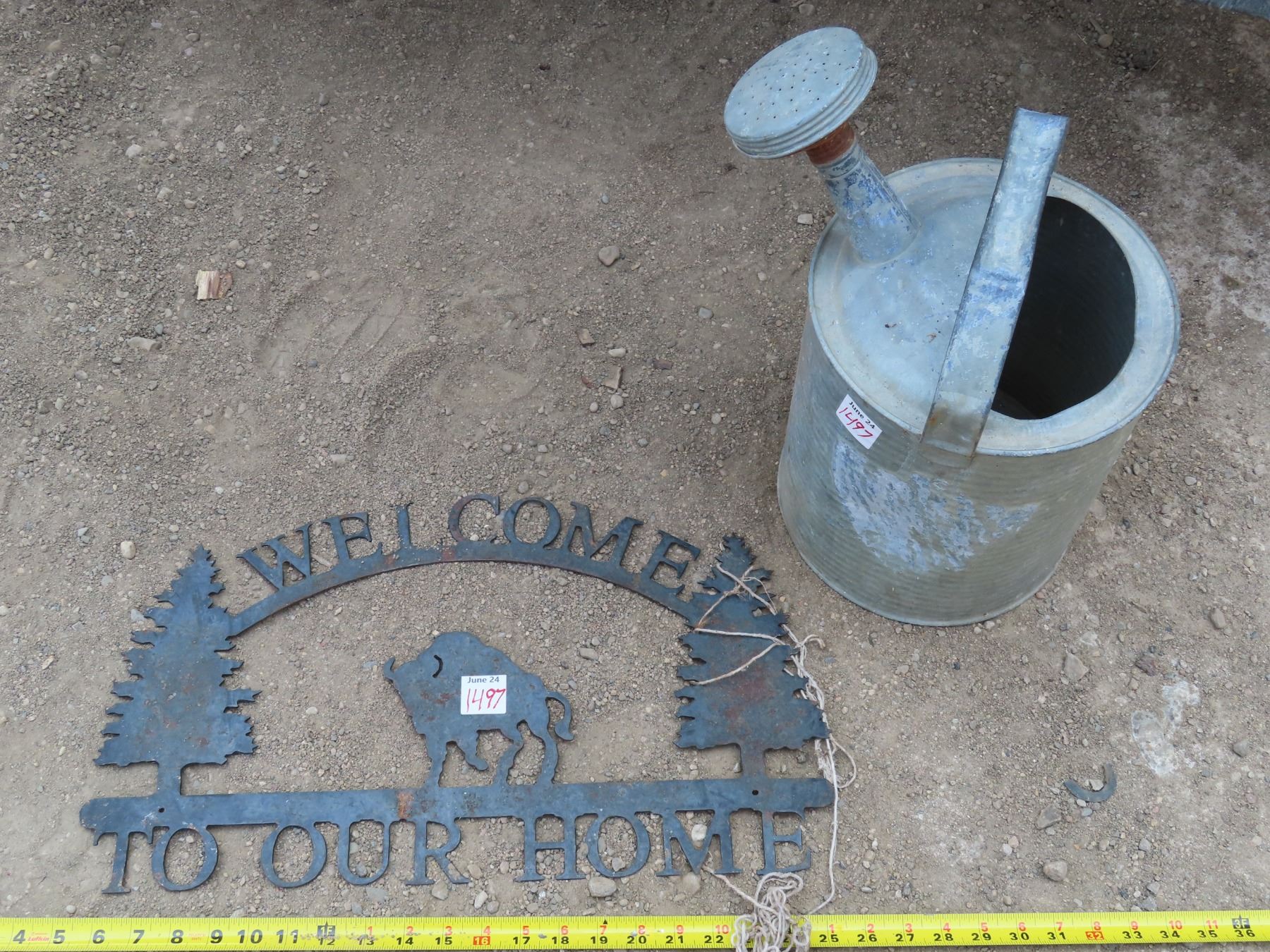 Metal Bison "Welcome to our home" sign + Galvanized watering can