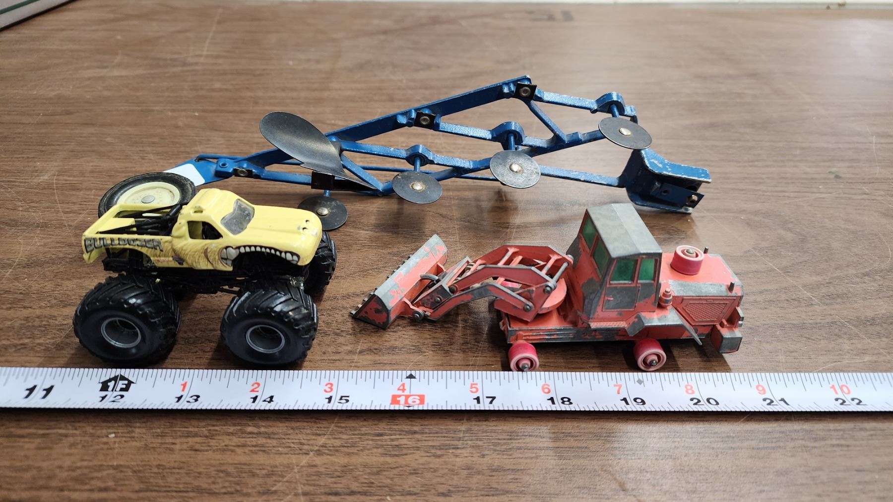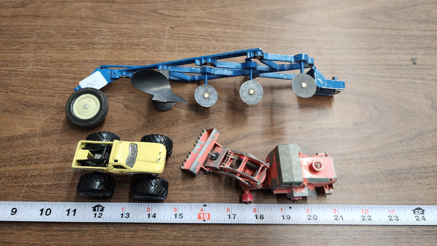 Metal “Ertl” Plow, Metal “Matchbox” Tractor, Metal “Hot Wheels” Monster Truck