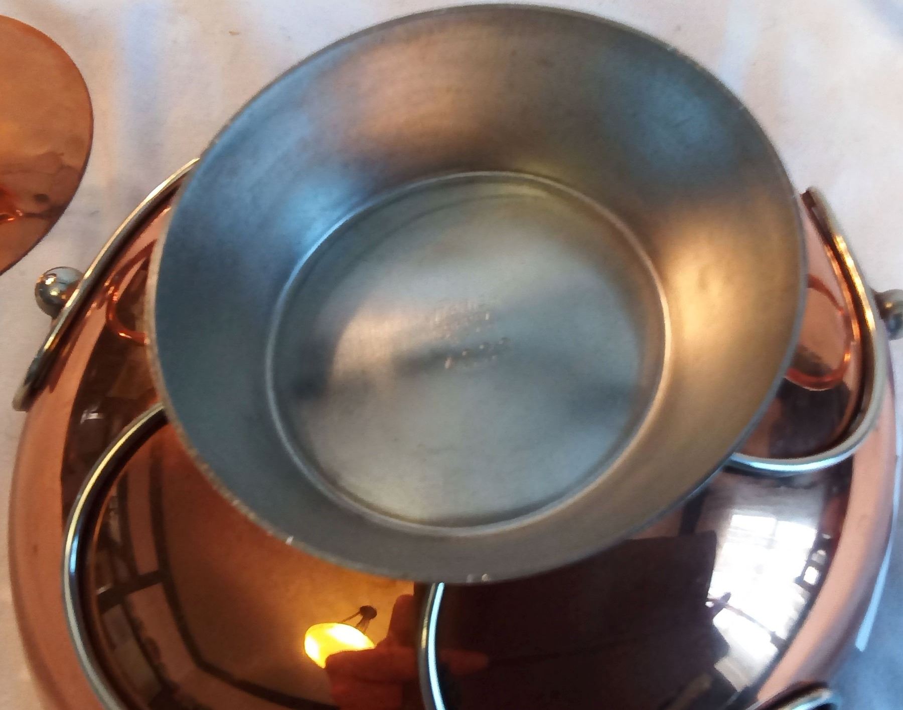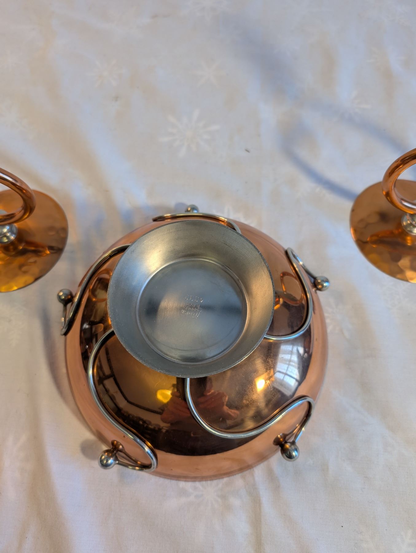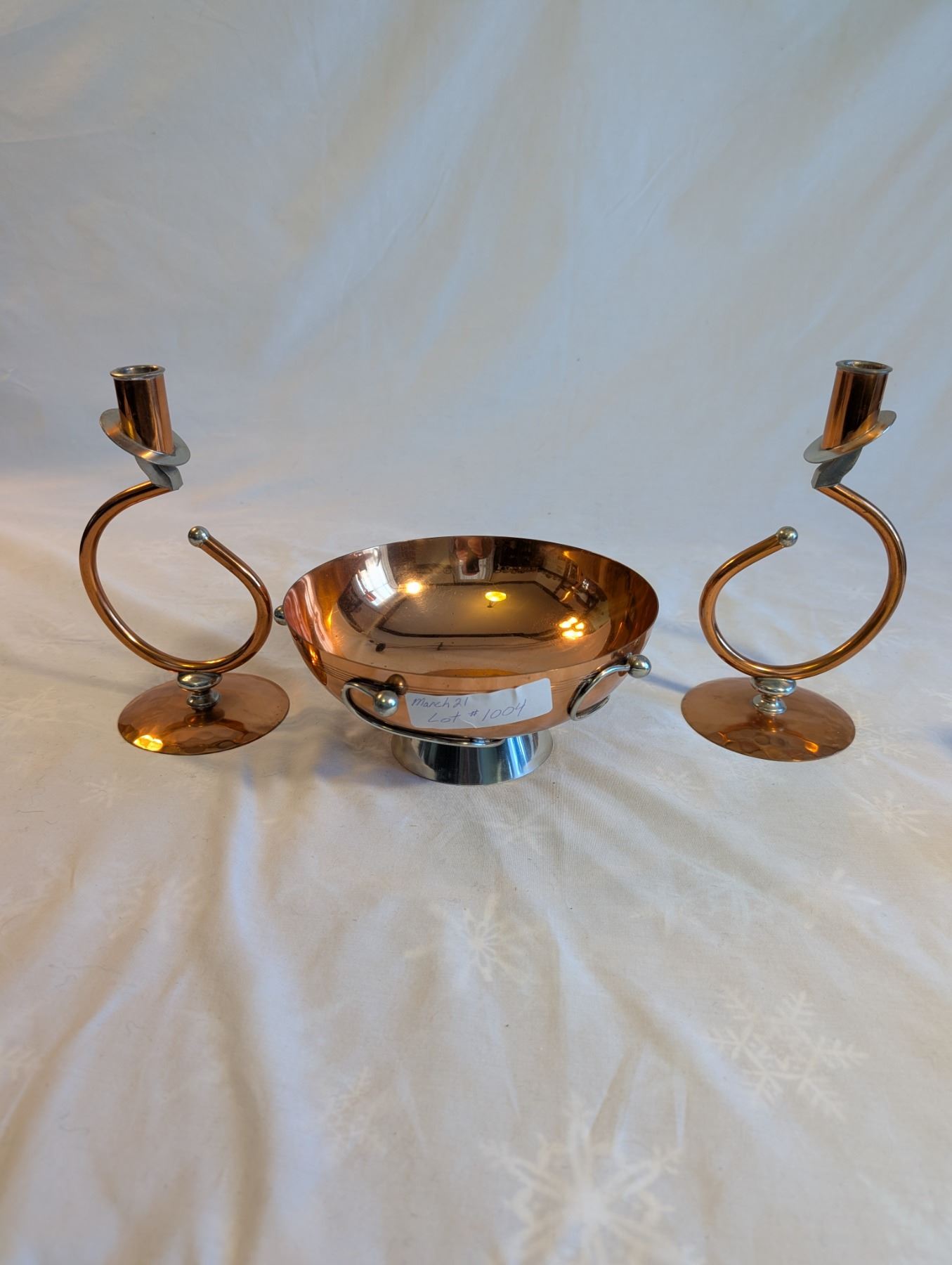 Mid Century Consol 3 Piece Set 1950's Flemish Copper Bros. 8 inch Bowl, Candlesticks 8 1/2 inches Tall.