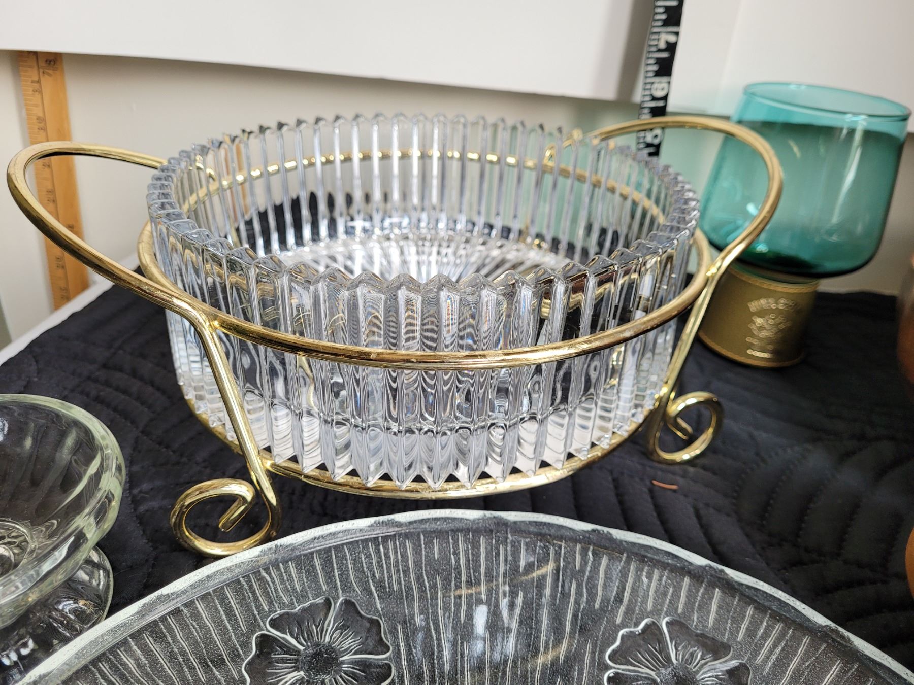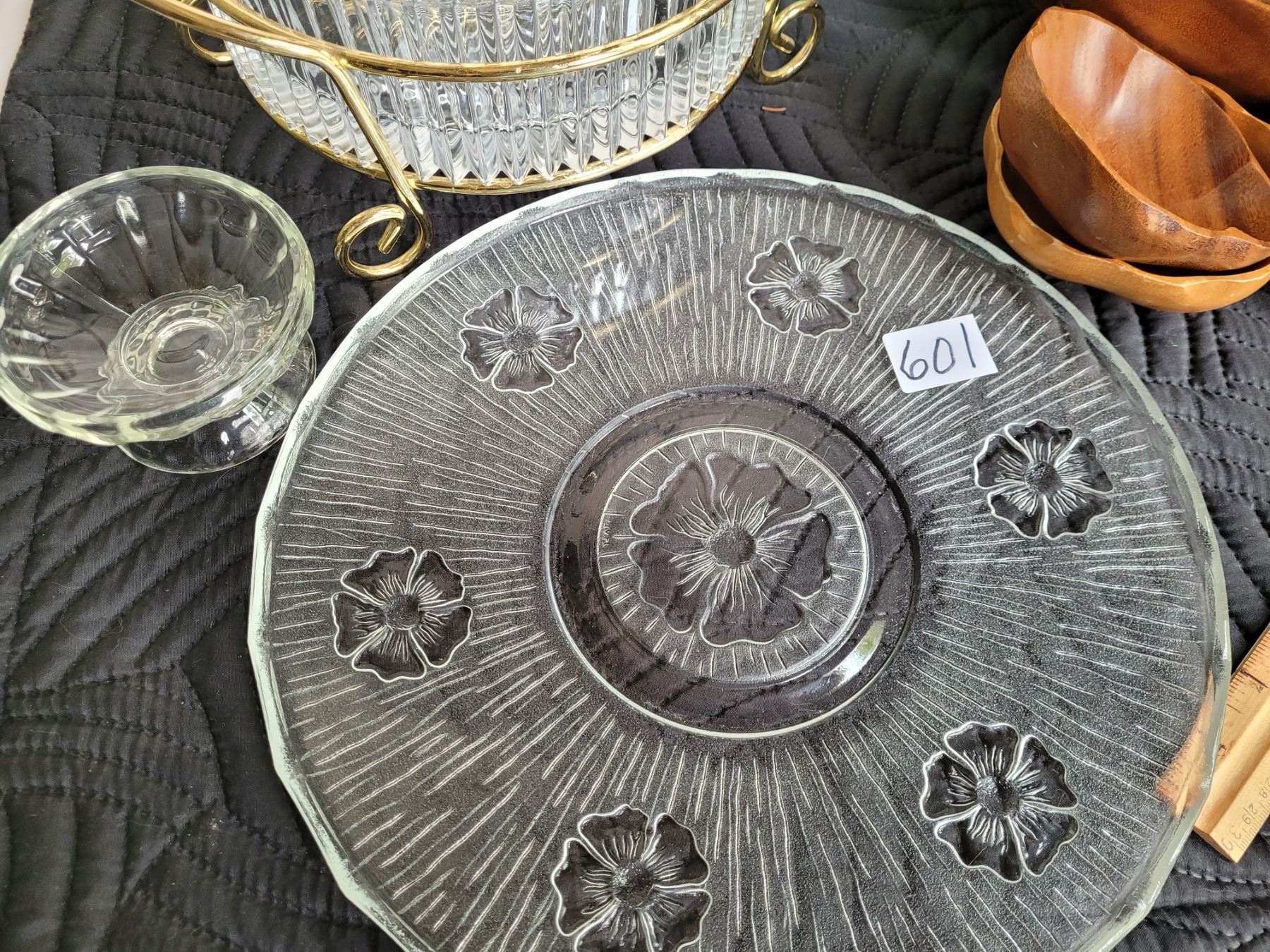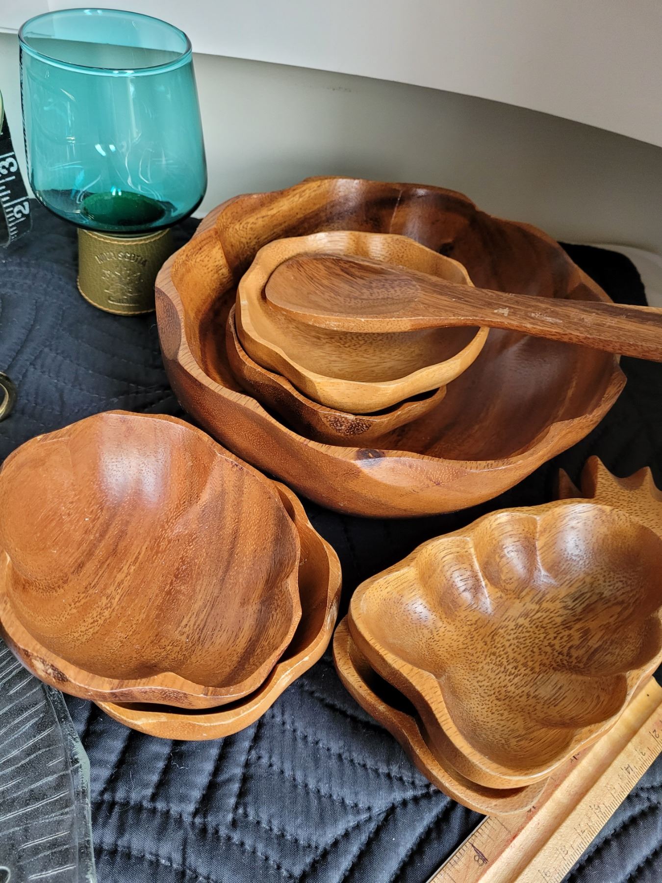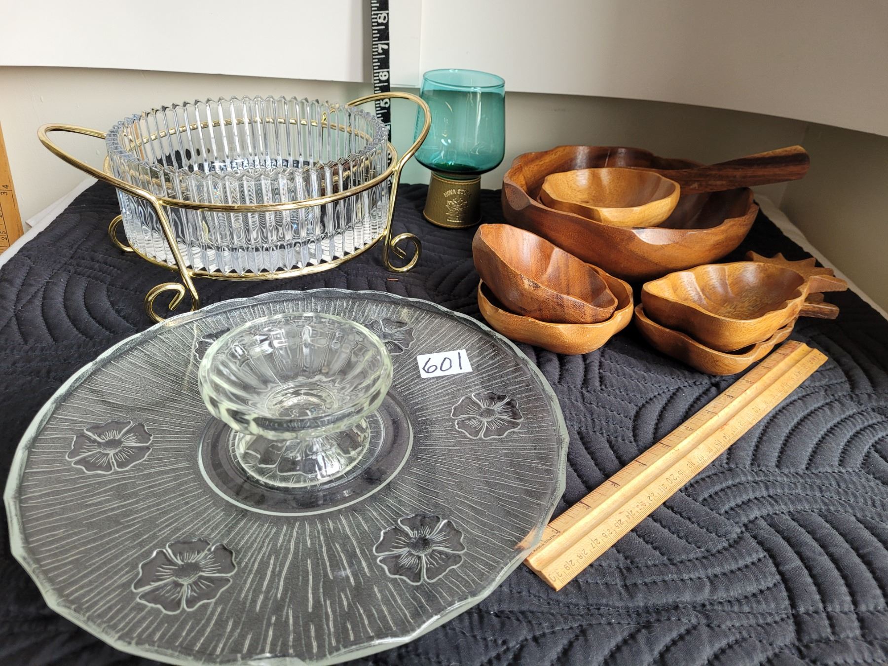 Mid century cake platter & serving dishes. Teak salad bowl set.