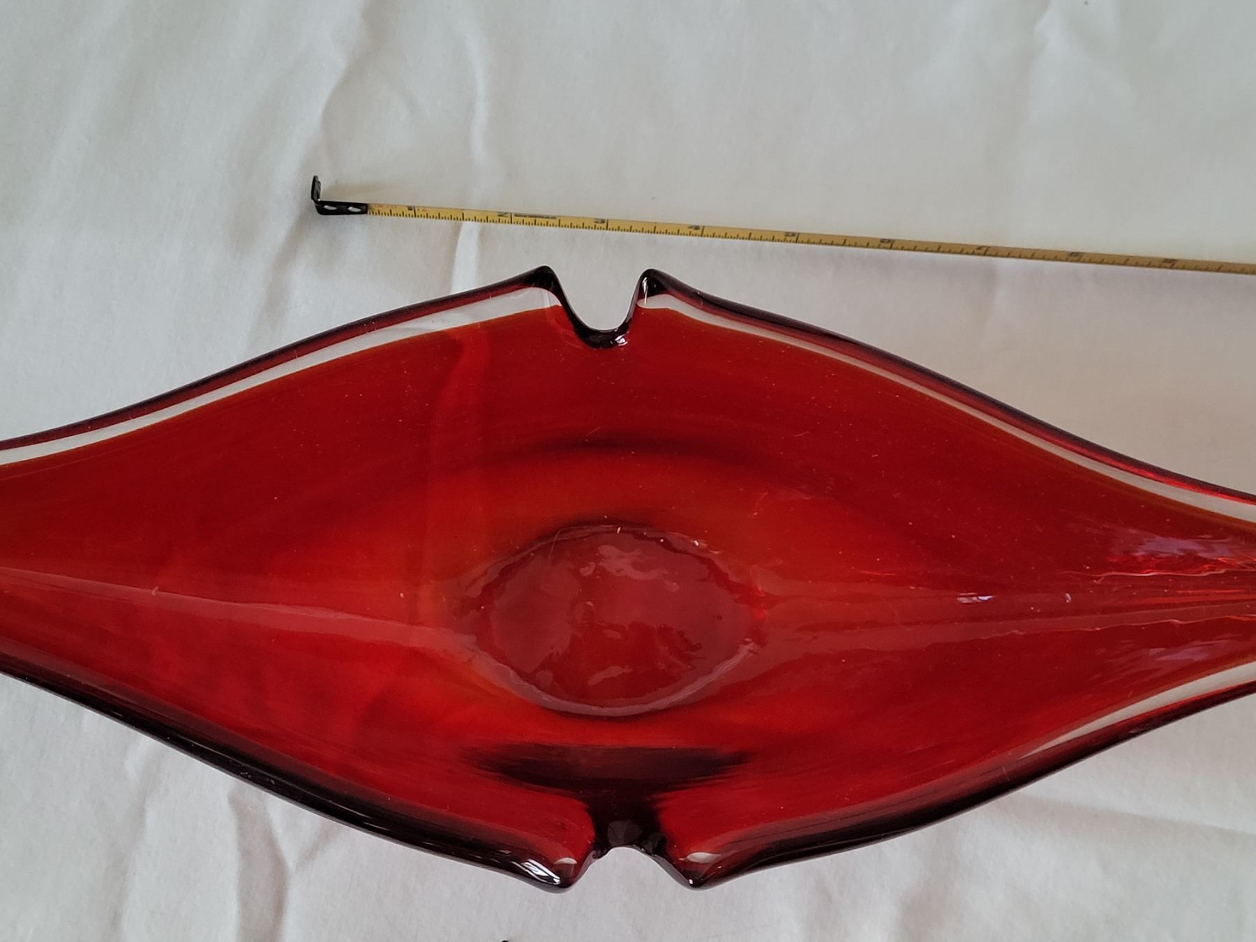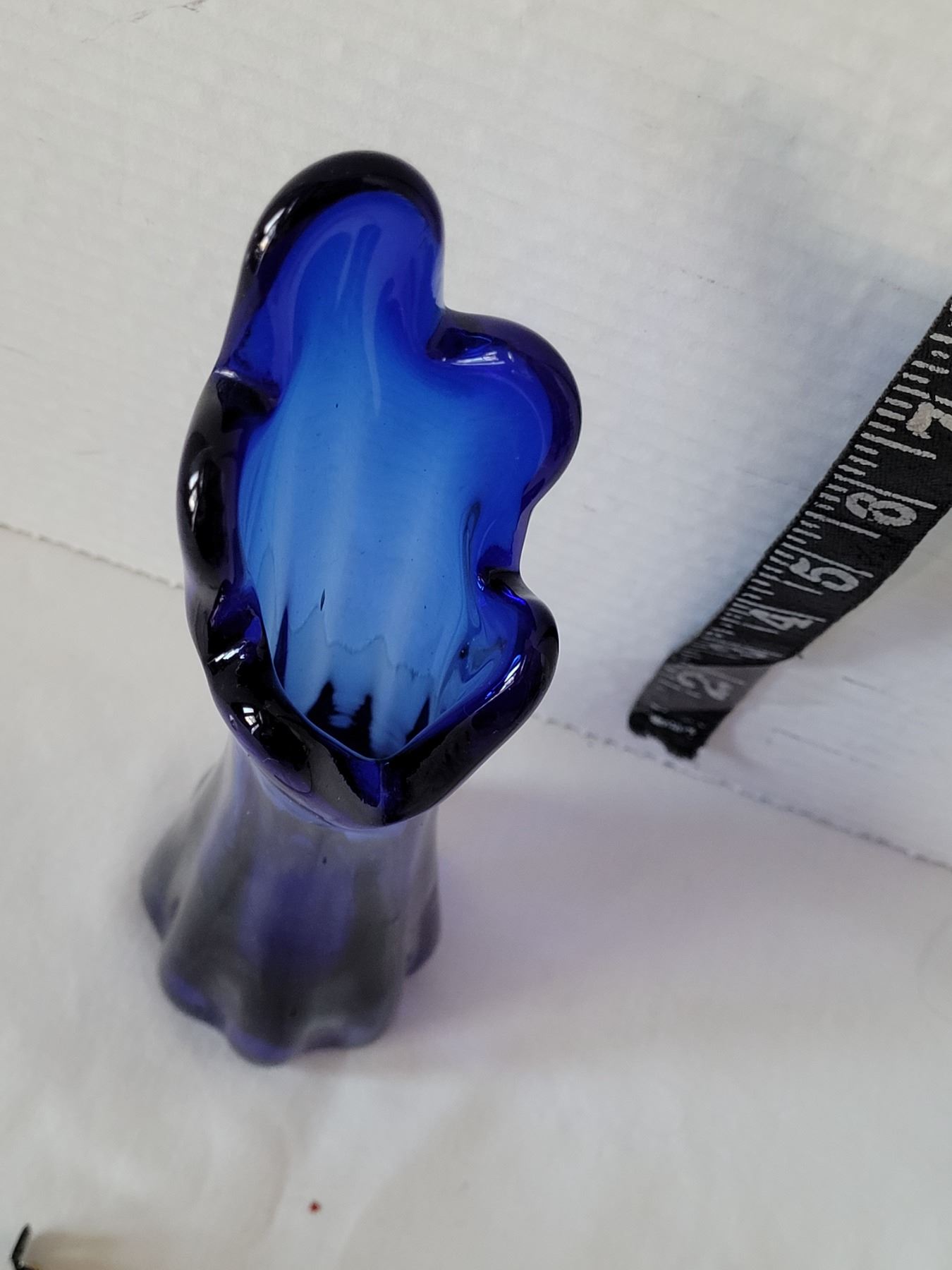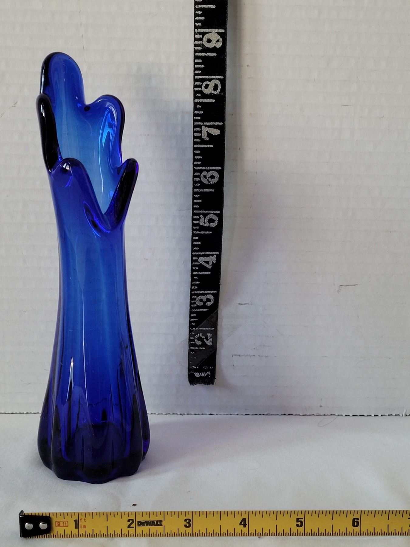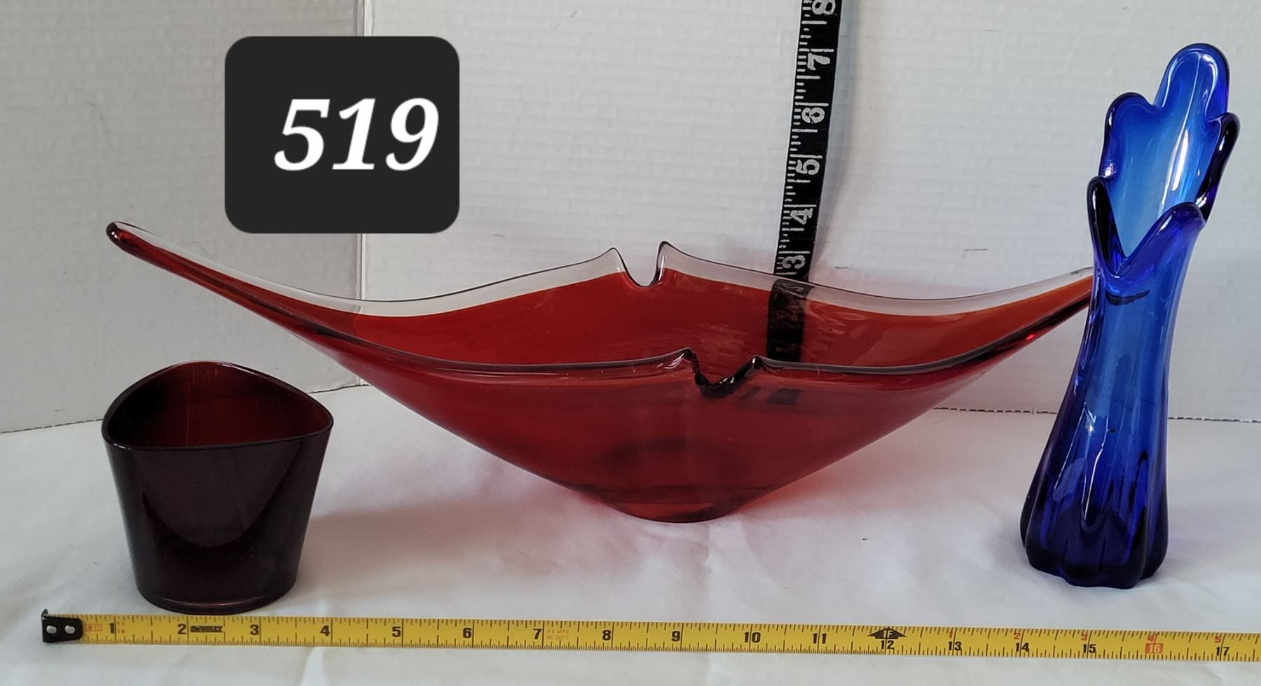 Mid century cobalt blue 5 finger swung art glass bud vase. Murano style red center piece ( repaired end) plus red candle votive.