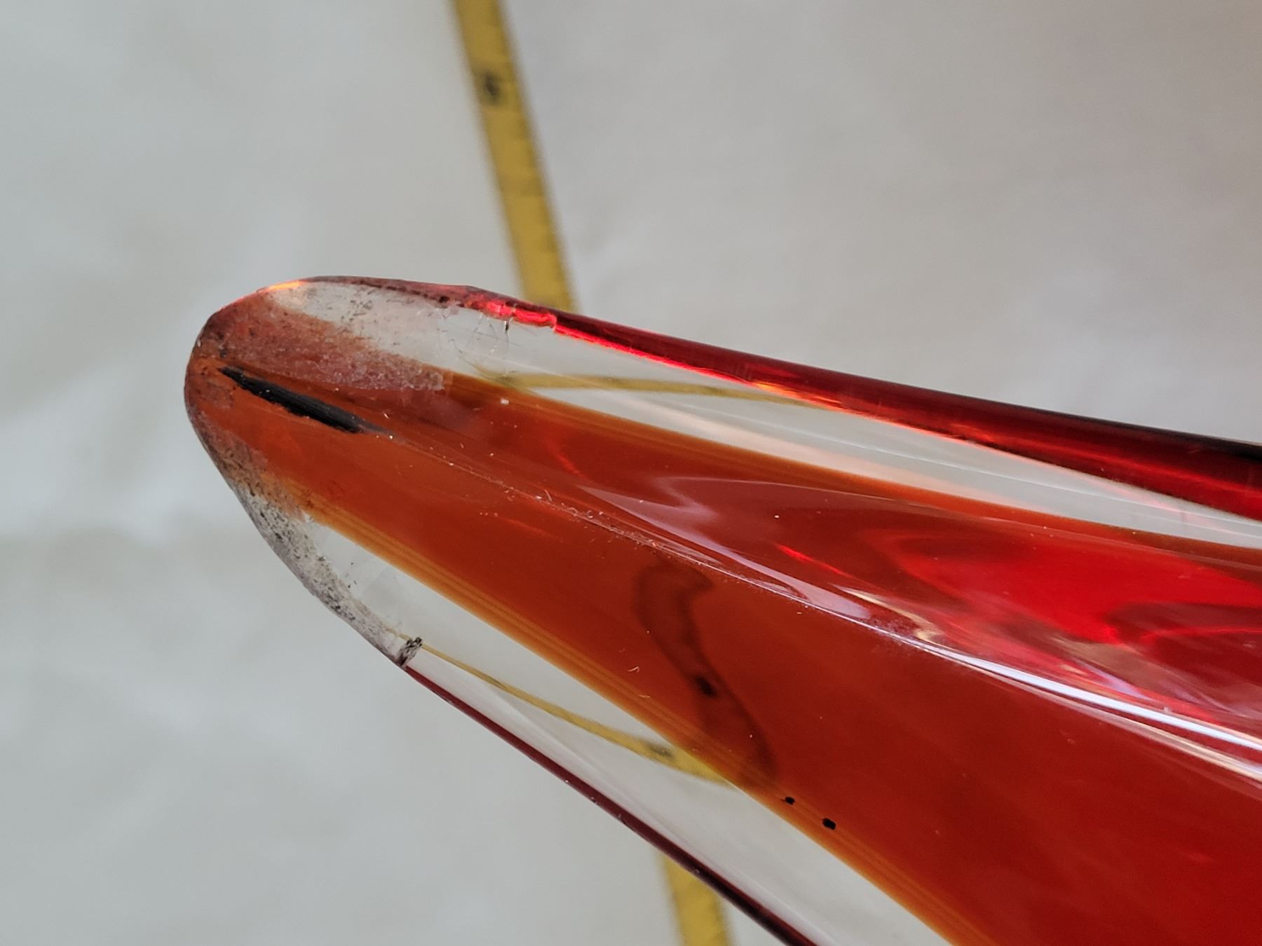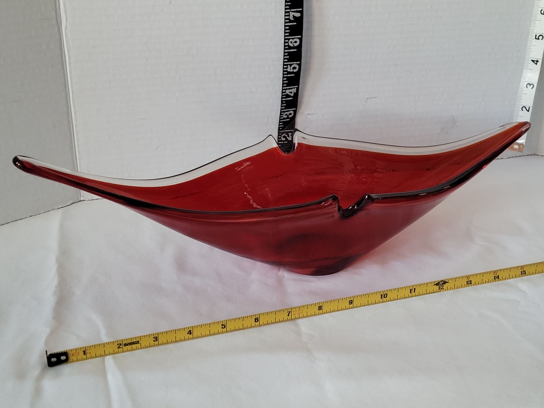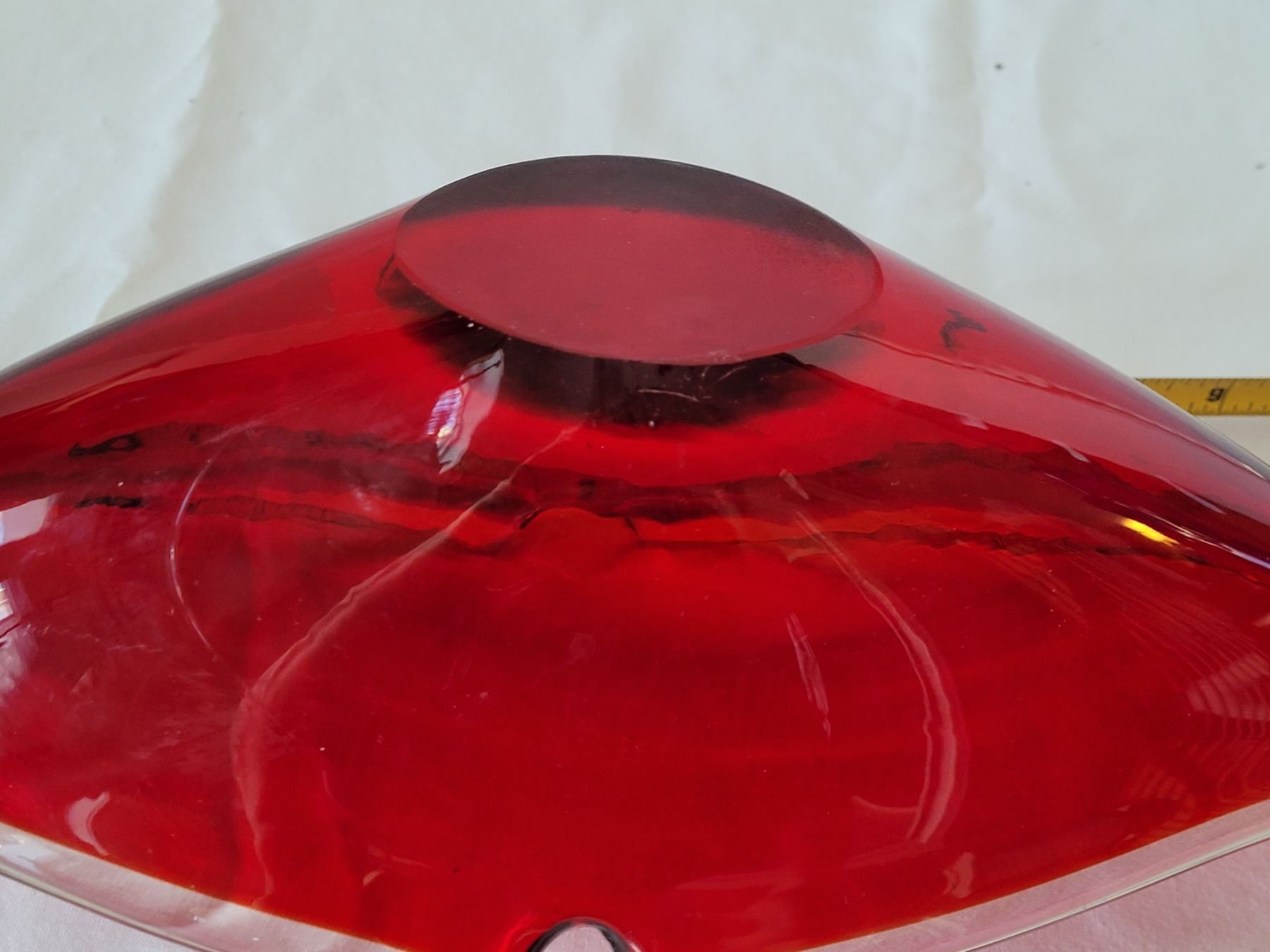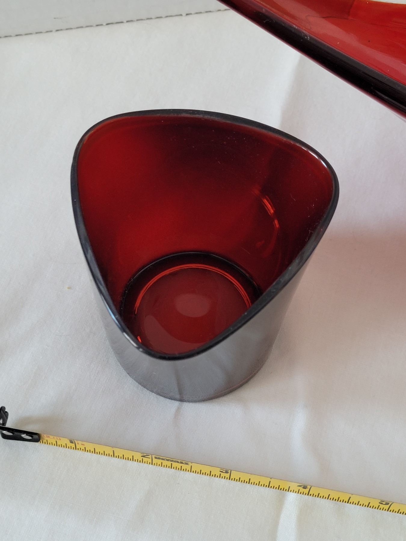 Mid century cobalt blue 5 finger swung art glass bud vase. Murano style red center piece ( repaired end) plus red candle votive.