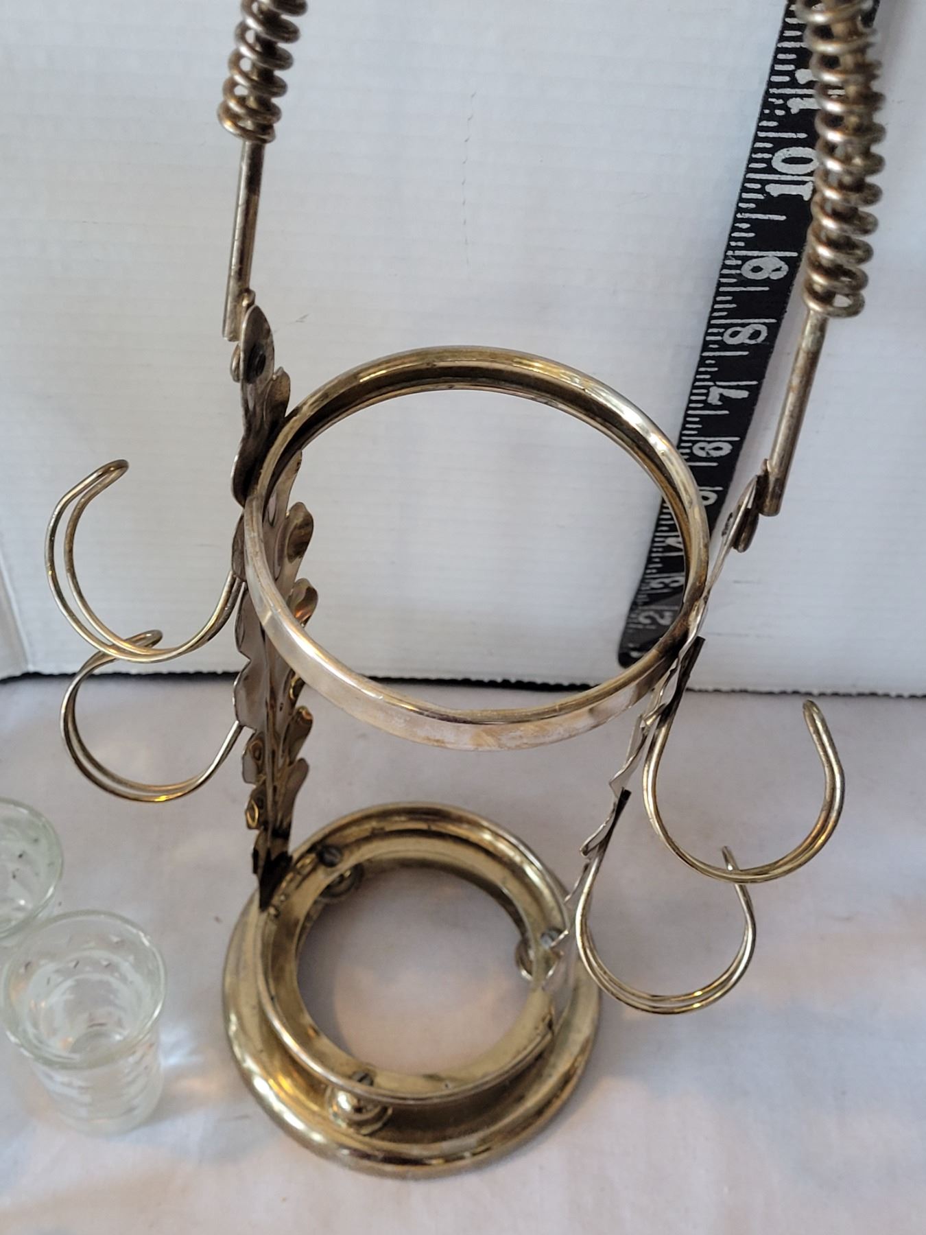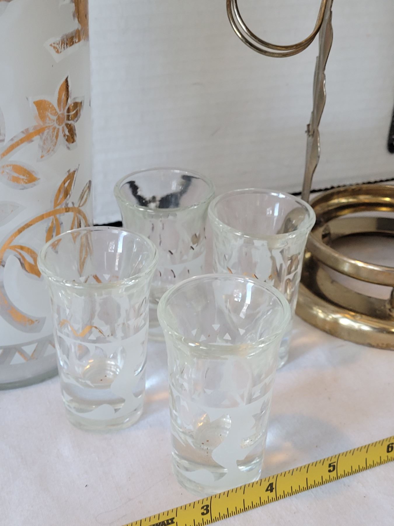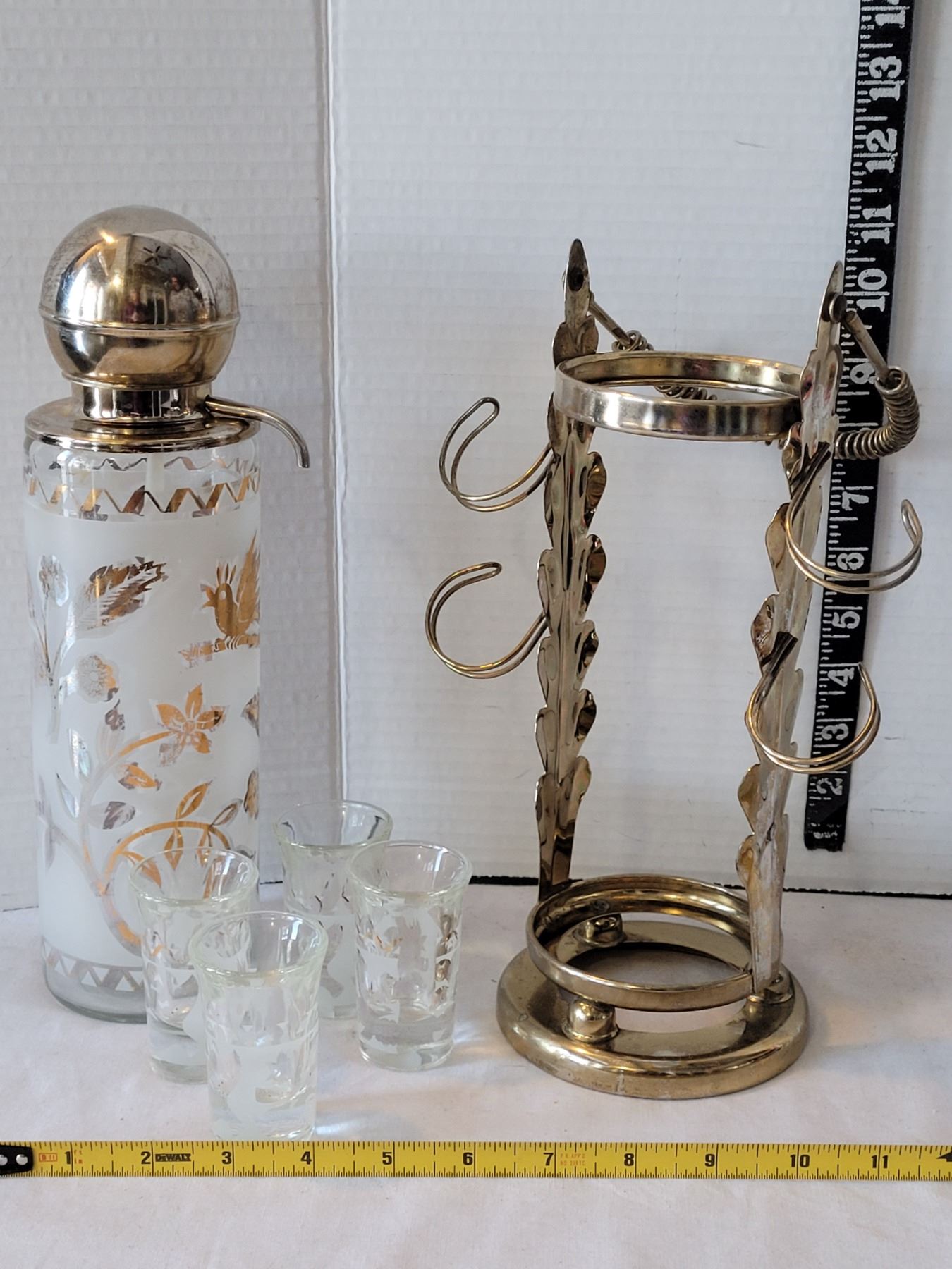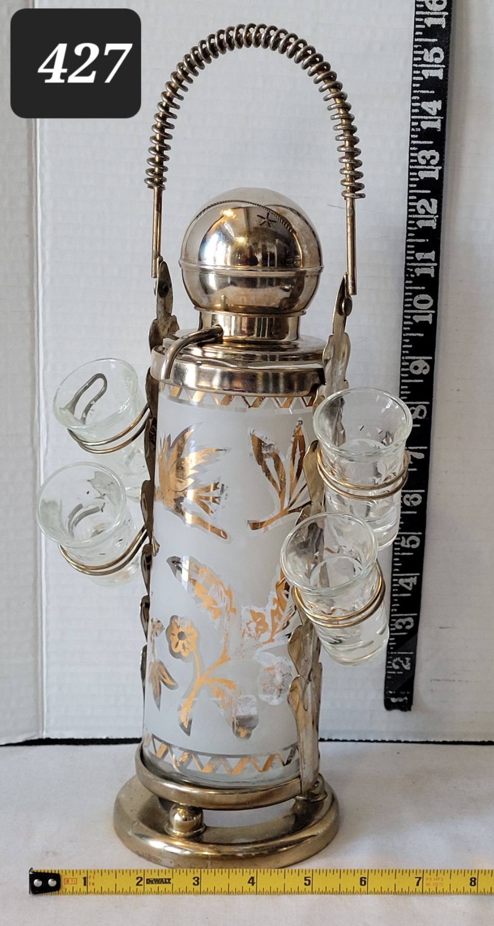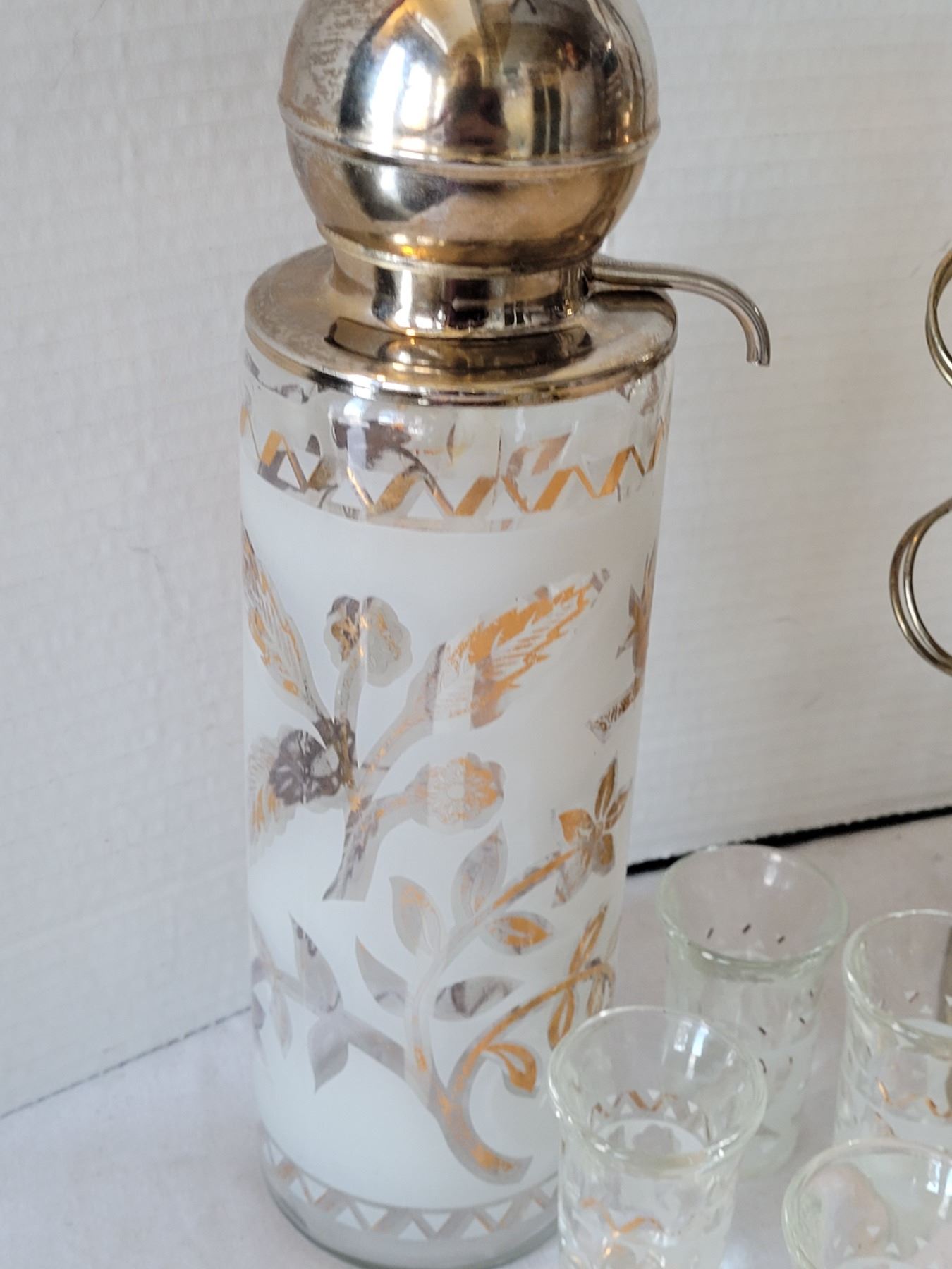 Mid century frosted, gold leaf, pump action liquor service & 4 shot glasses.