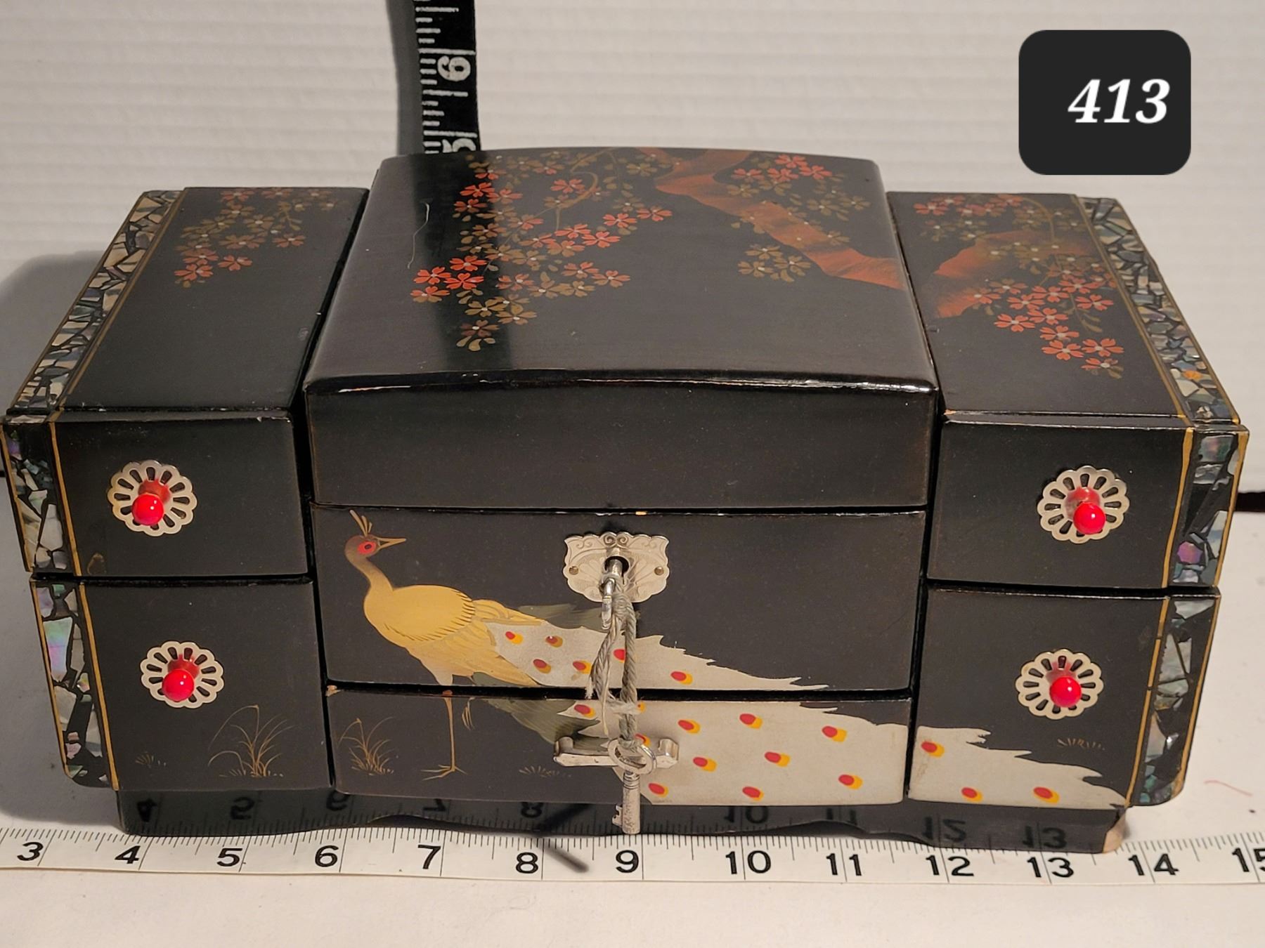 Mid century musical oriental jewellery case with lock & key. Japan made.