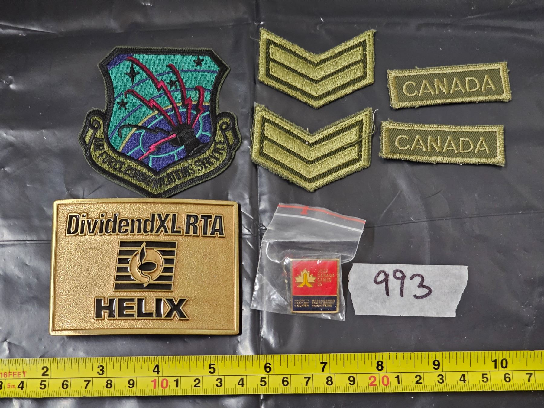 Military Patches, Belt Buckle (possibly brass, cannot confirm), Pin