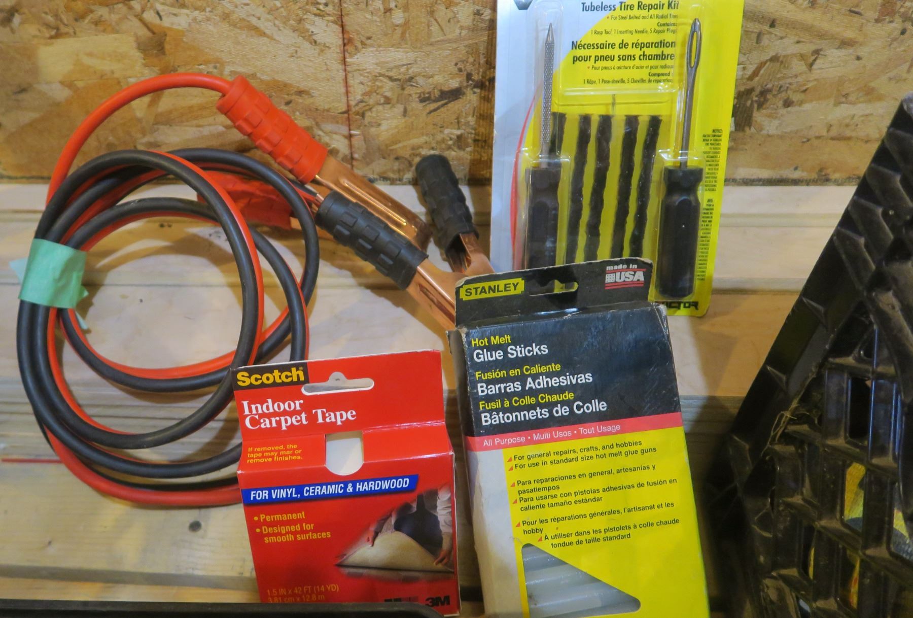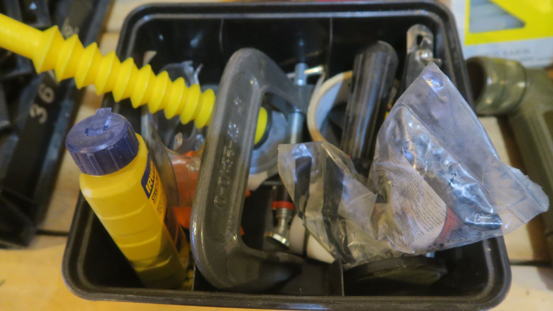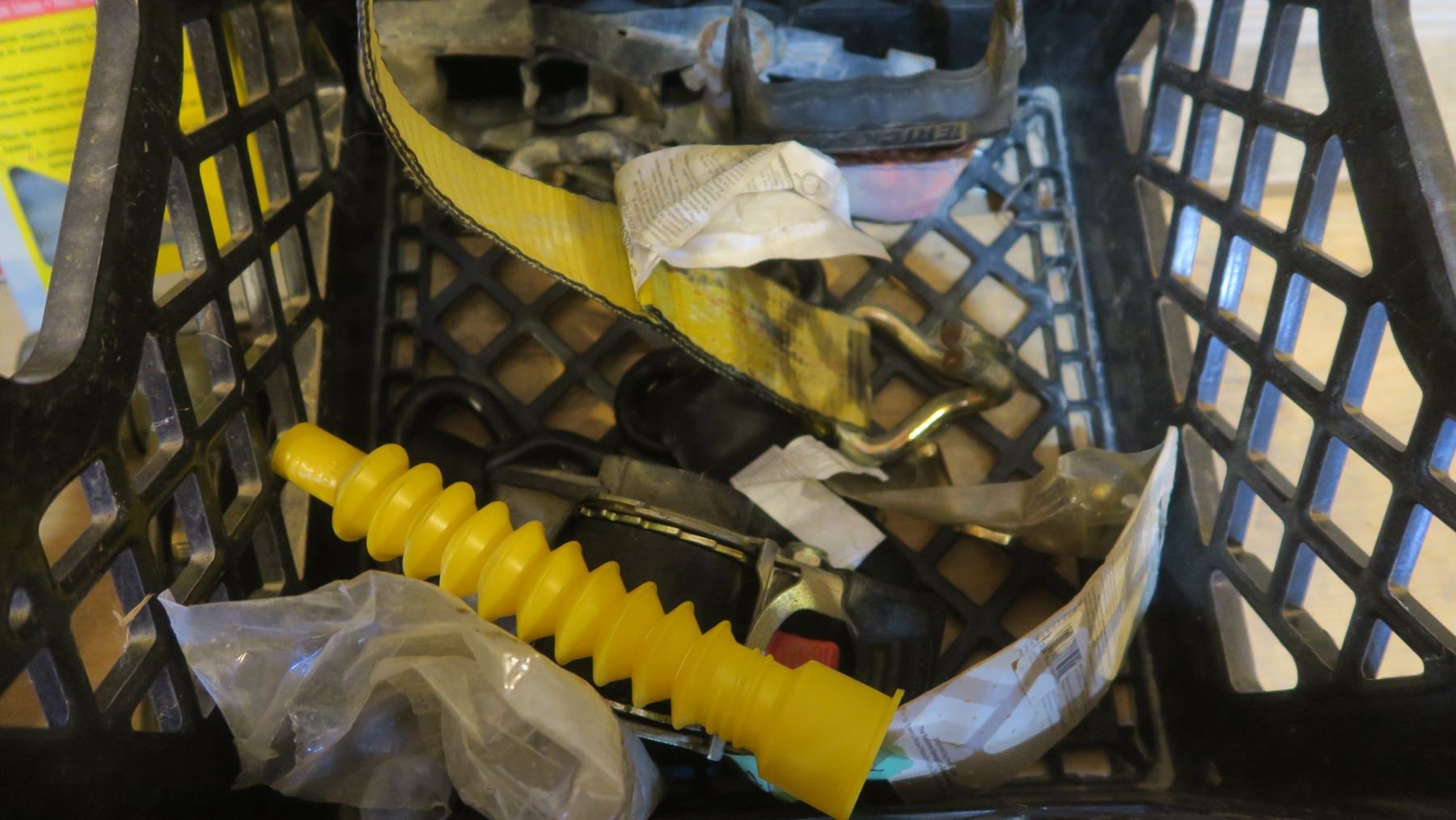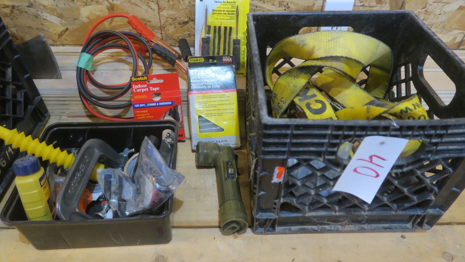 Milk Crate With Ratchet Straps, Tire Repair Kit, C-Clamp, Tapes, Etc.