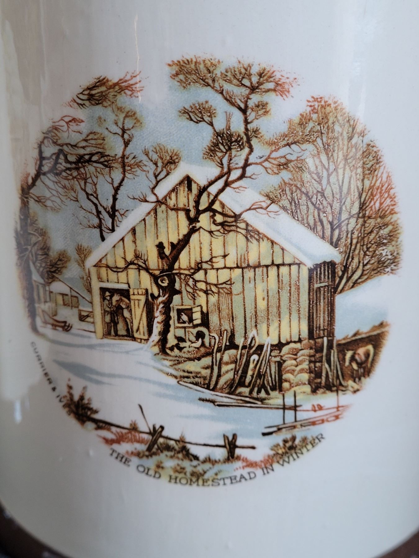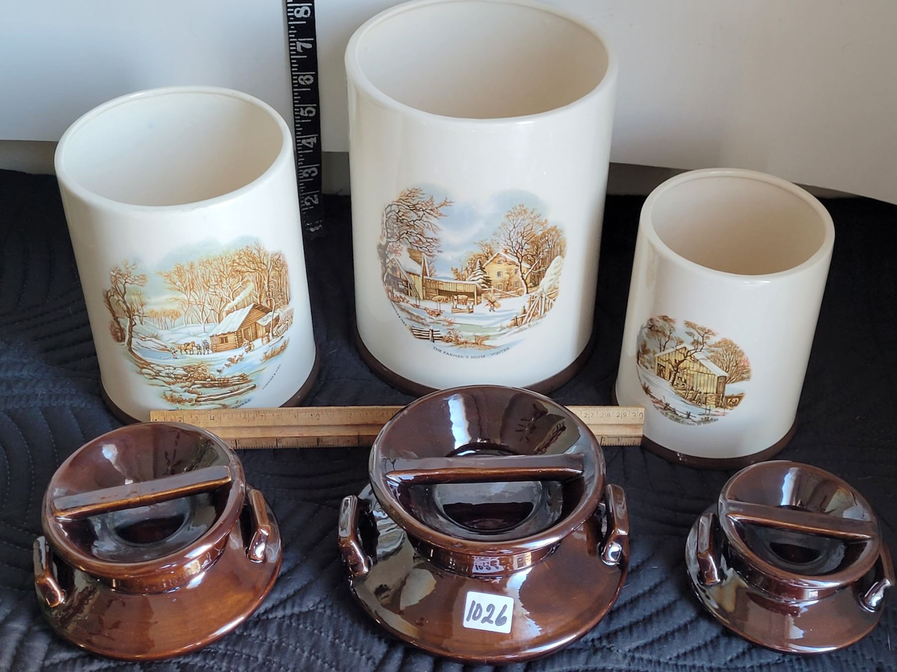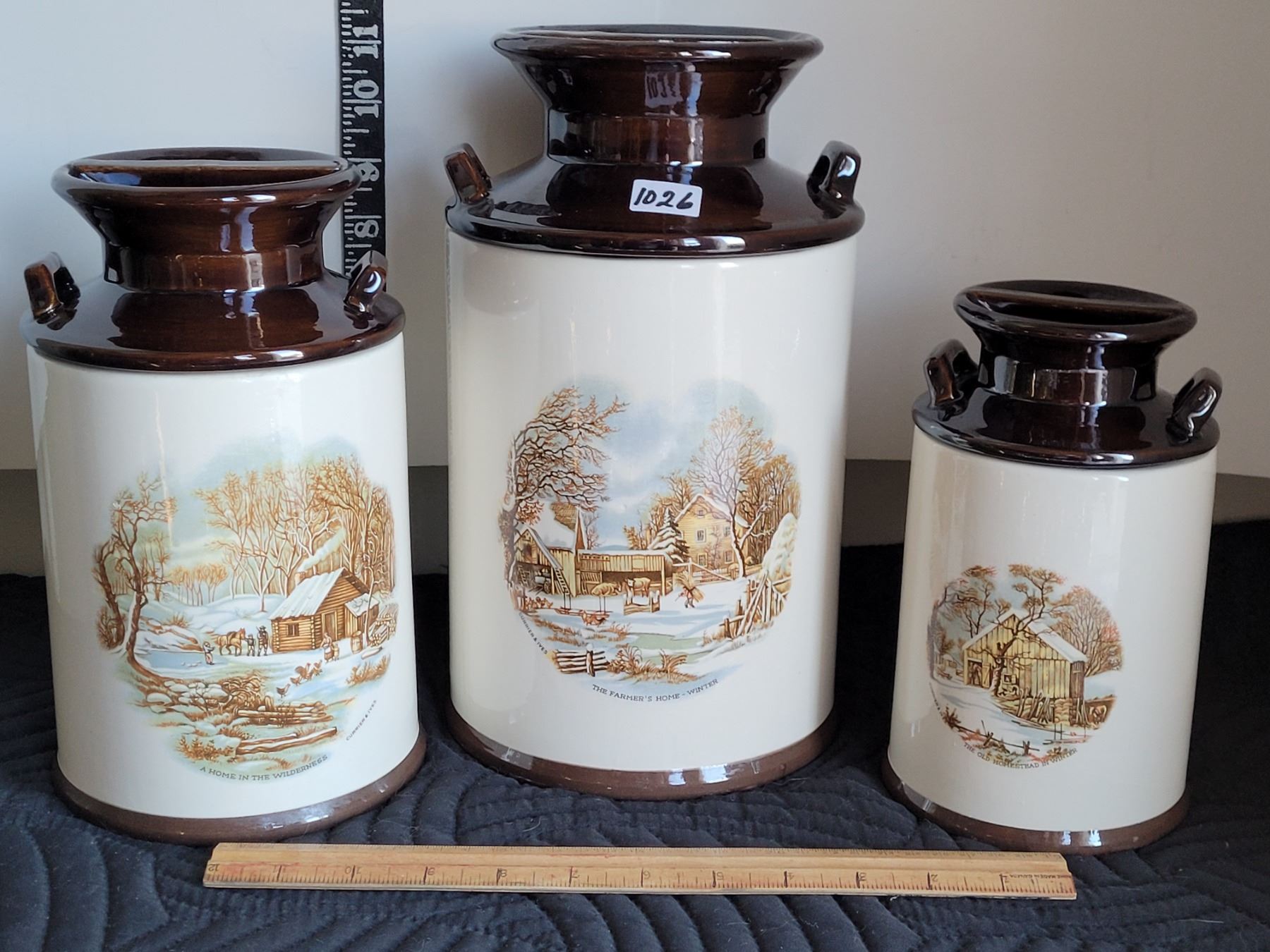 Milk can style canister set by Jenny's Ceramics. Each features a different farm scene.