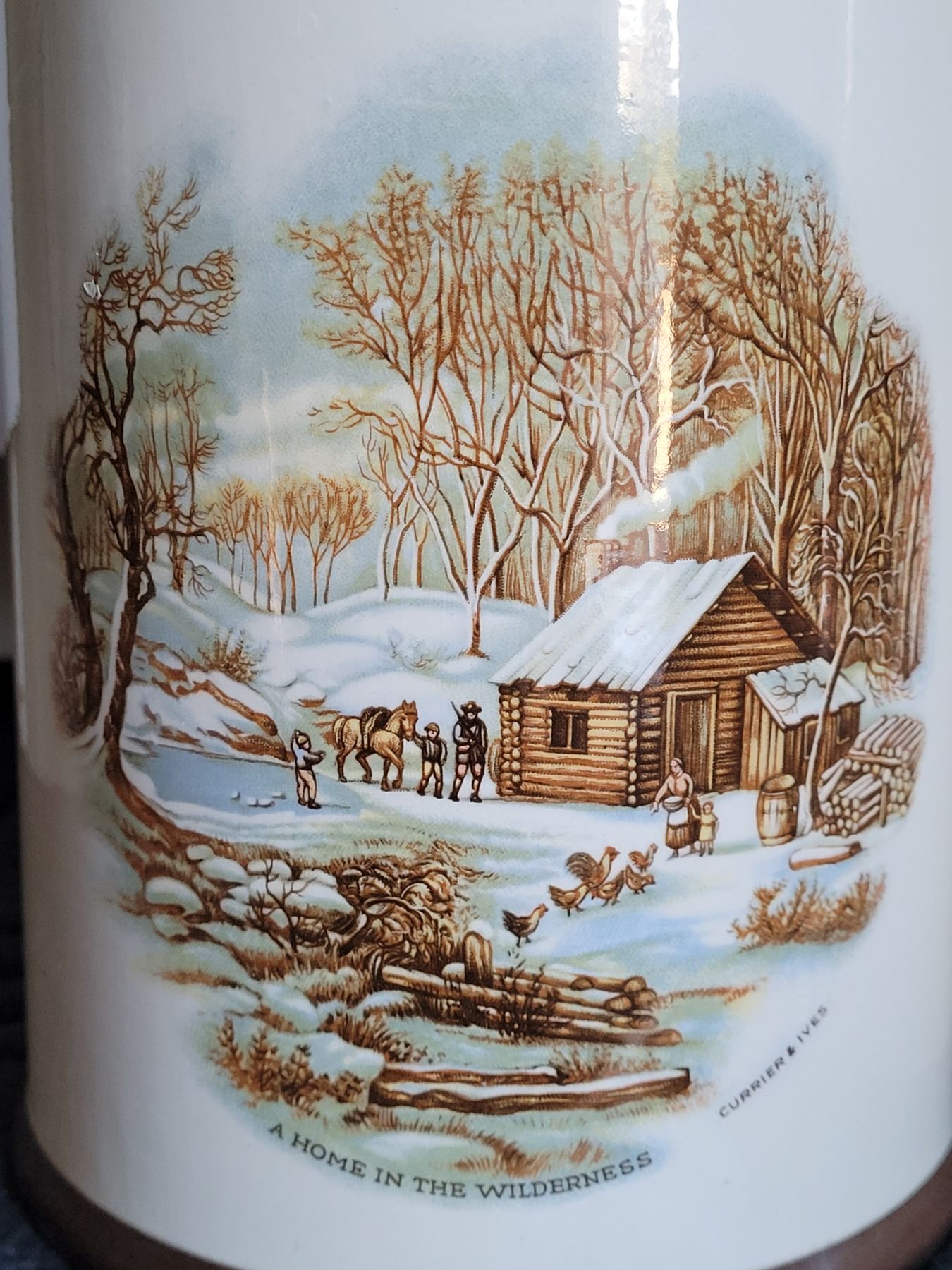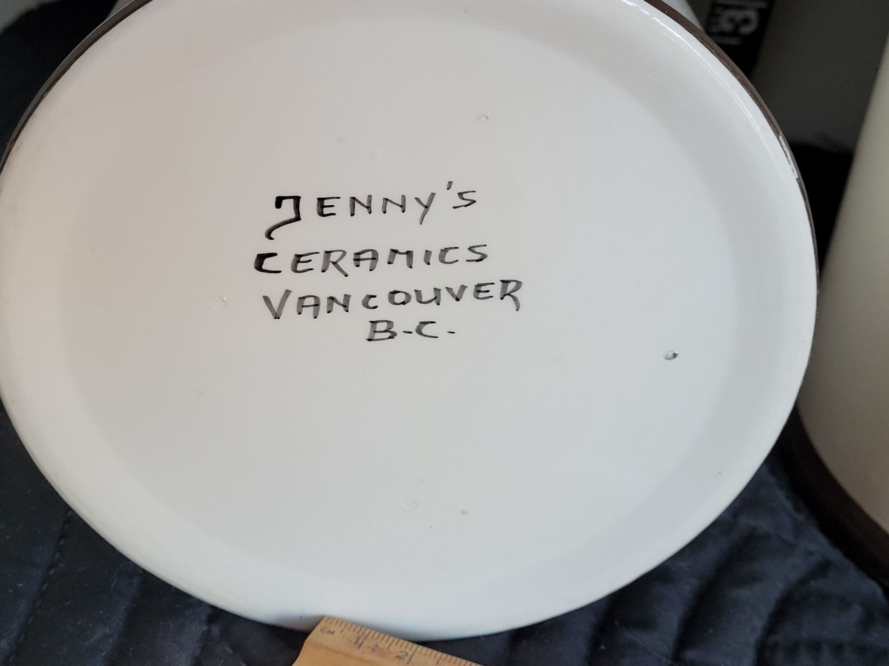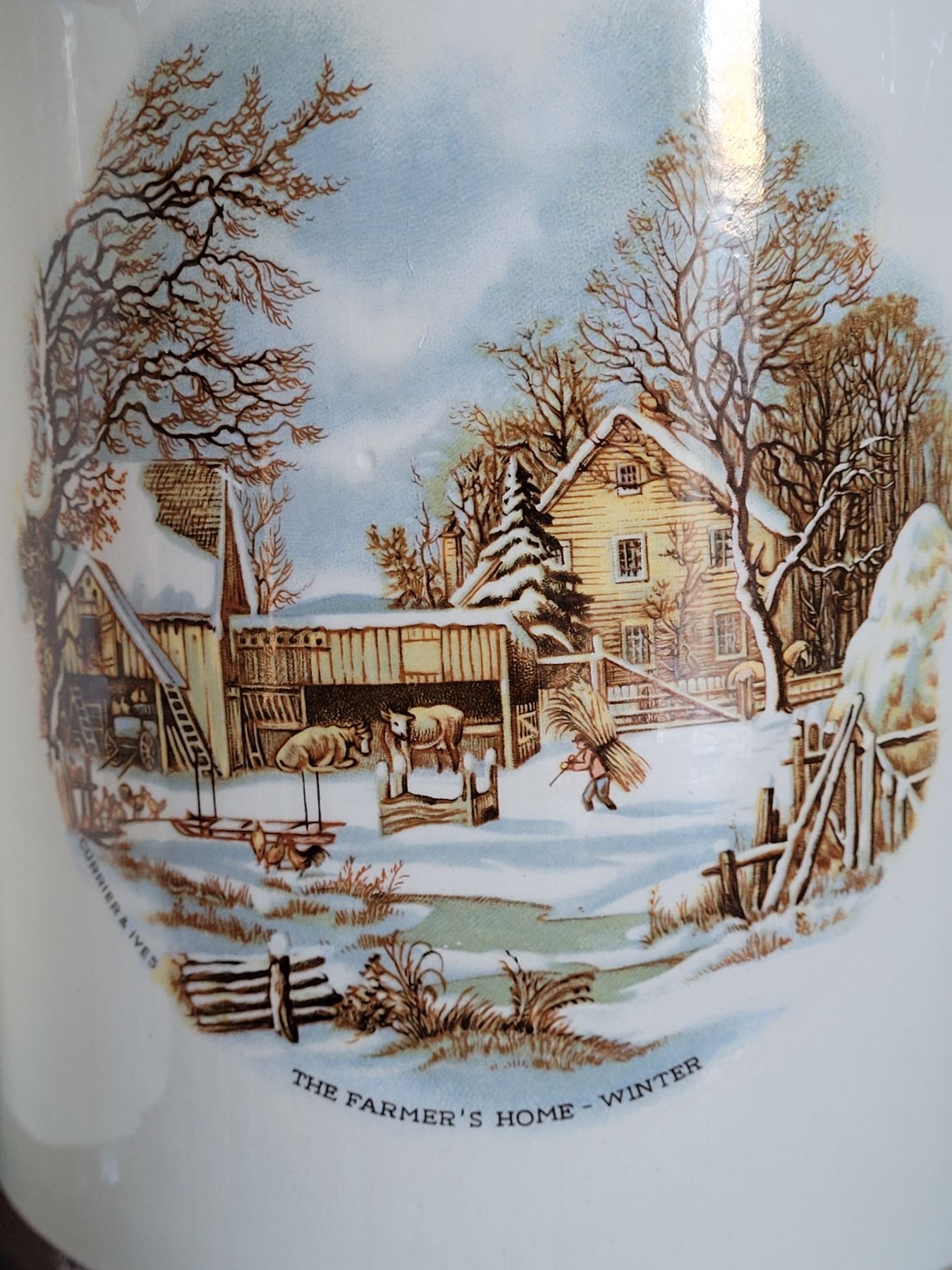 Milk can style canister set by Jenny's Ceramics. Each features a different farm scene.