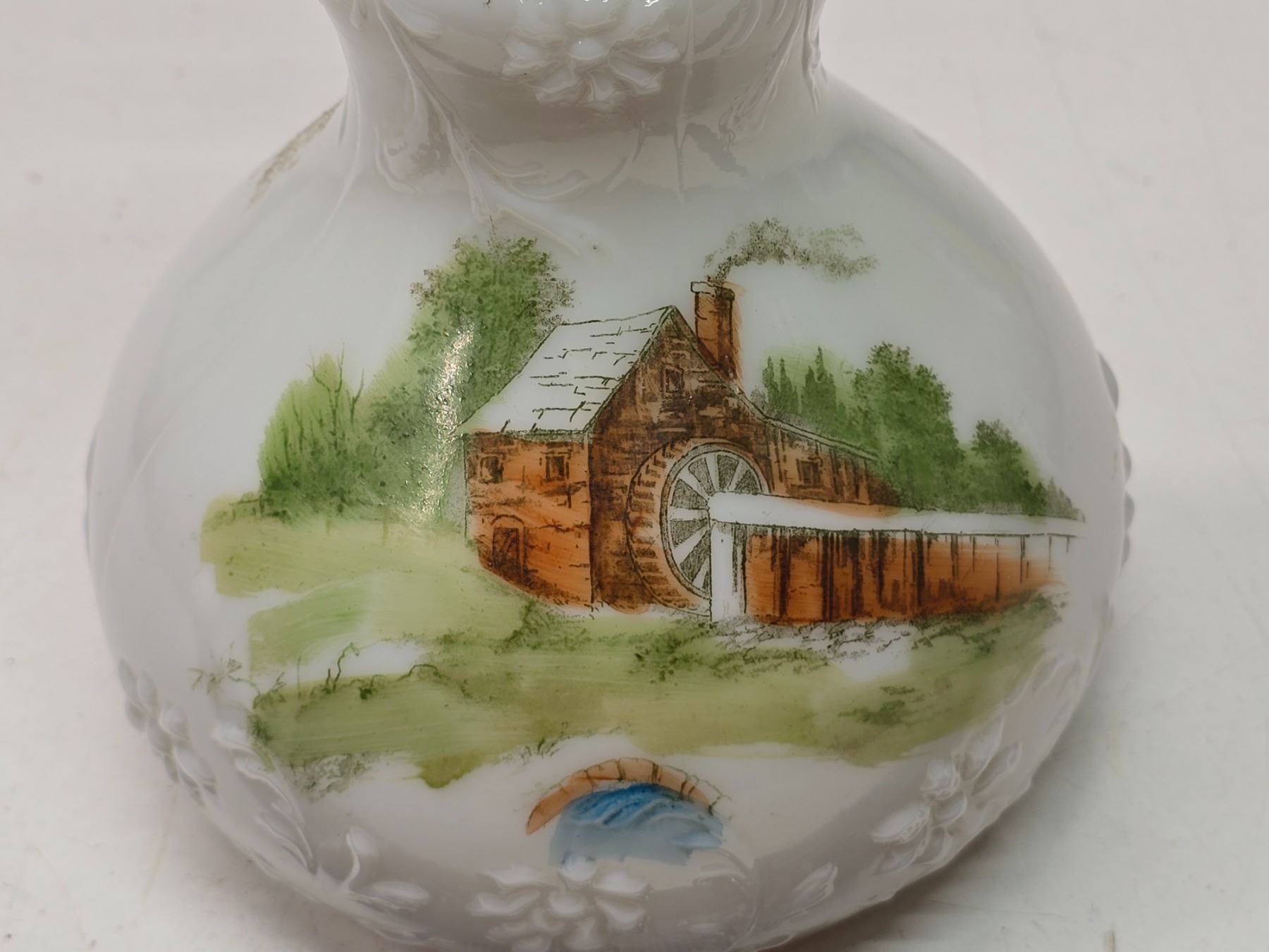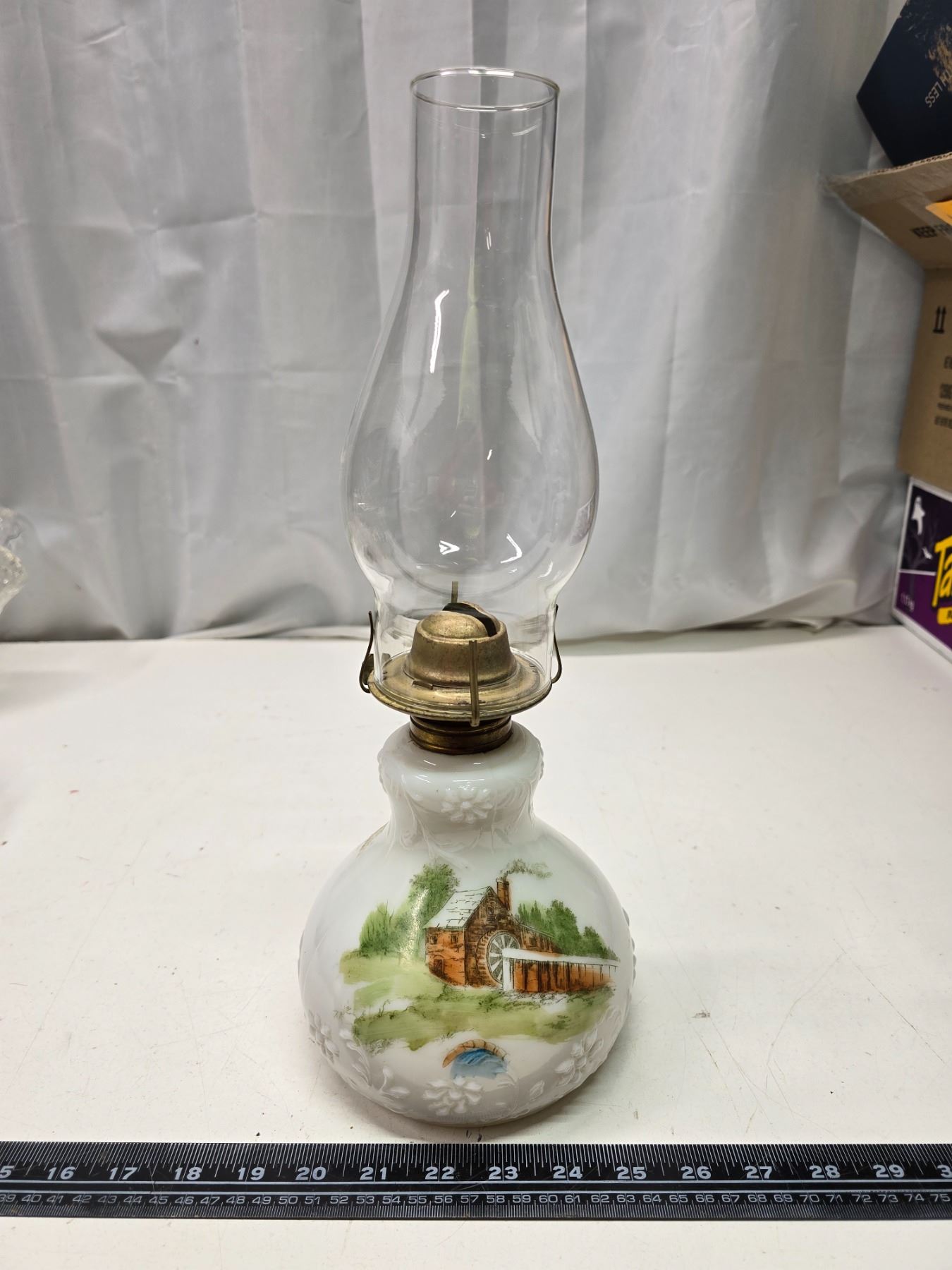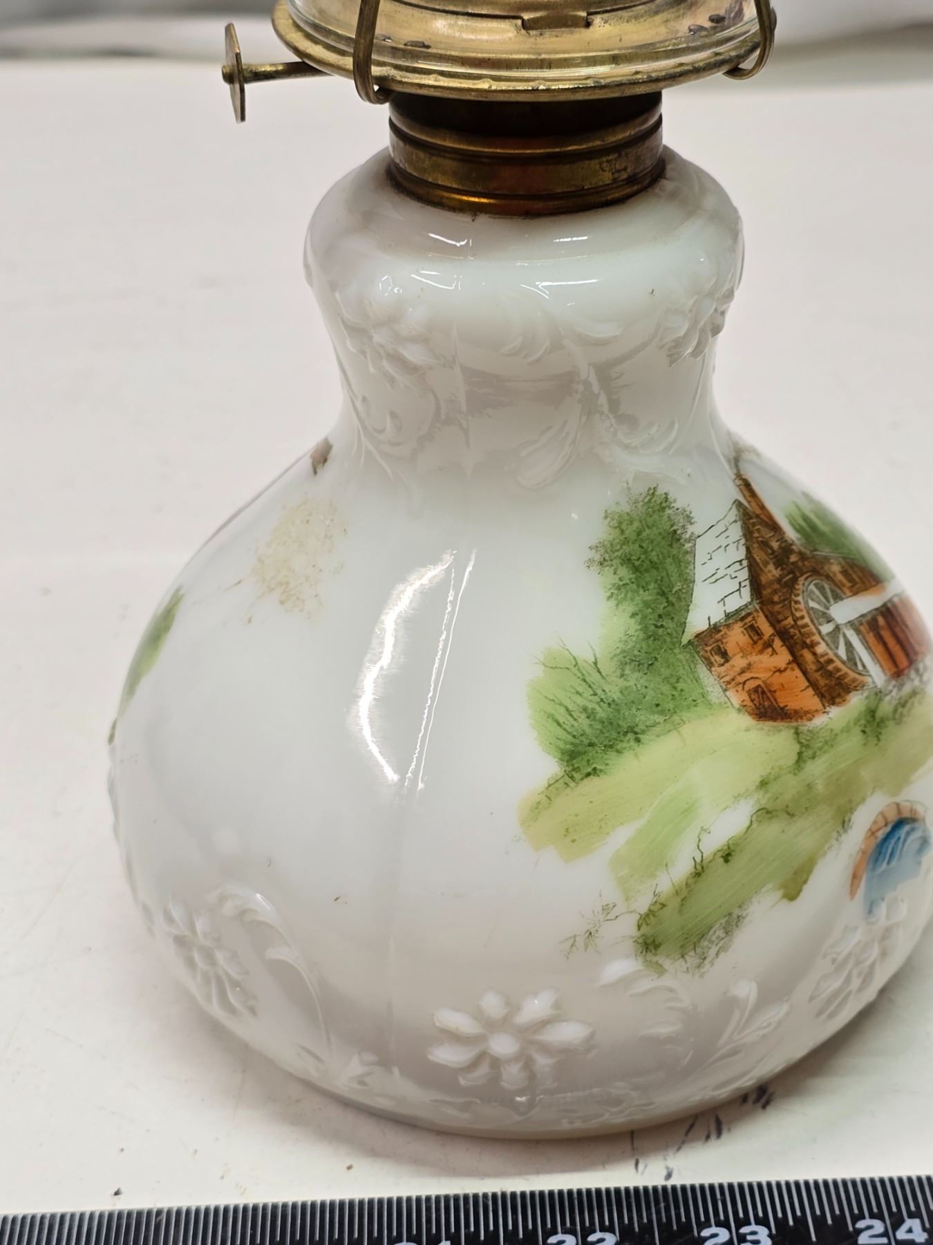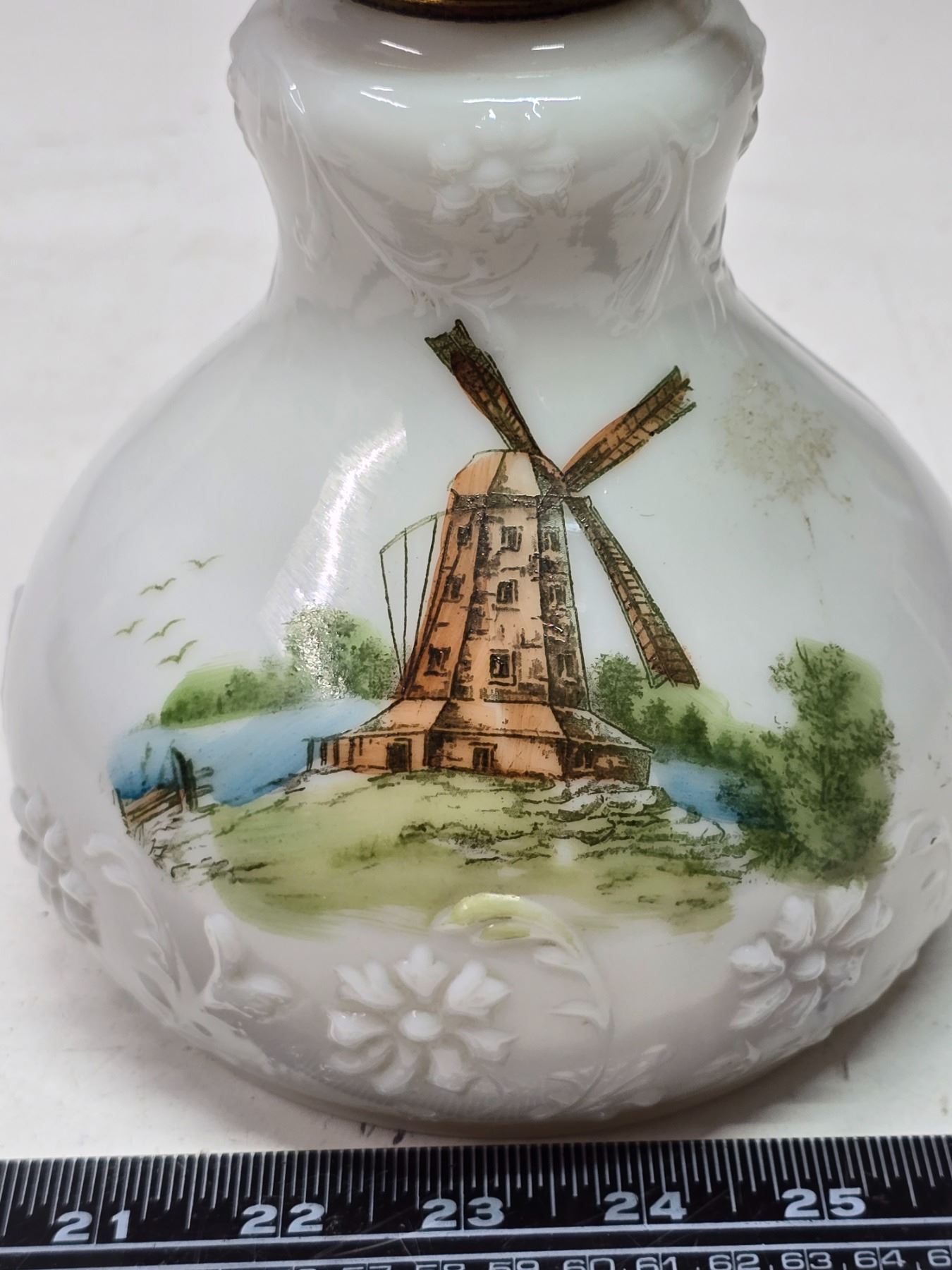 Milk glass oil lamp, w/ windmill & waterwheel painting on side - c/w chimney - 15"H