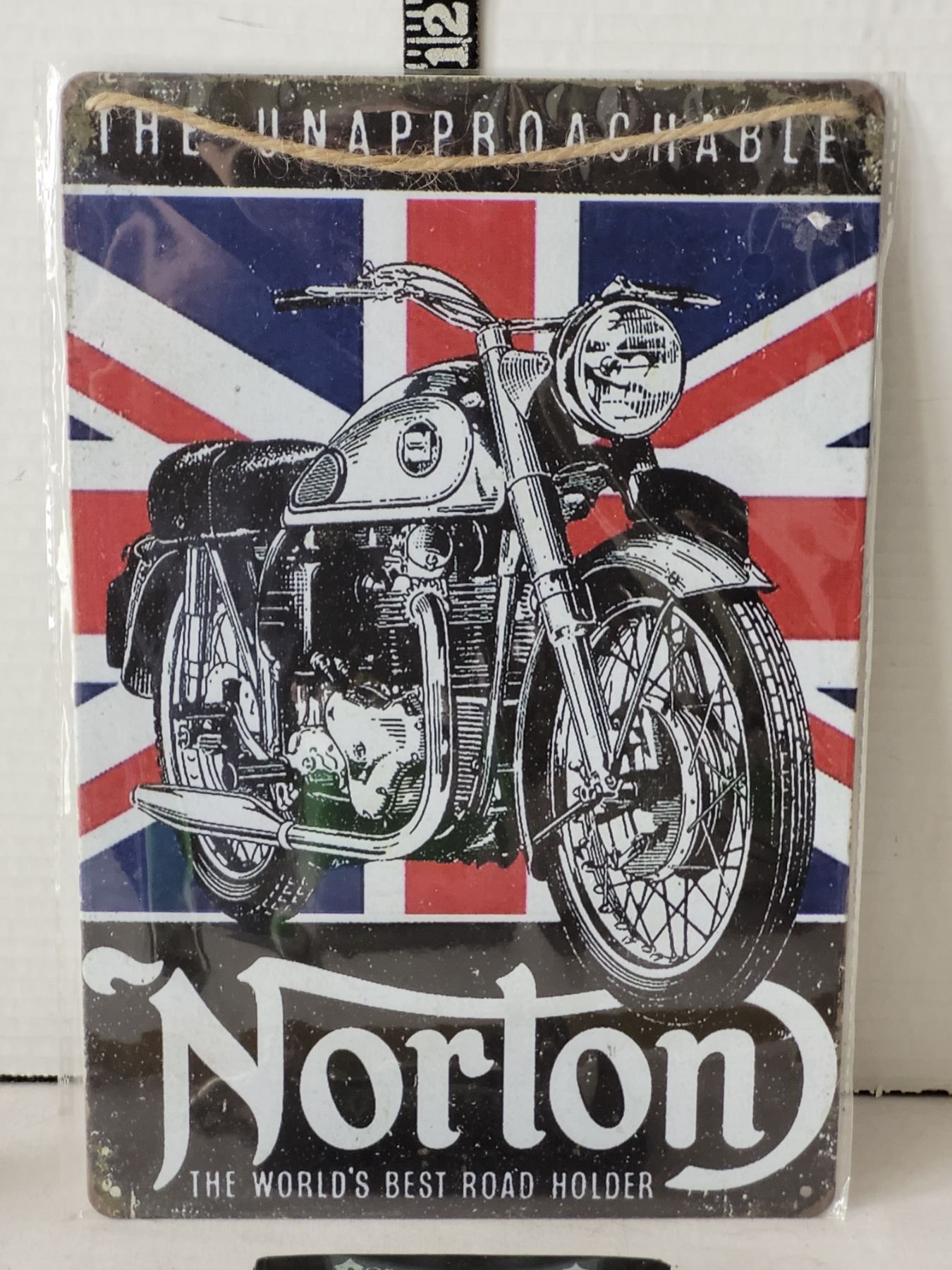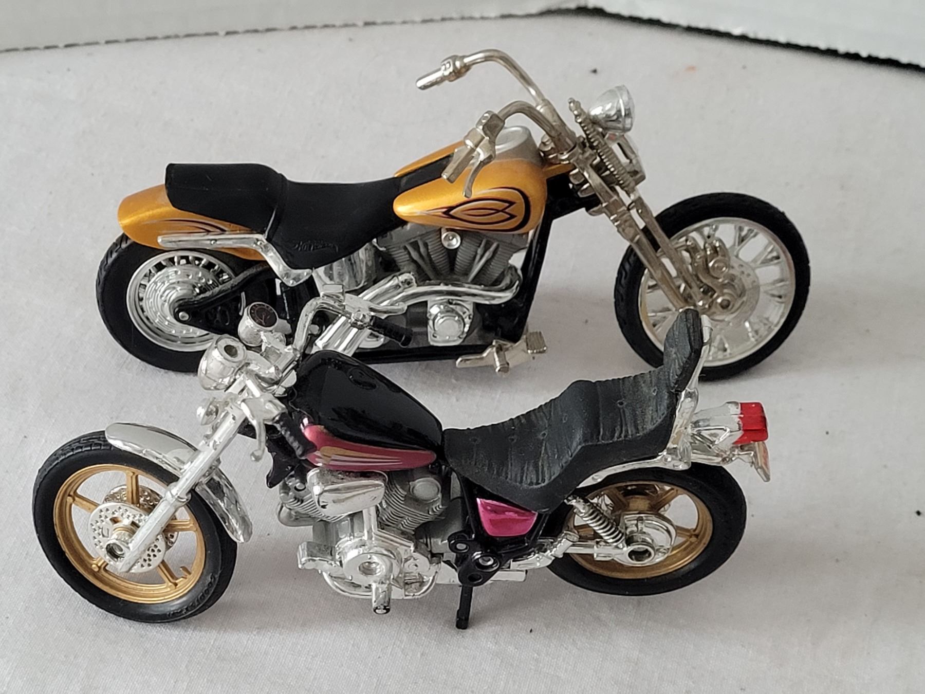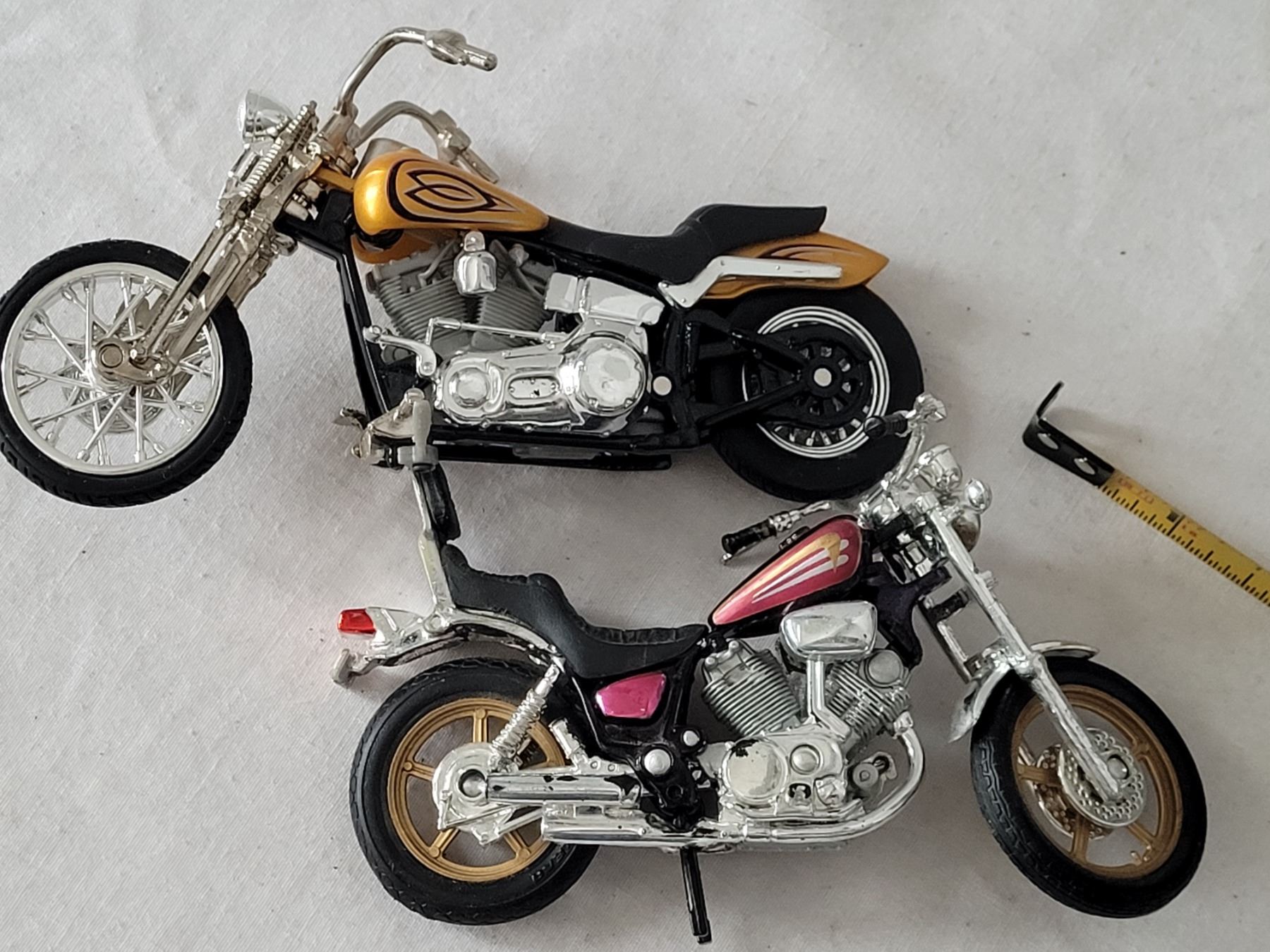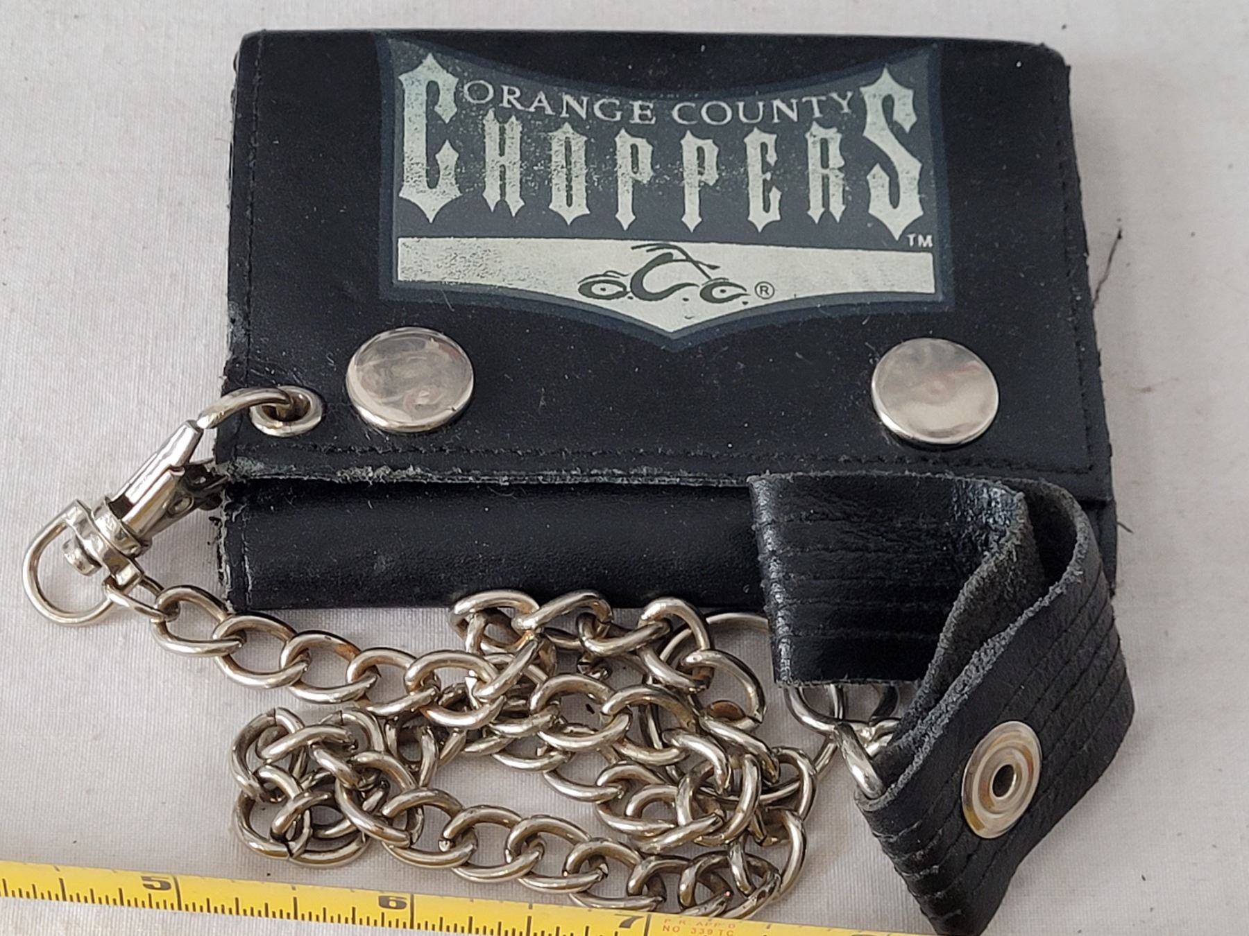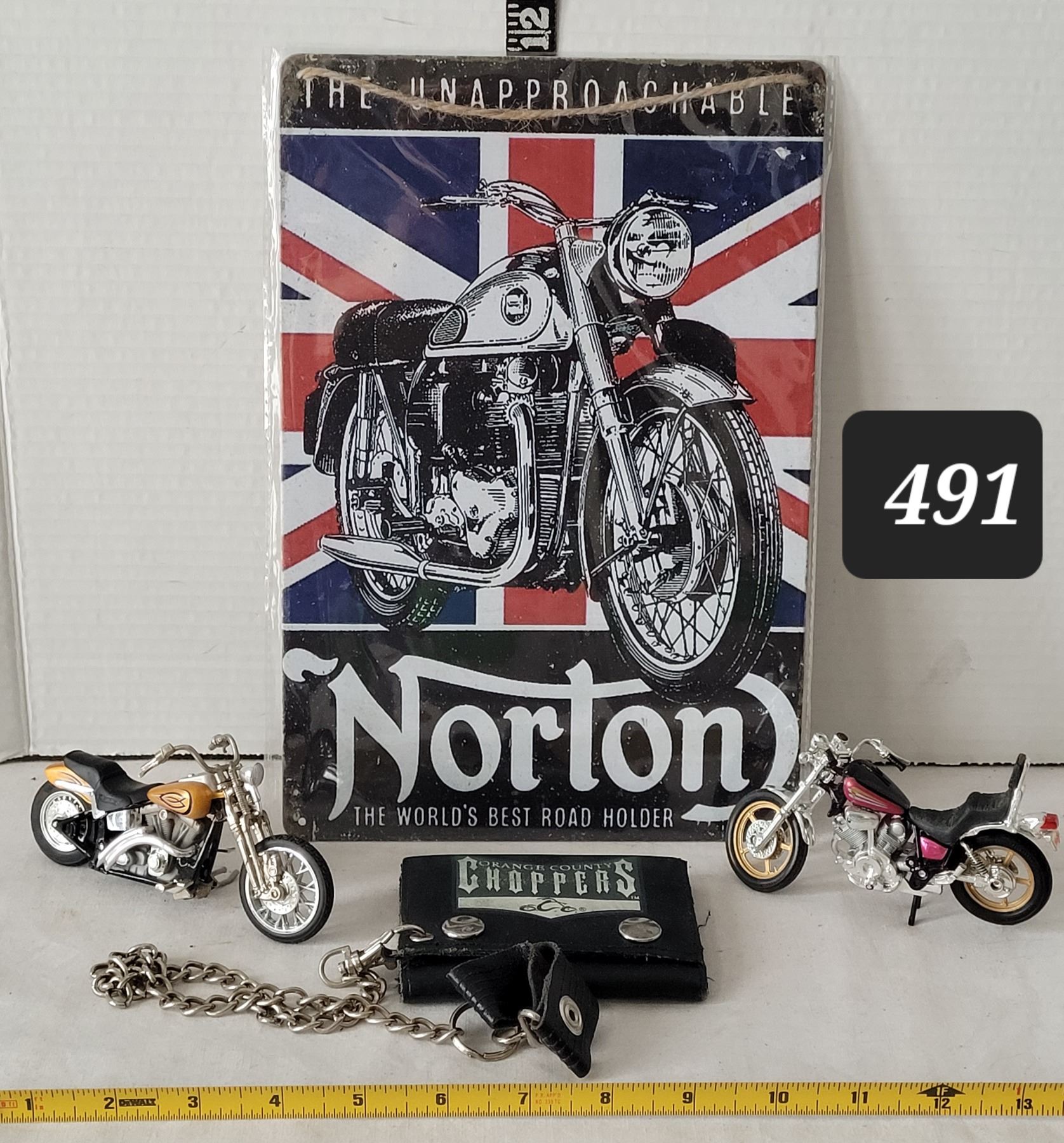 Miniature motor bikes, tin sign & Orange County Chopper chained belt wallet.