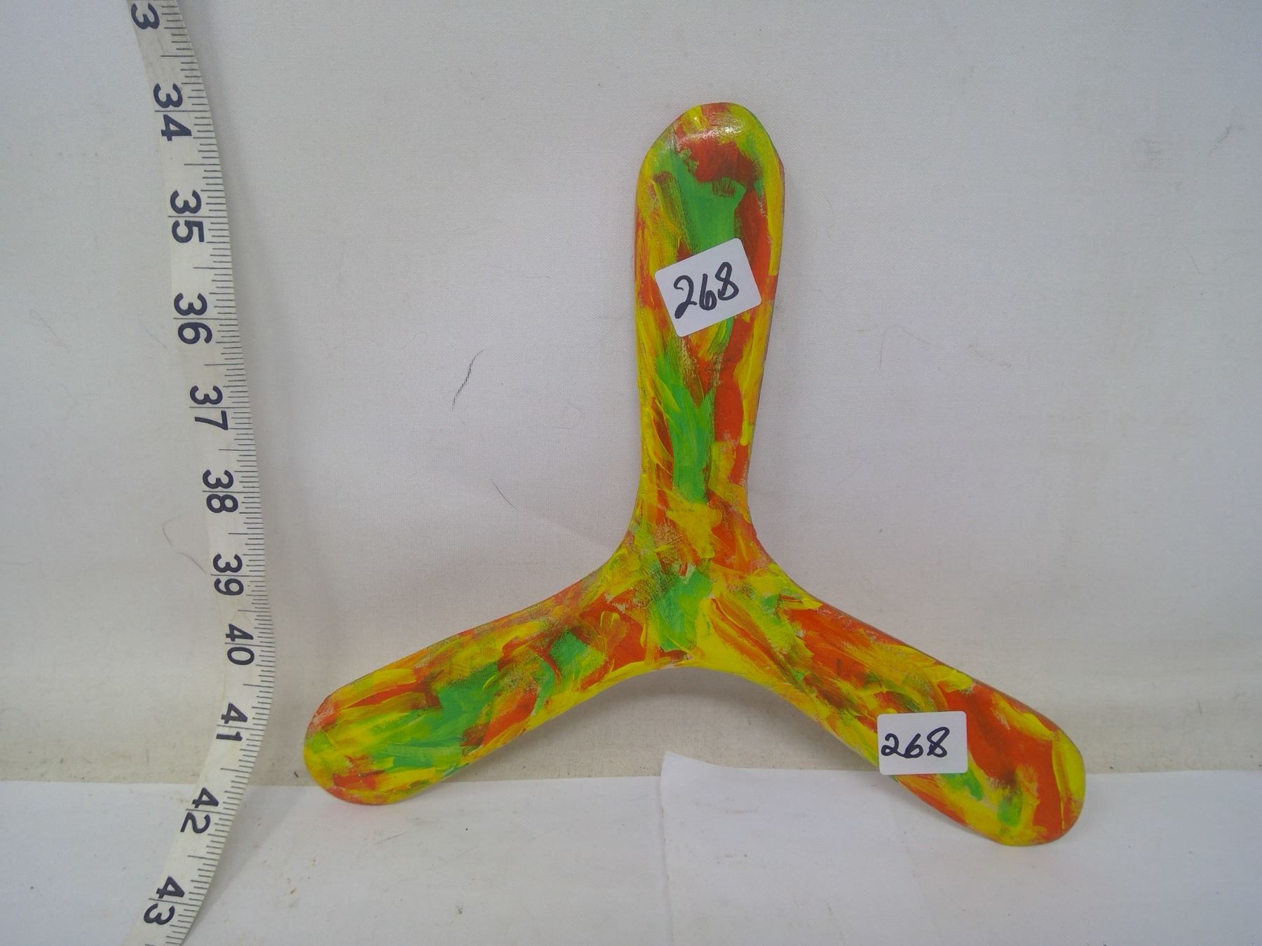 “Minitripale” 3-blade boomerang. French design. Span: 9”. Range: 20 meters. Accurate, good for youth, workable in low wind. Baltic birch laminate. Right hander.