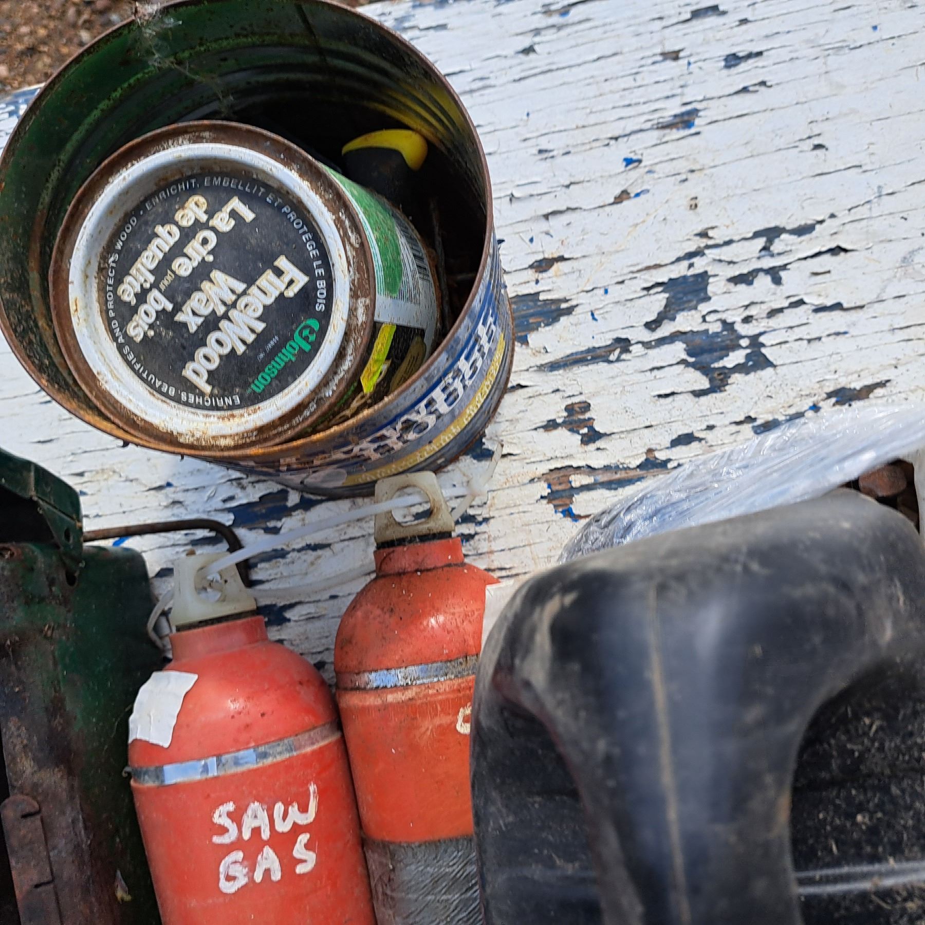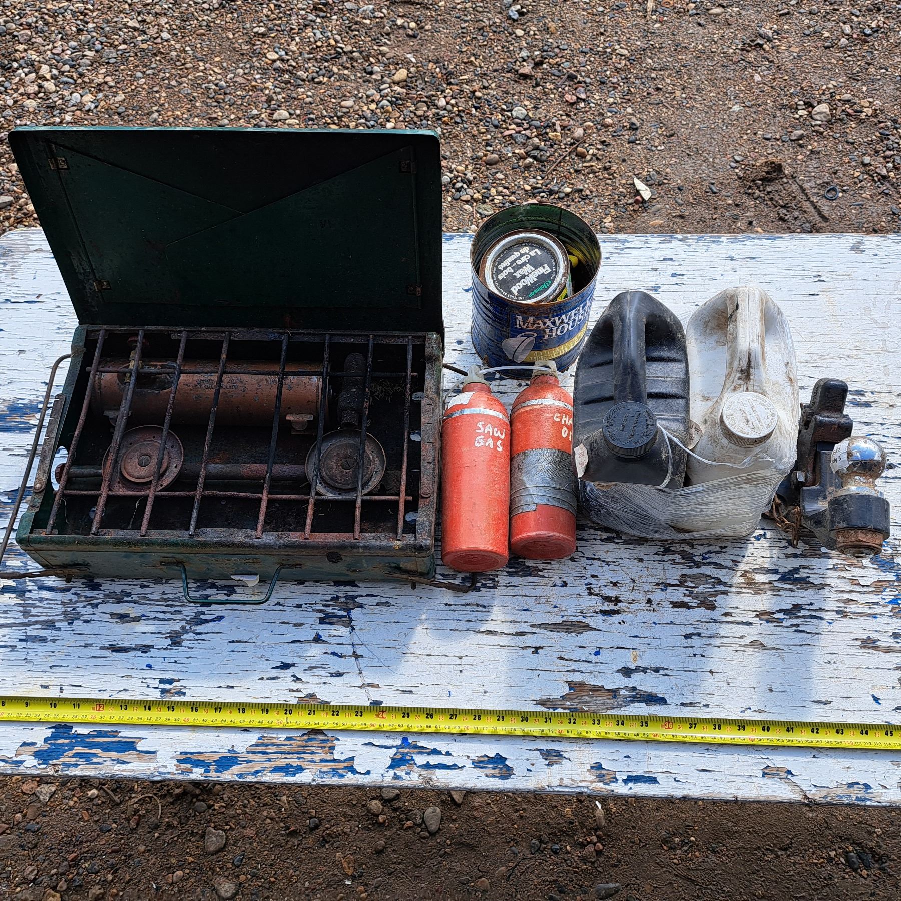 Mis items- propane stove, chain oil and saw gas, ball hitch