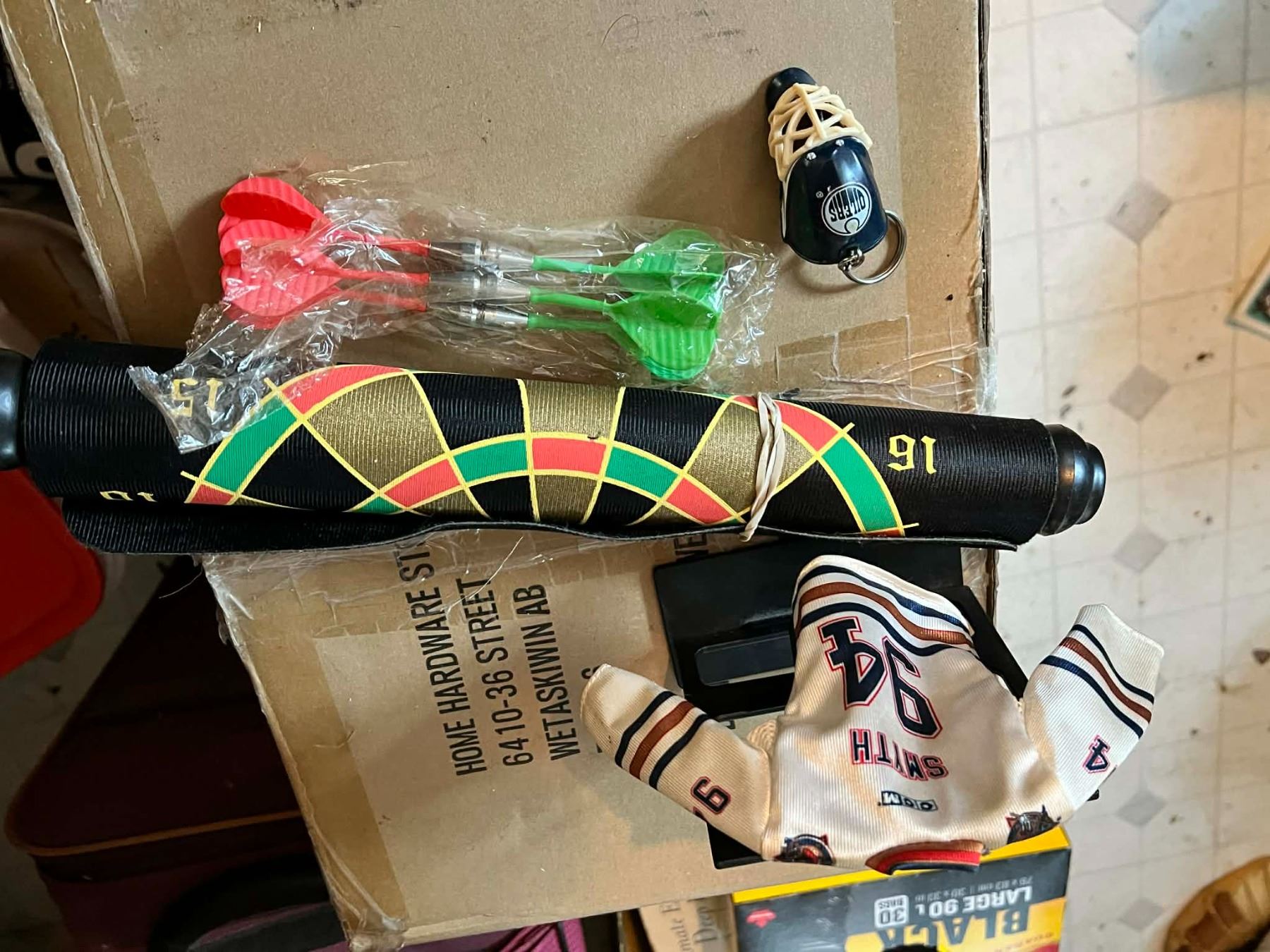Misc Items Hockey Jersey on stand, Oilers Key ring, and hanging Dart board.