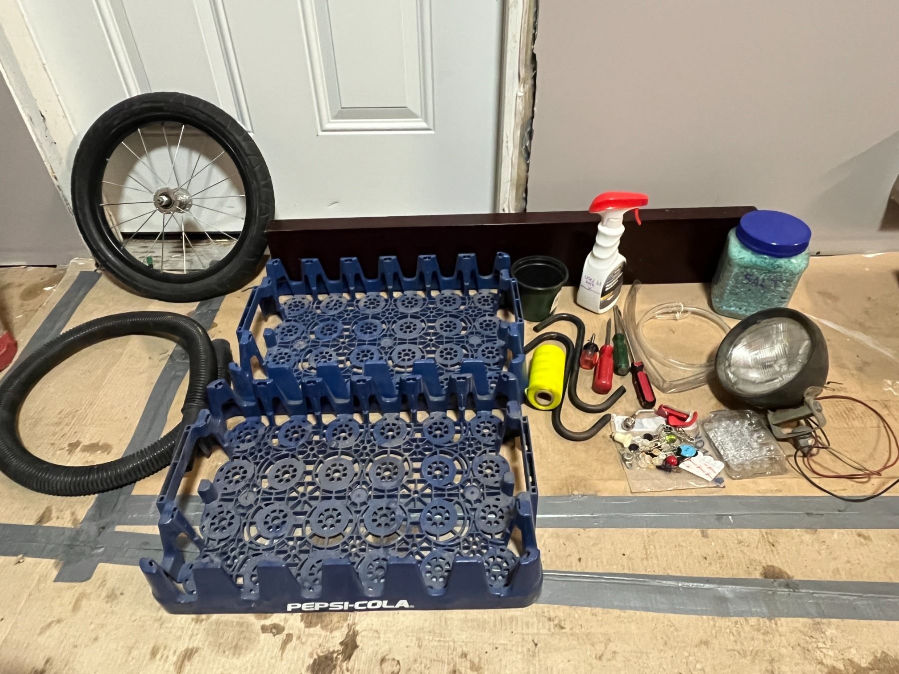 Misc. Tub - Floating shelf, tire, hooks, salt, artificial sinew