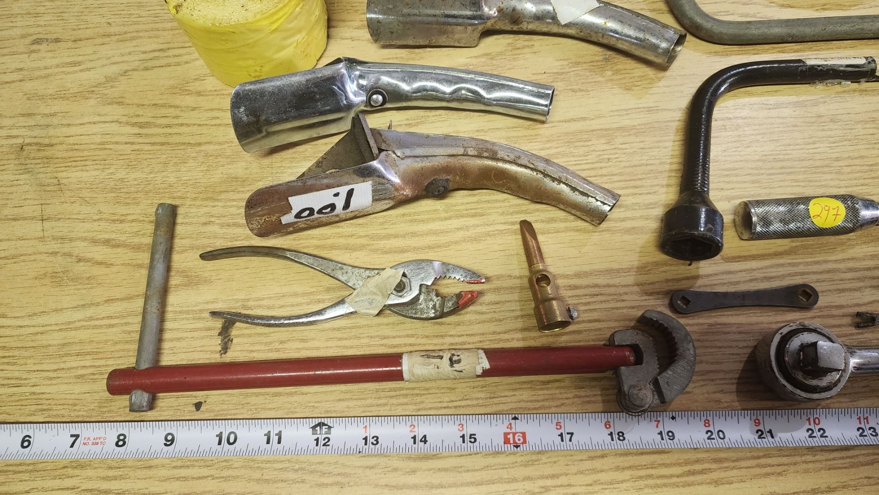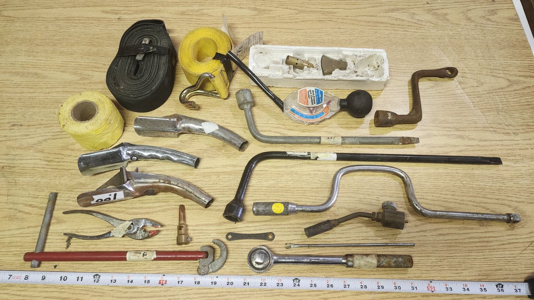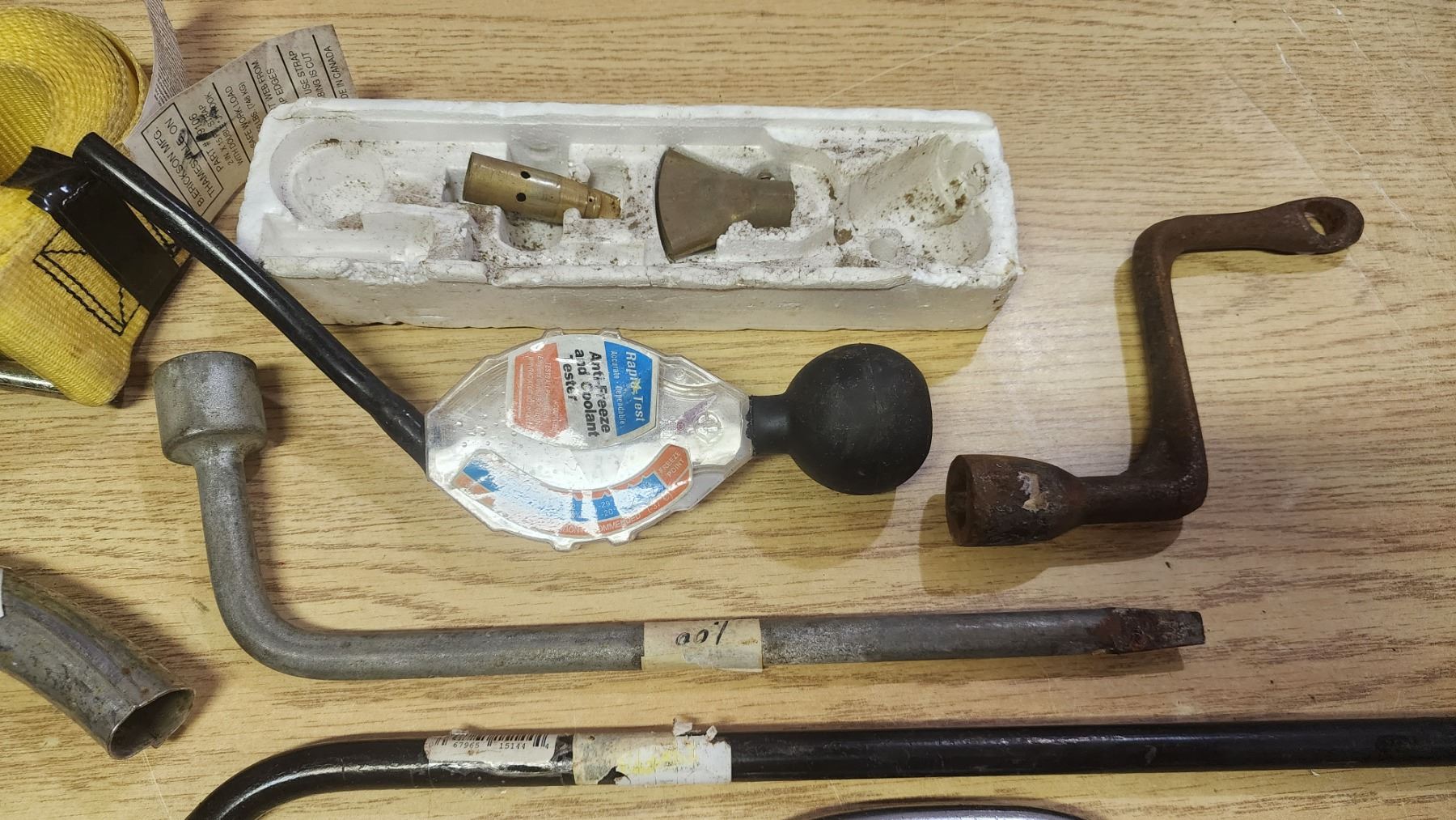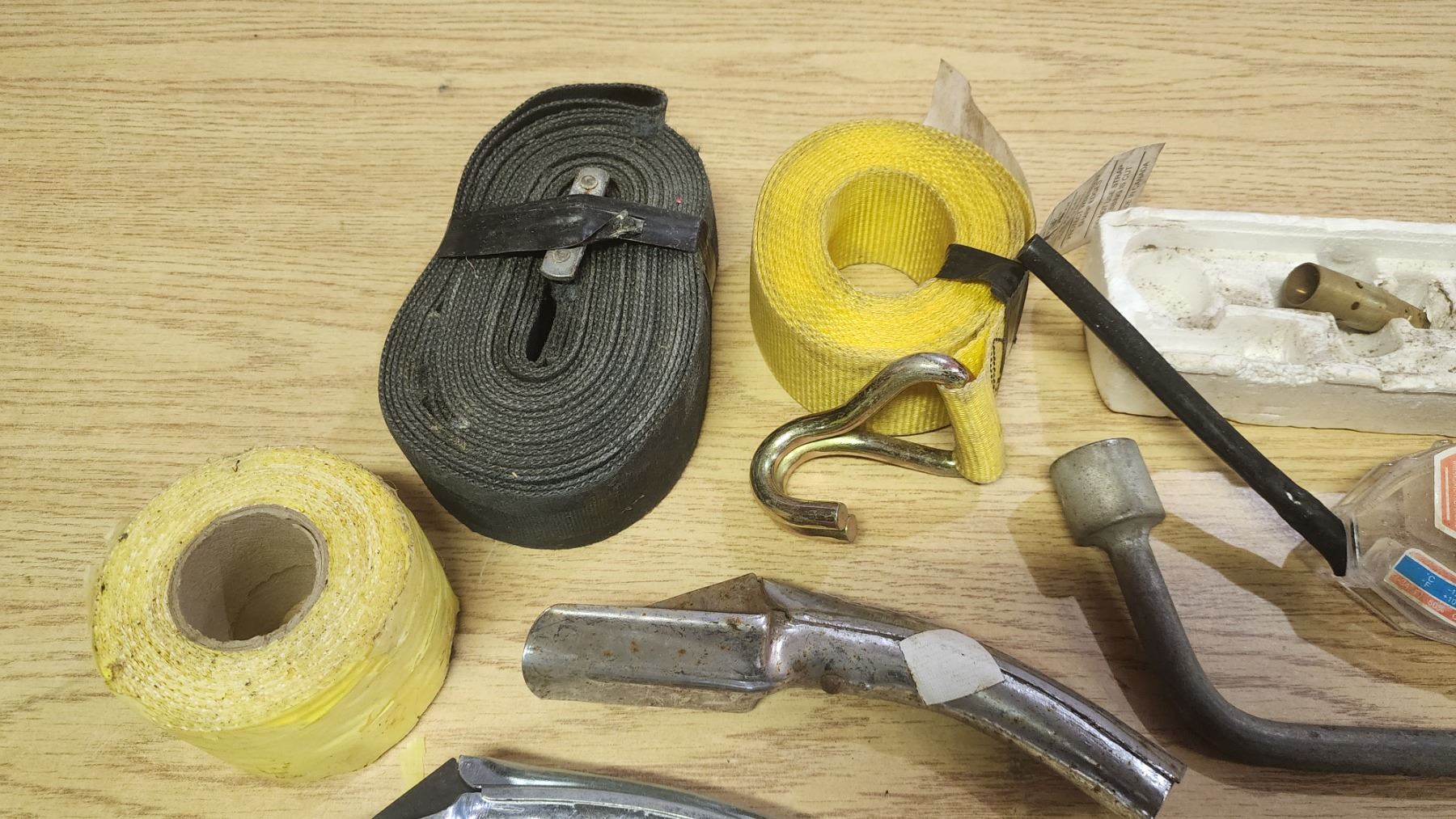 Misc. Vehicle tools - Straps, tire irons, jerry can spouts, wrench, etc.