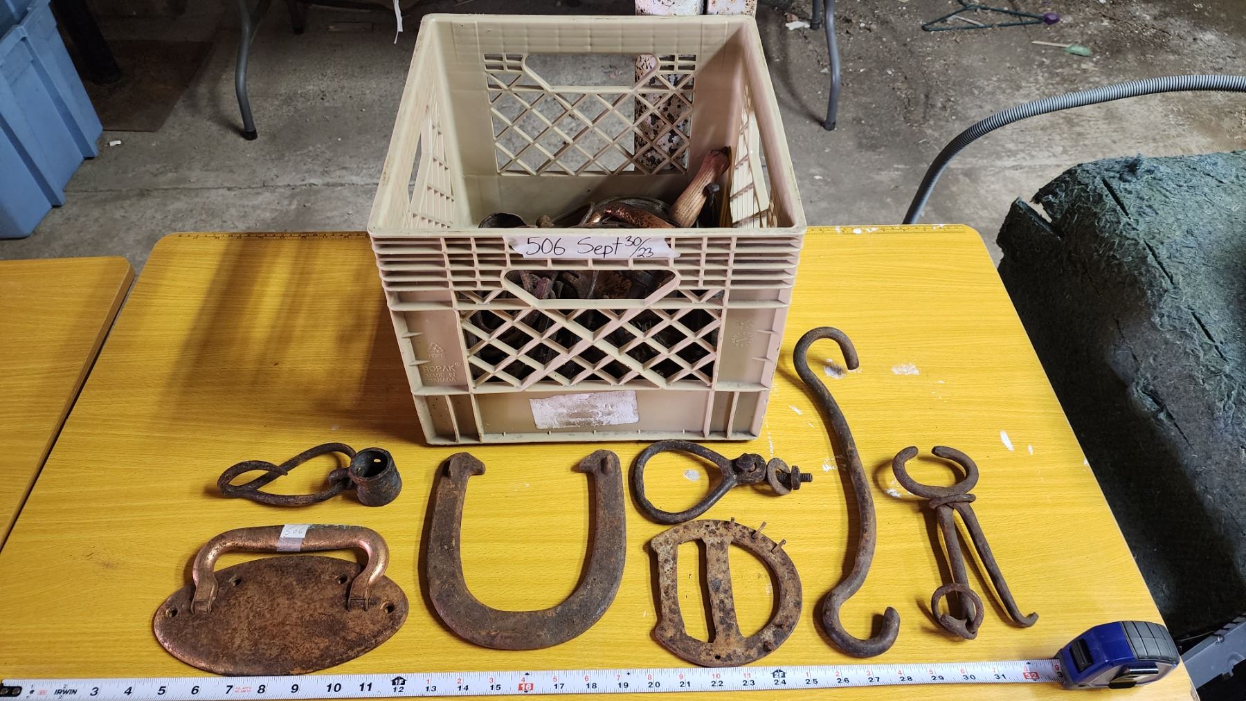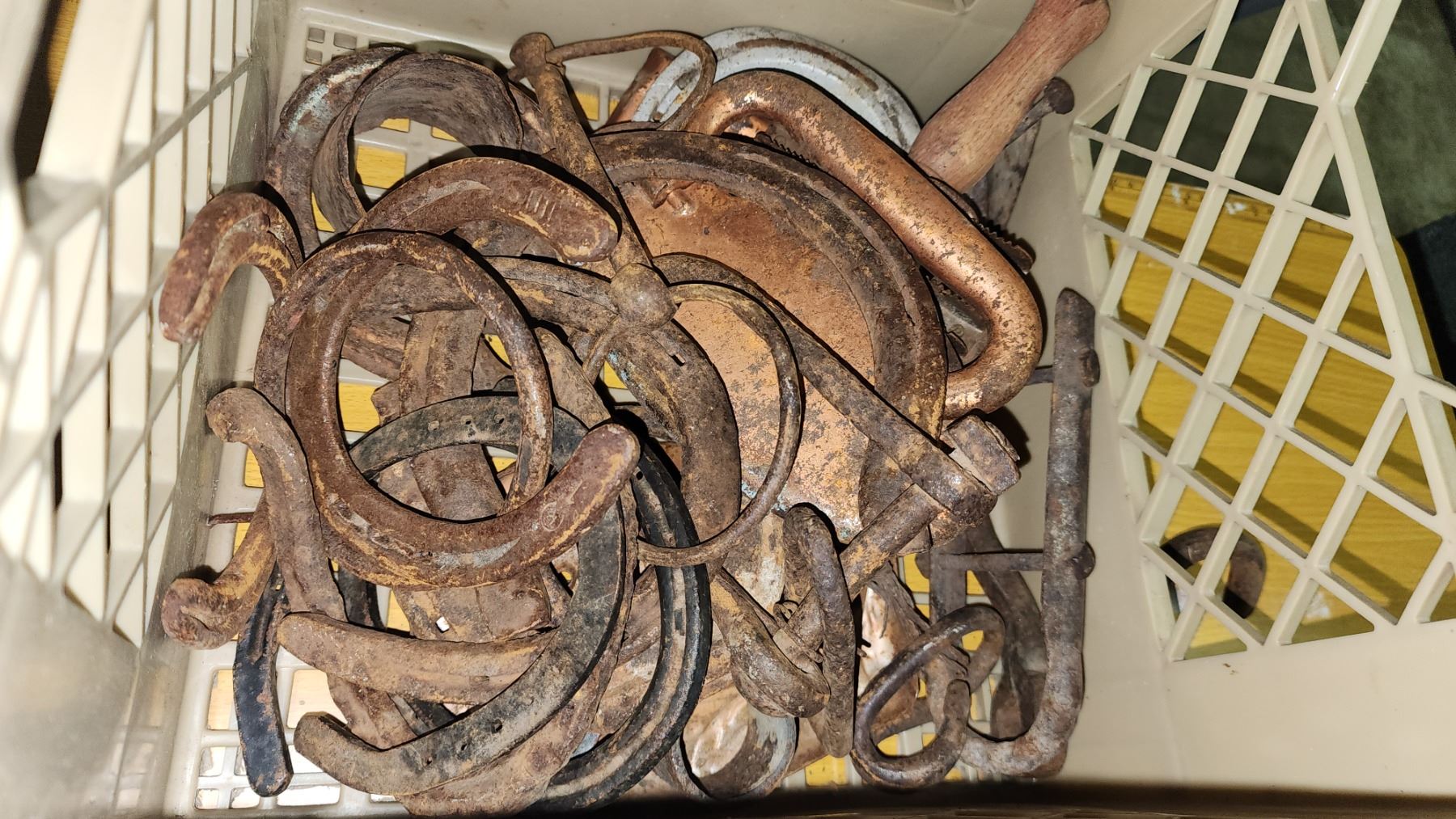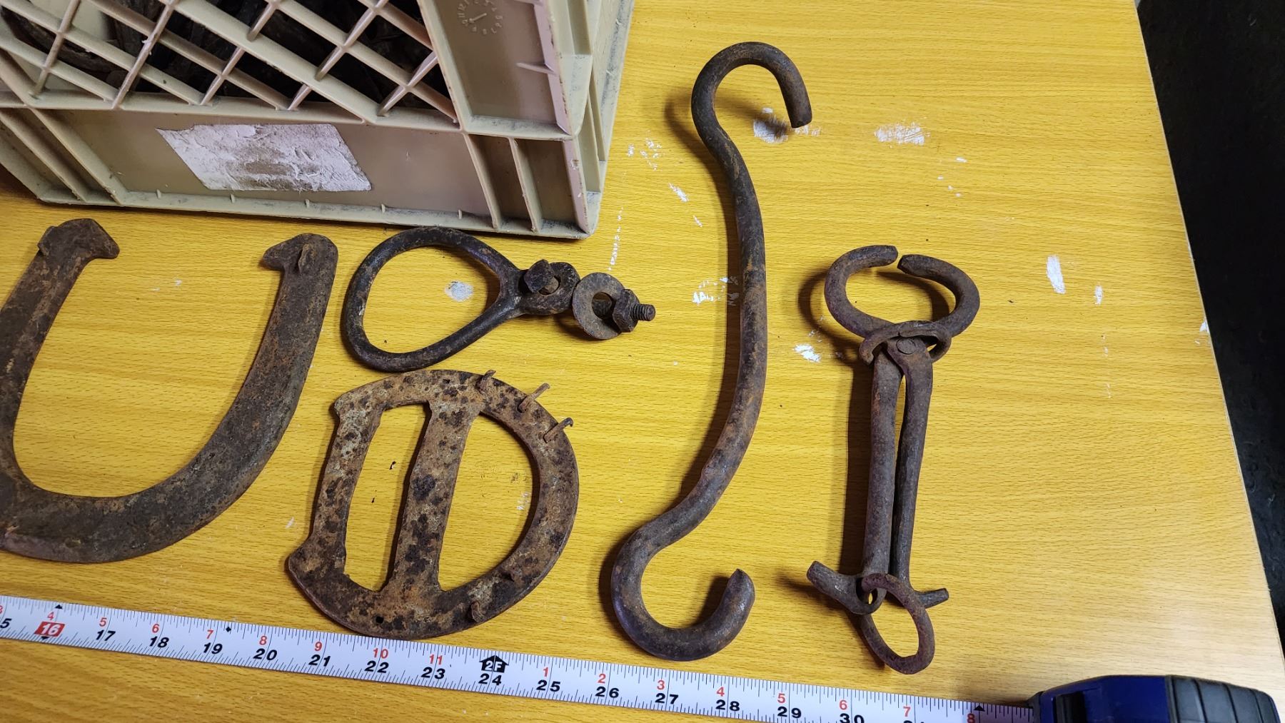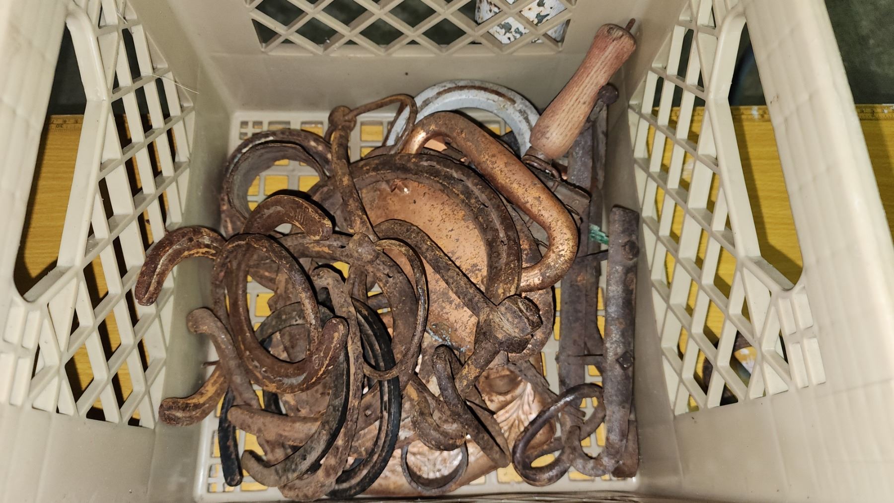 Misc antique cast iron pieces & copper - door handles, horse shoes, etc.