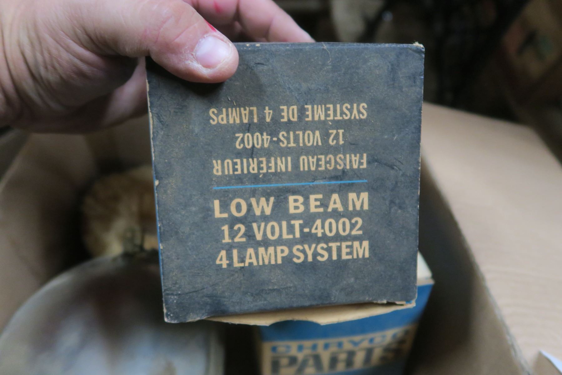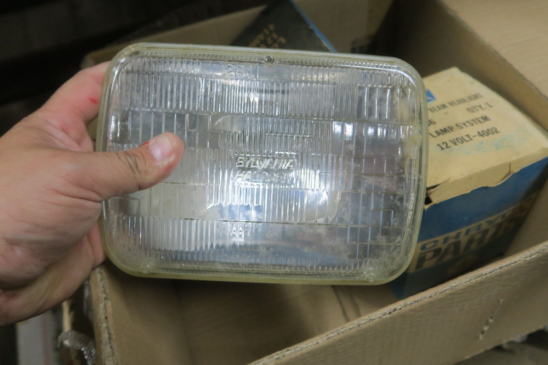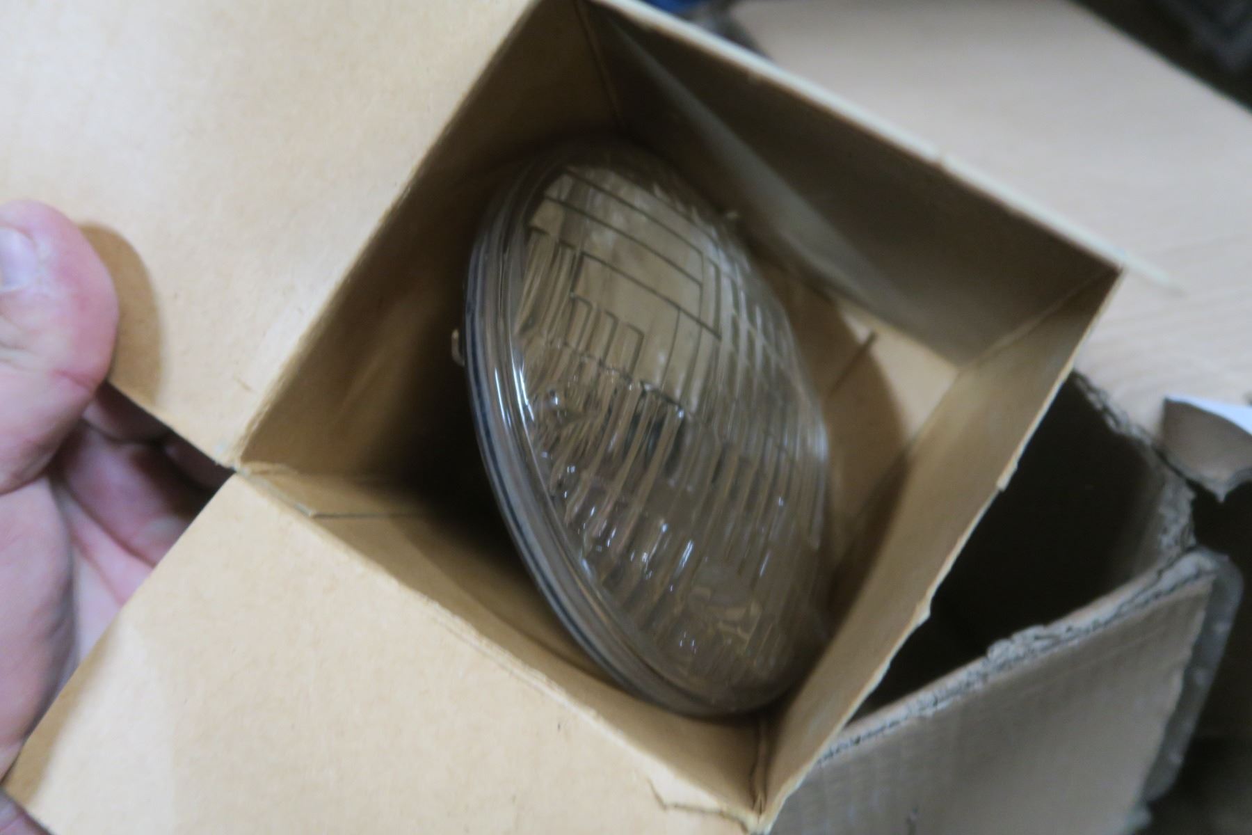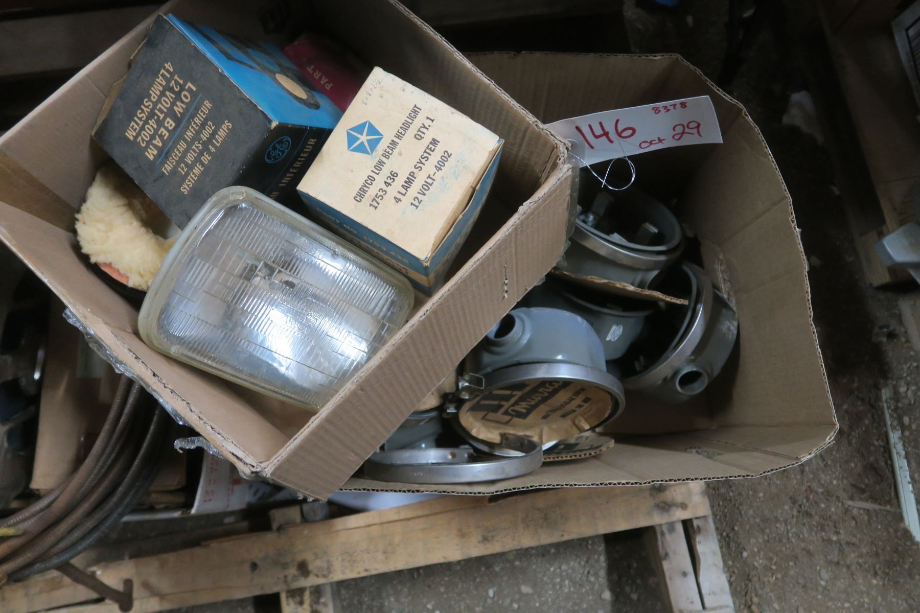 Misc box of electrical items, varous headlights, round fuse boxes.