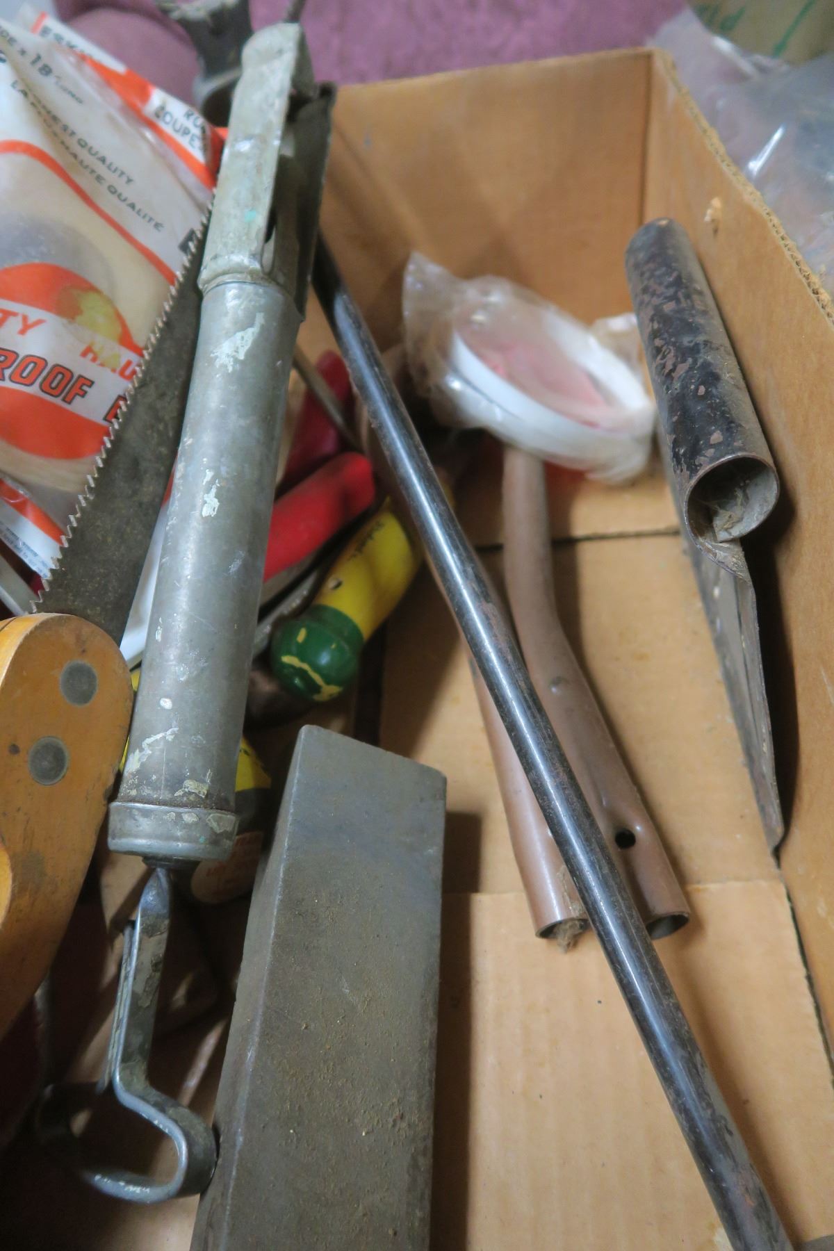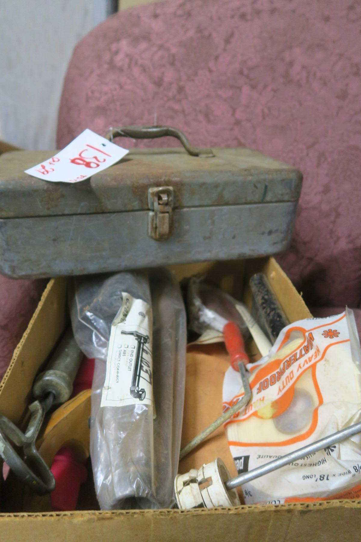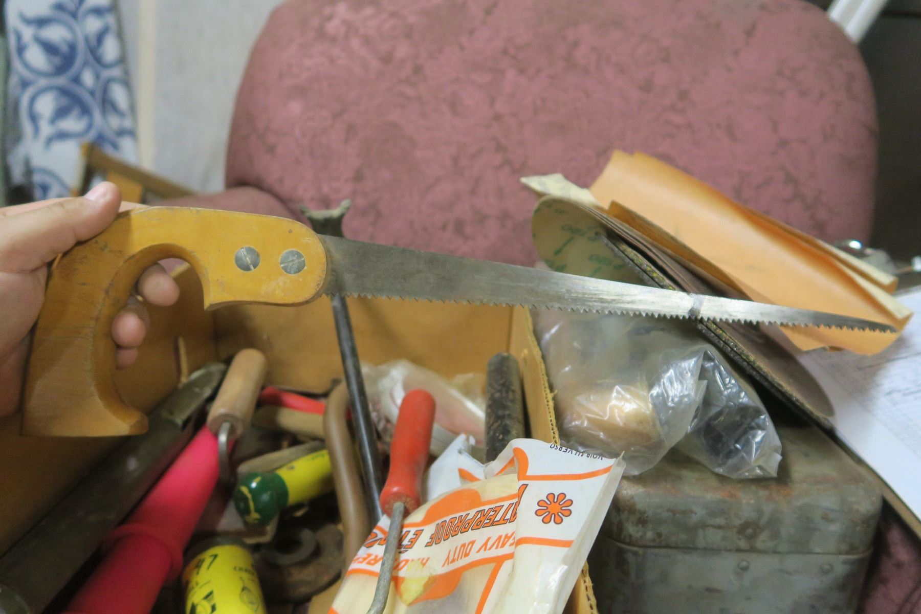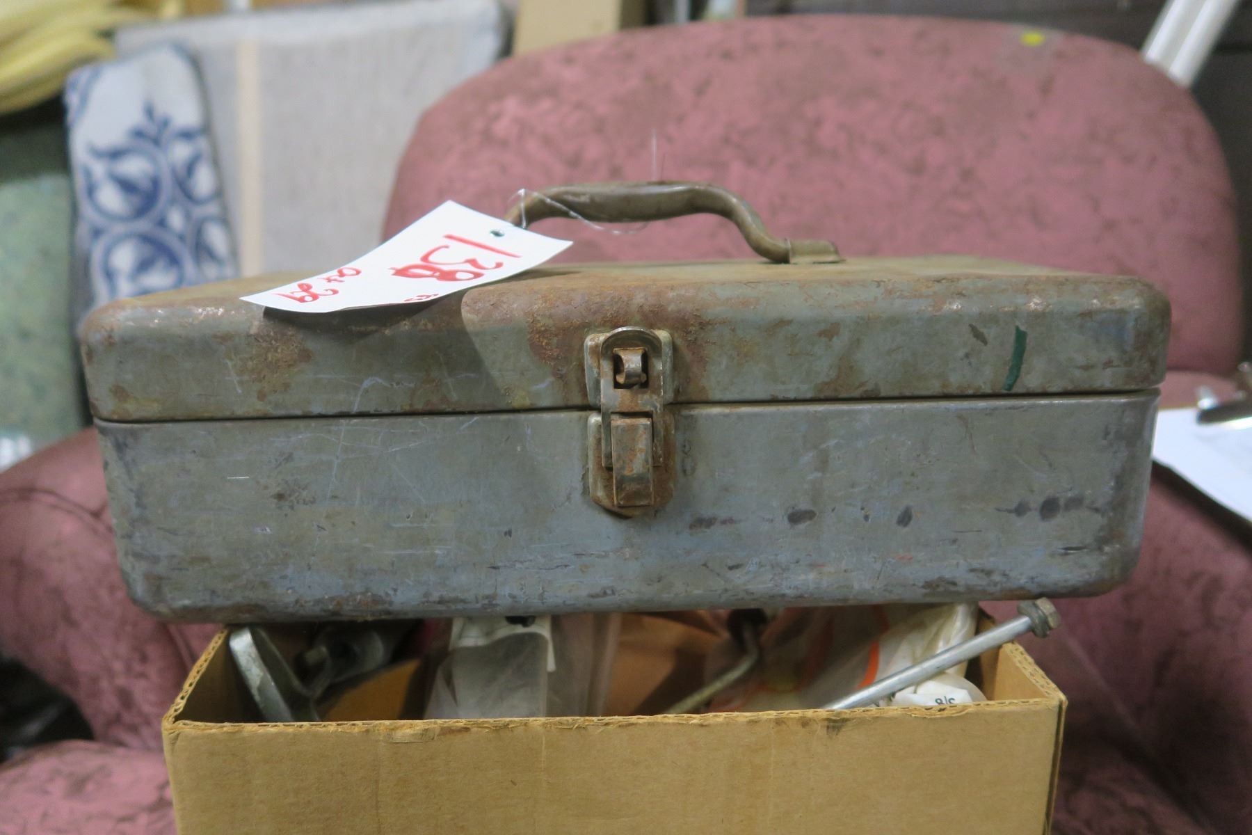 Misc box of tools & other items. Metal tool box, painting items, hand saw ..etc