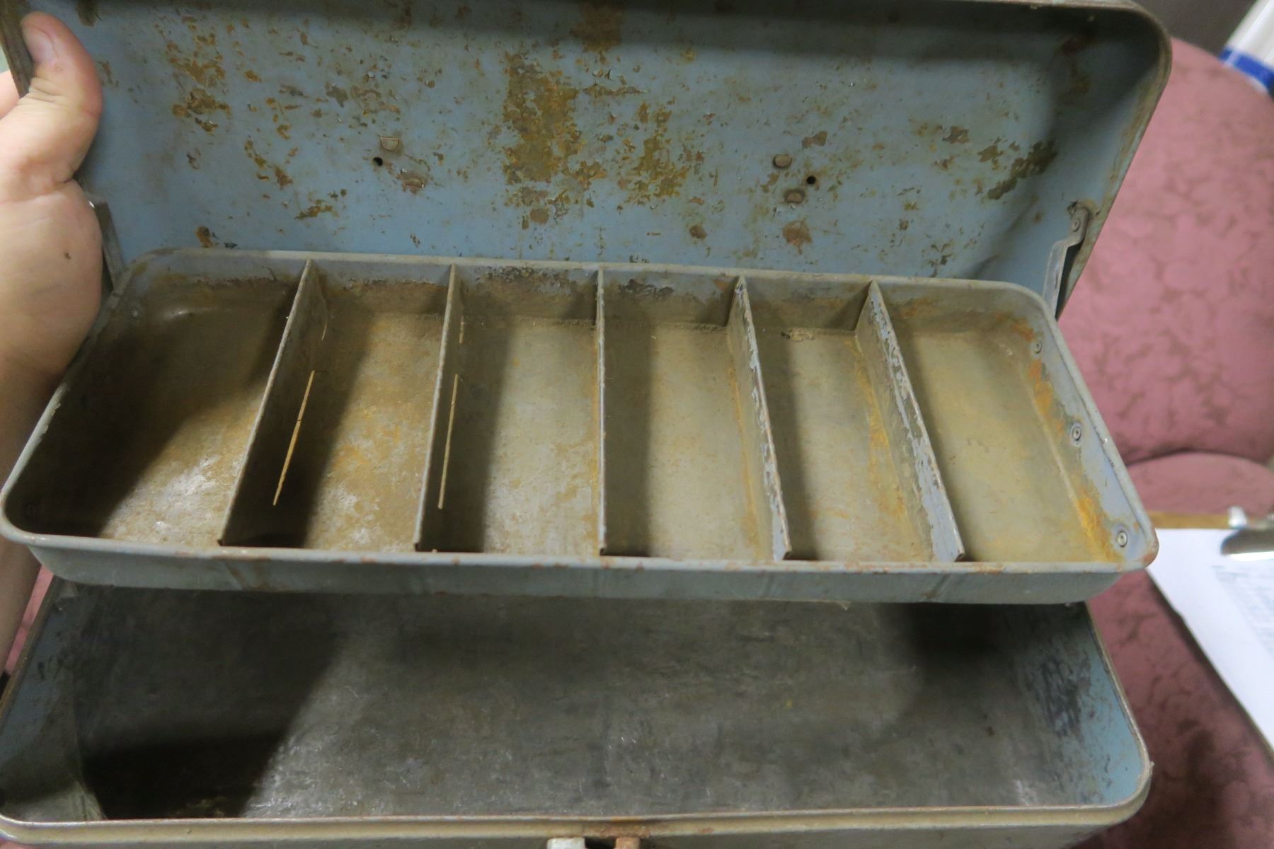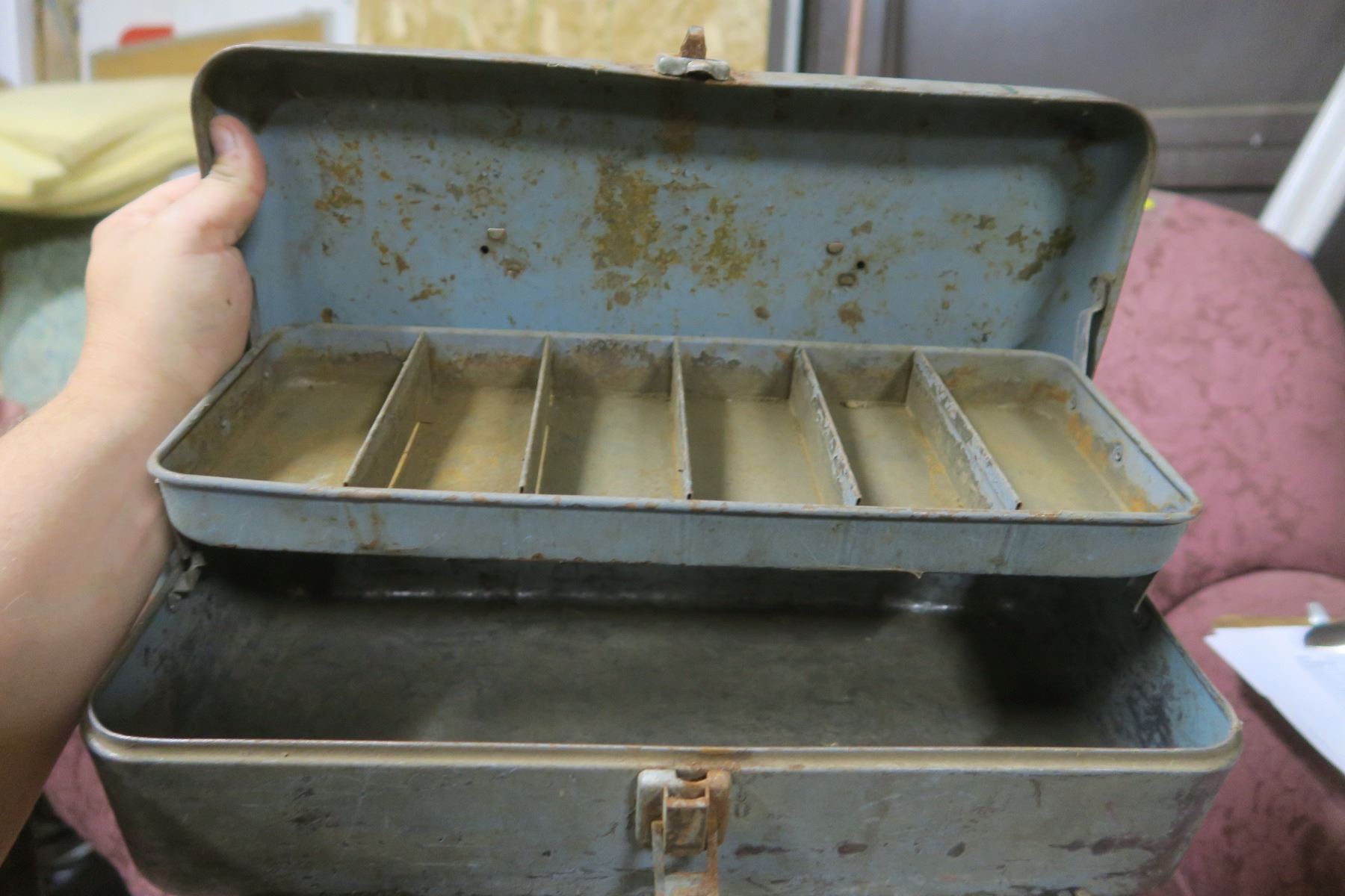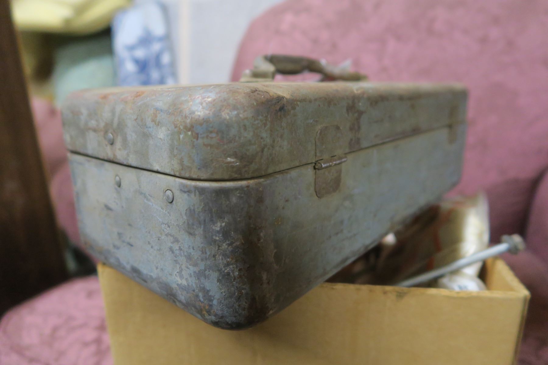 Misc box of tools & other items. Metal tool box, painting items, hand saw ..etc