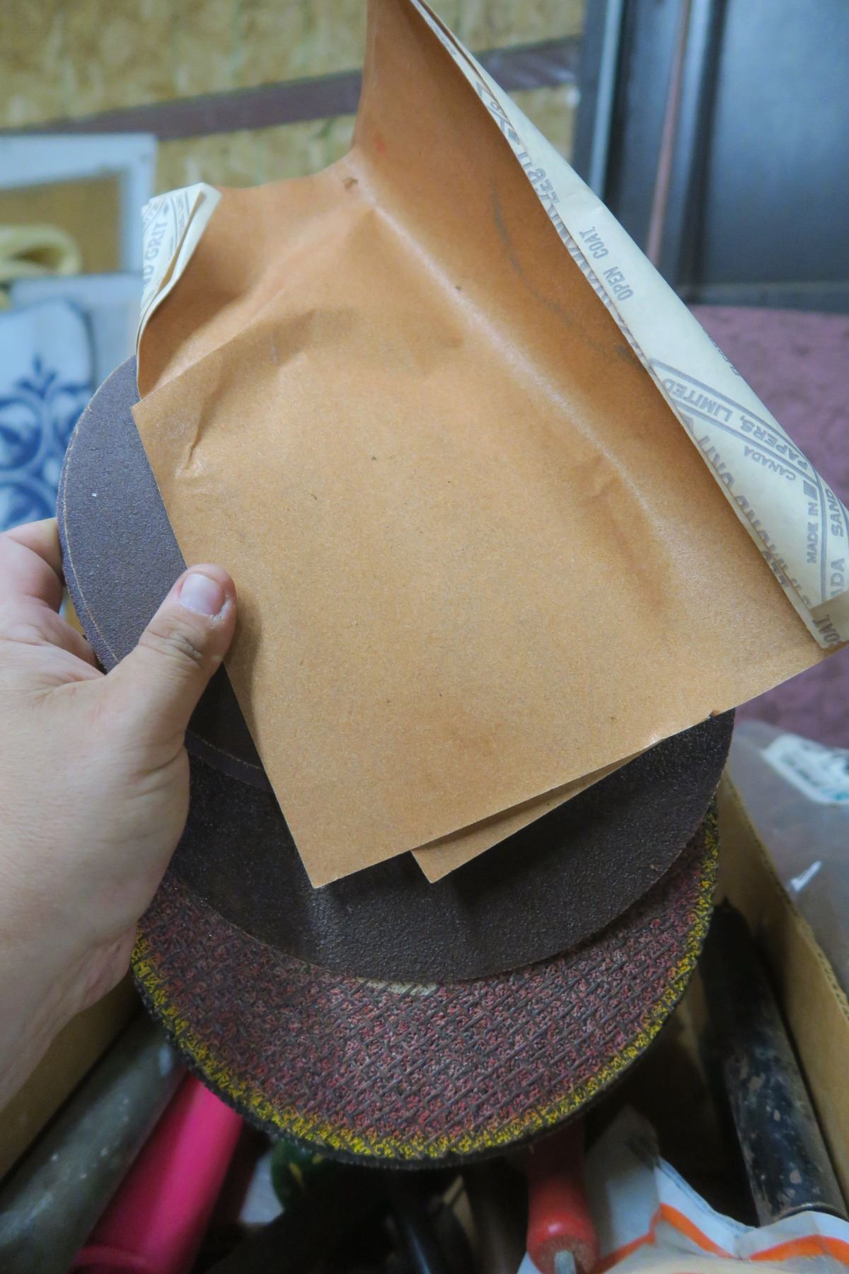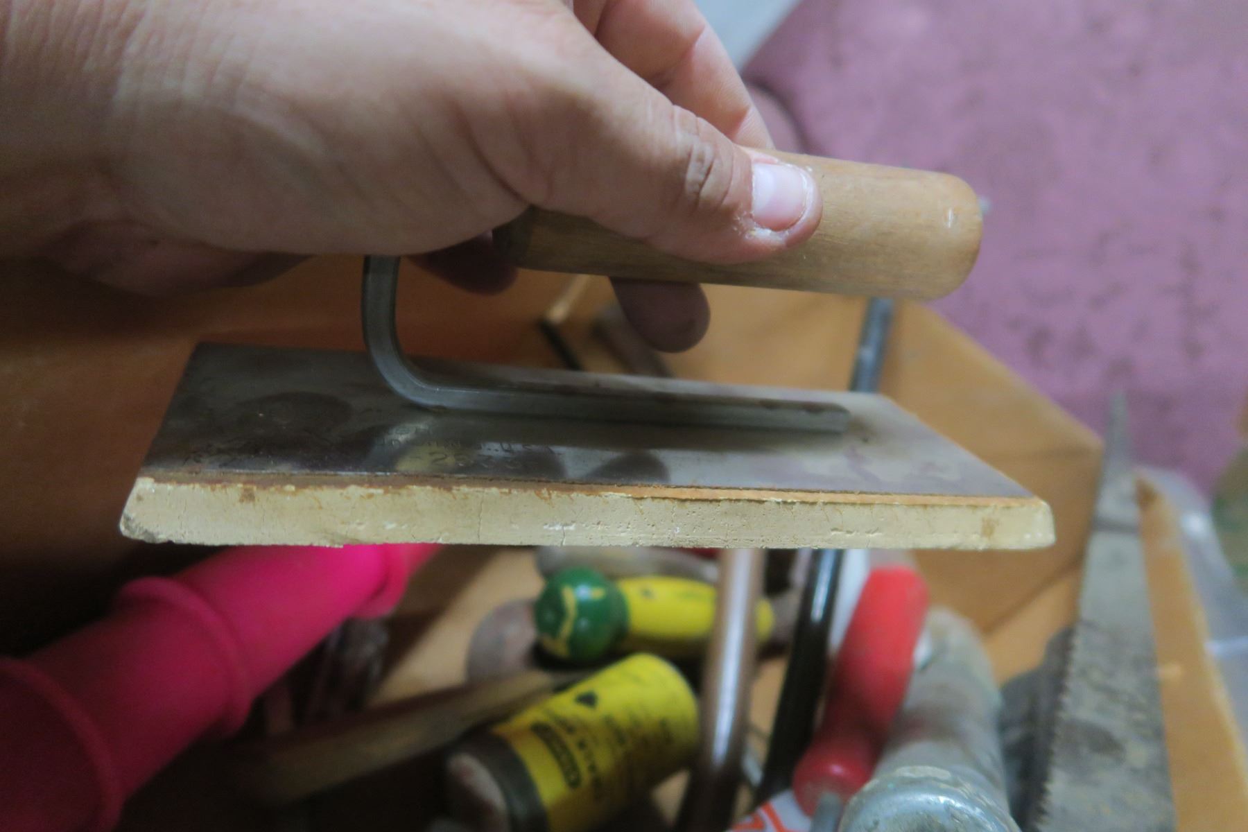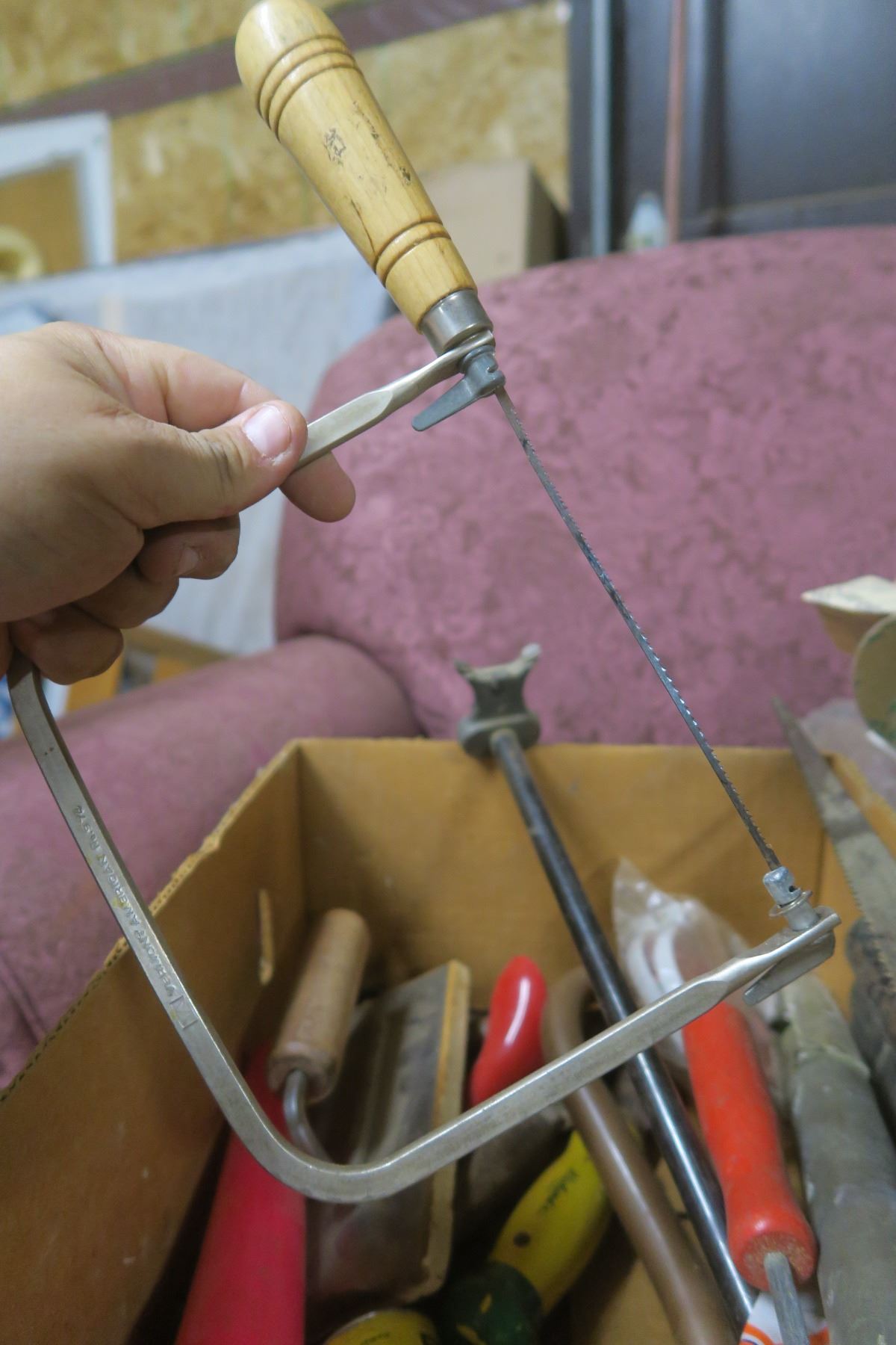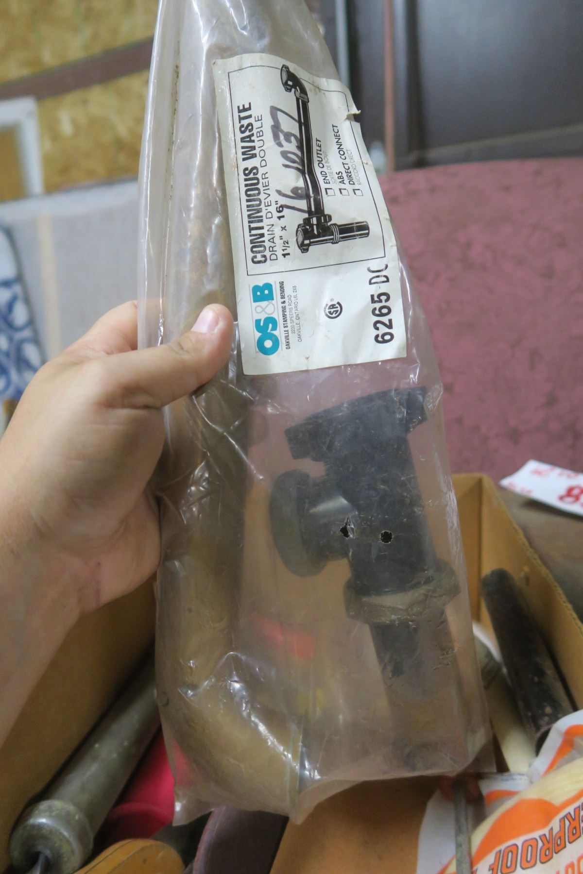 Misc box of tools & other items. Metal tool box, painting items, hand saw ..etc