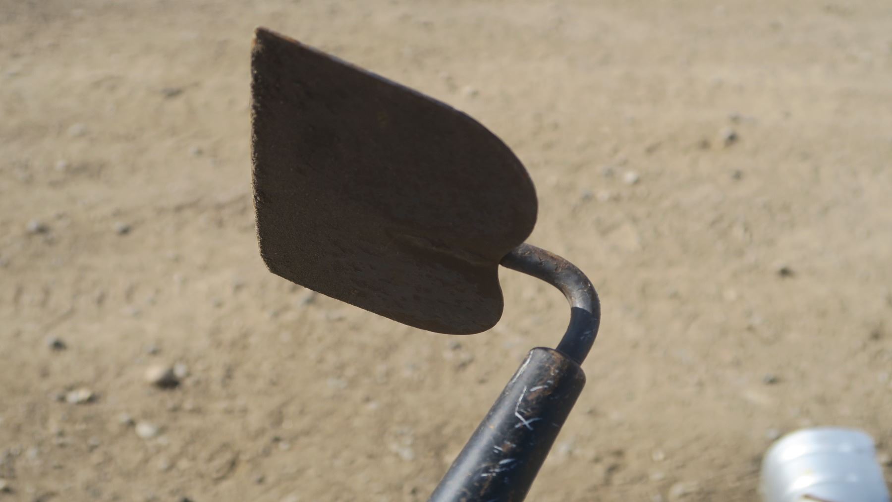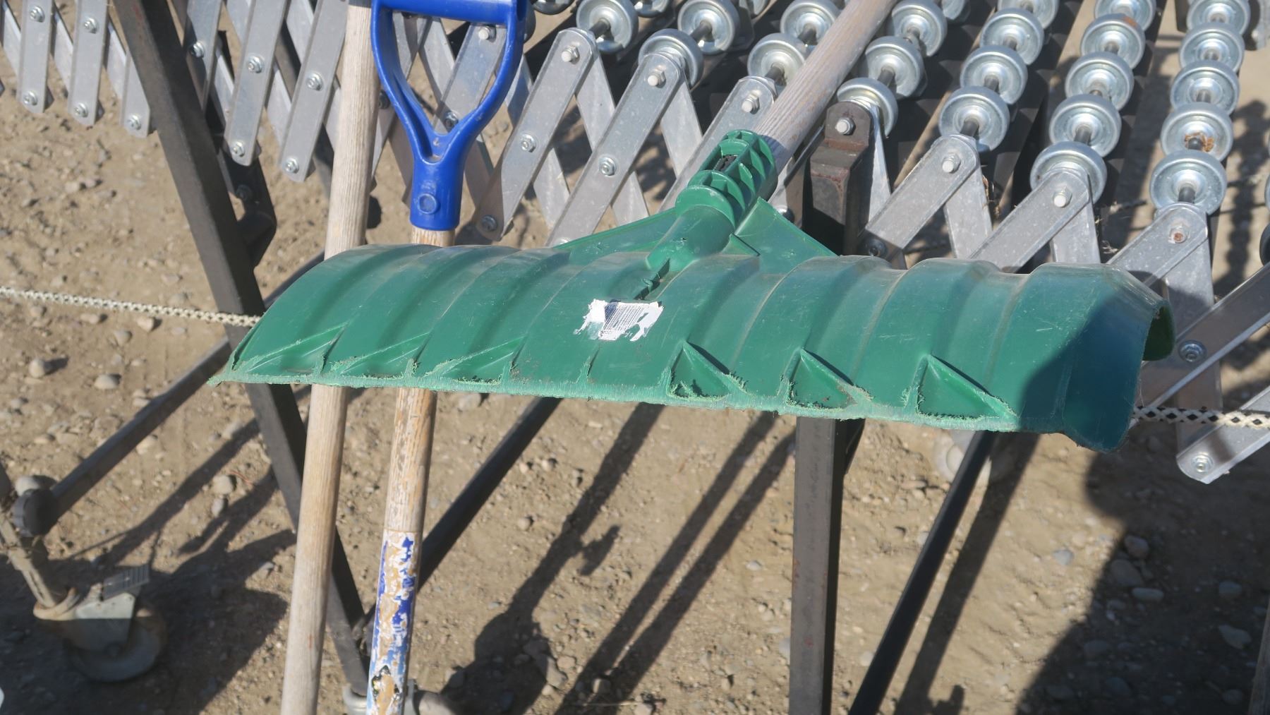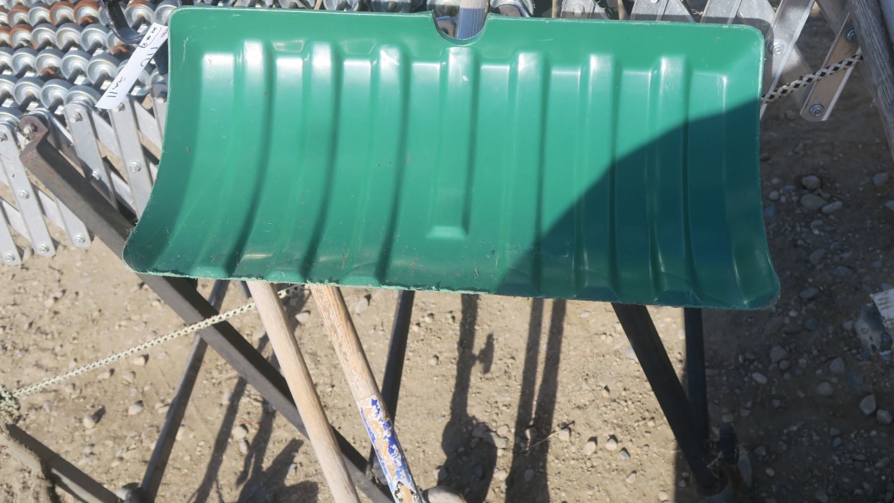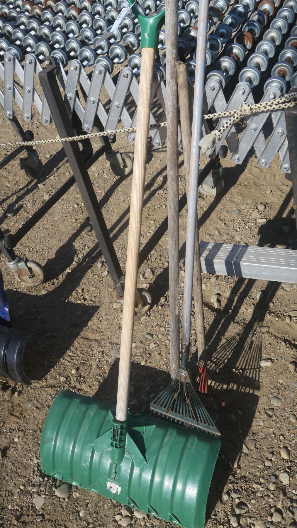 Misc. garden tool lot, hoe, fan rake, snow shovel , weeder