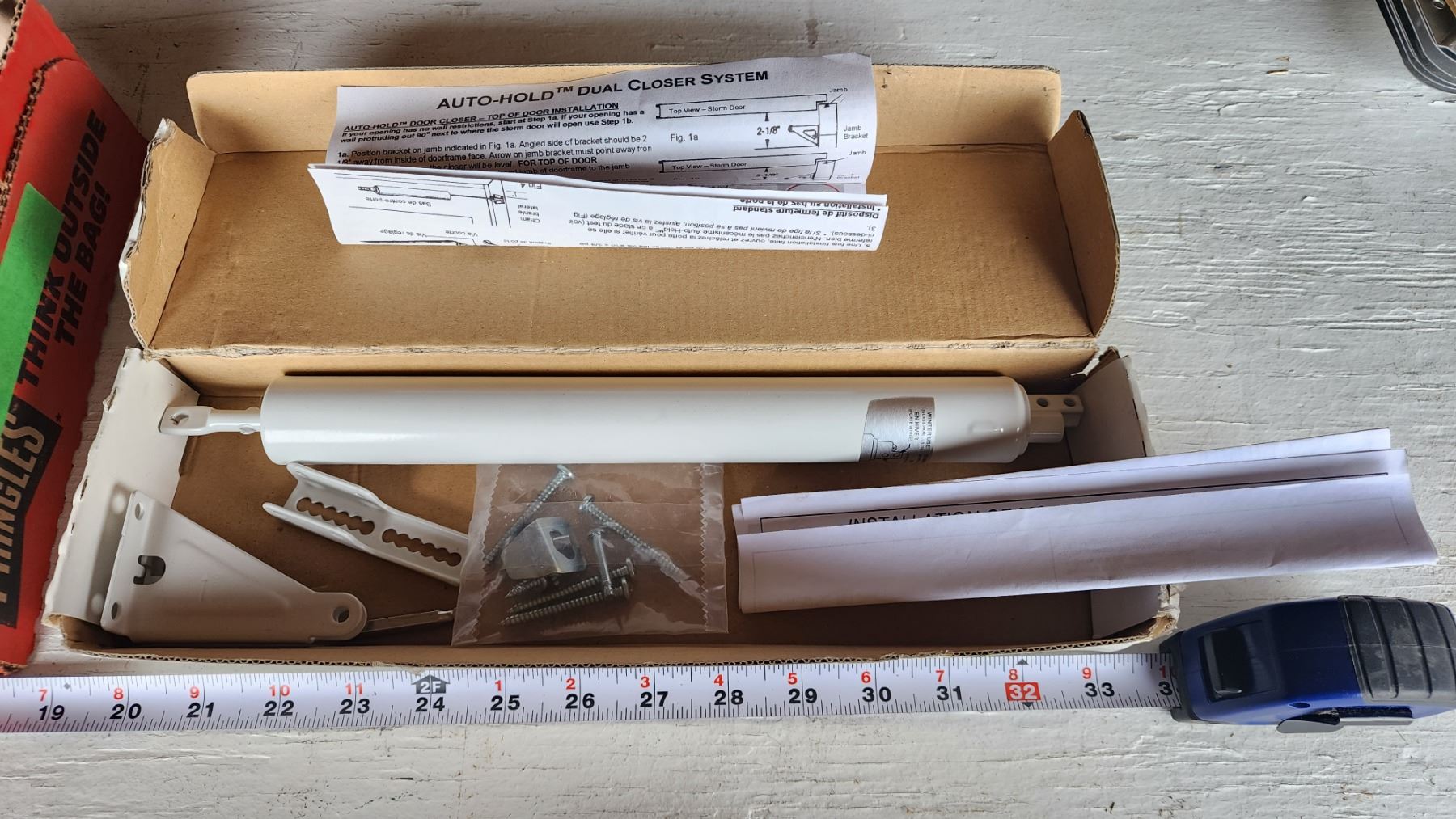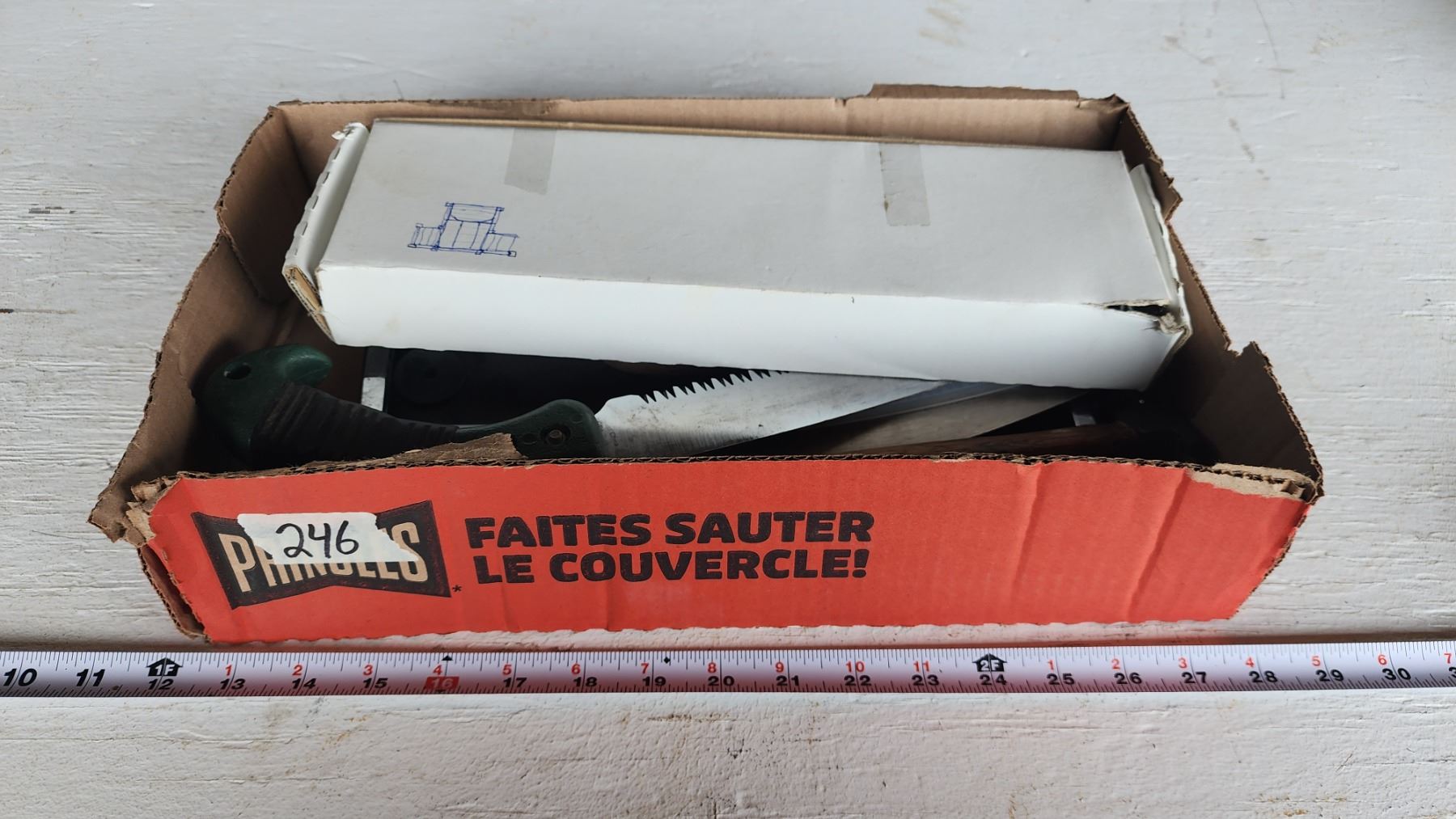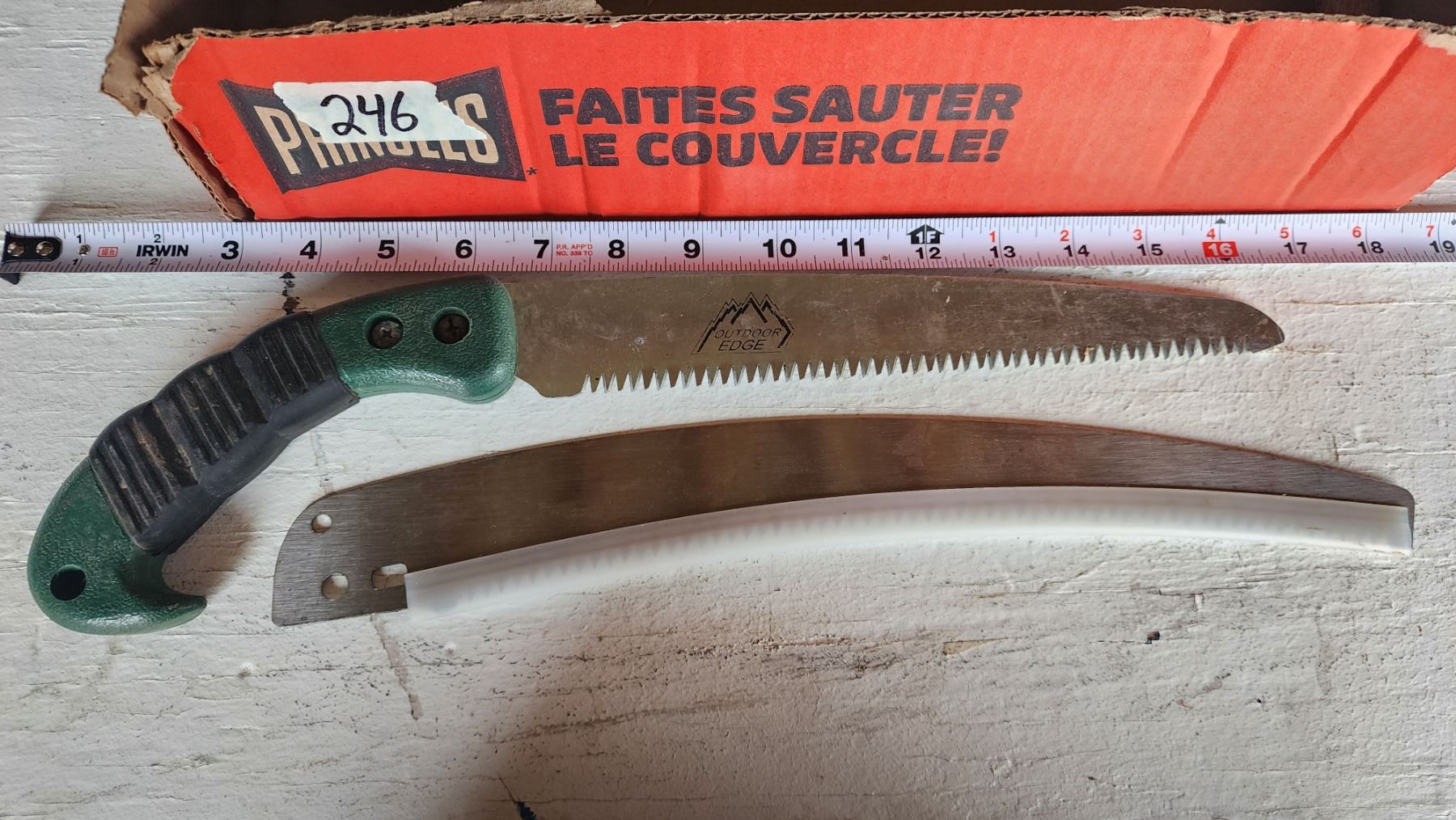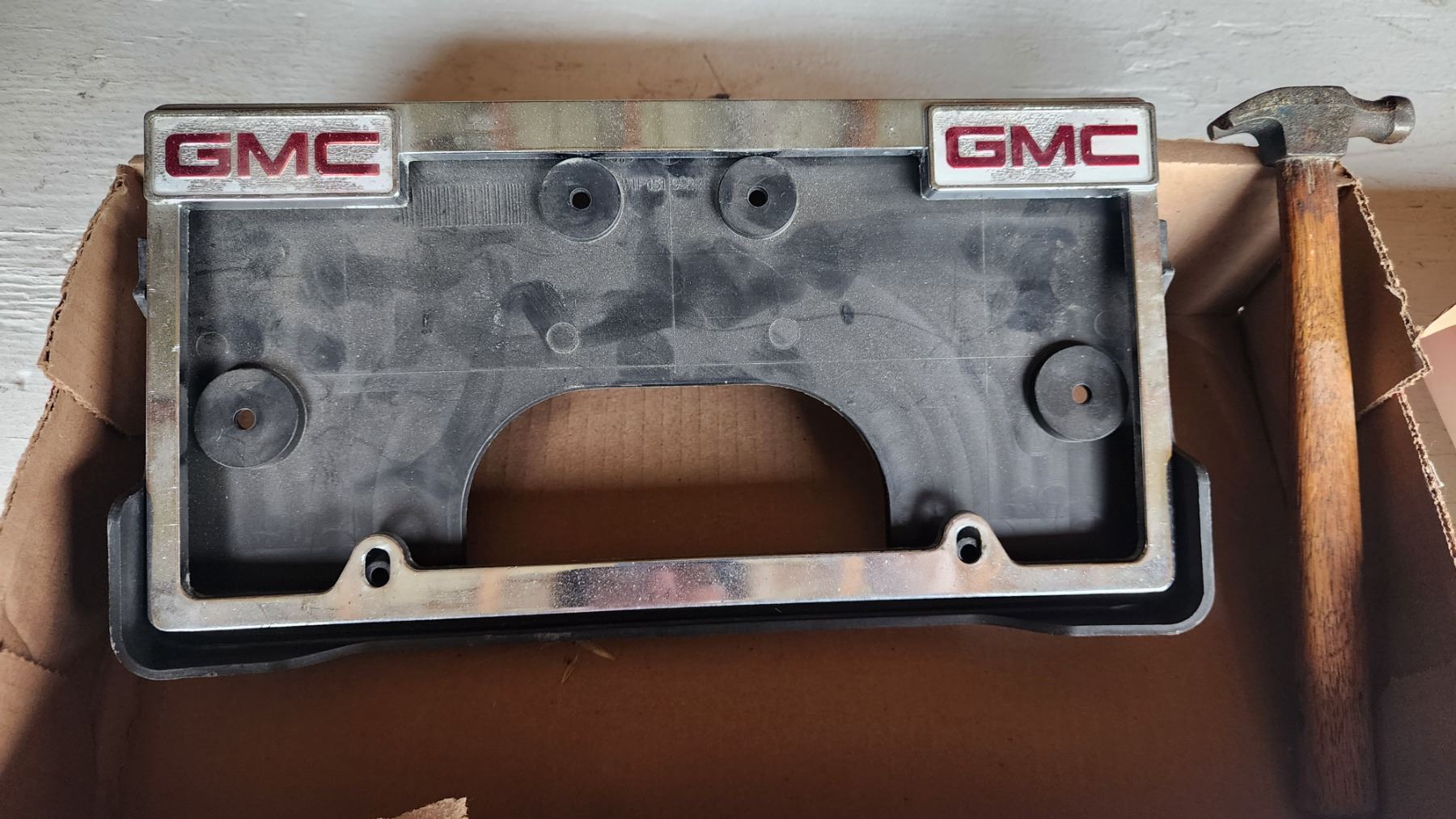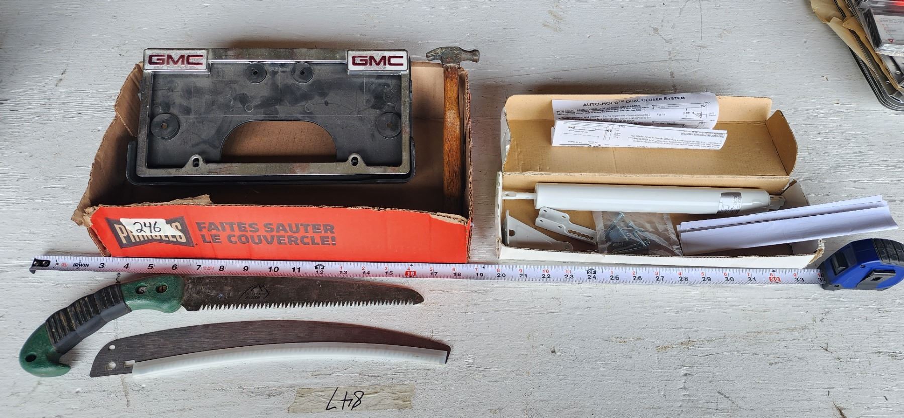 Misc items - Camping saw, with extra blade, GMC license plate holder, and screen door mechanism