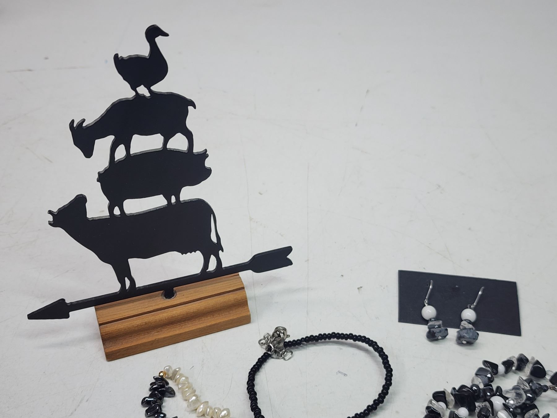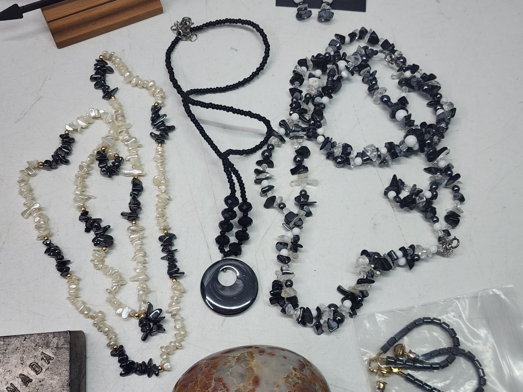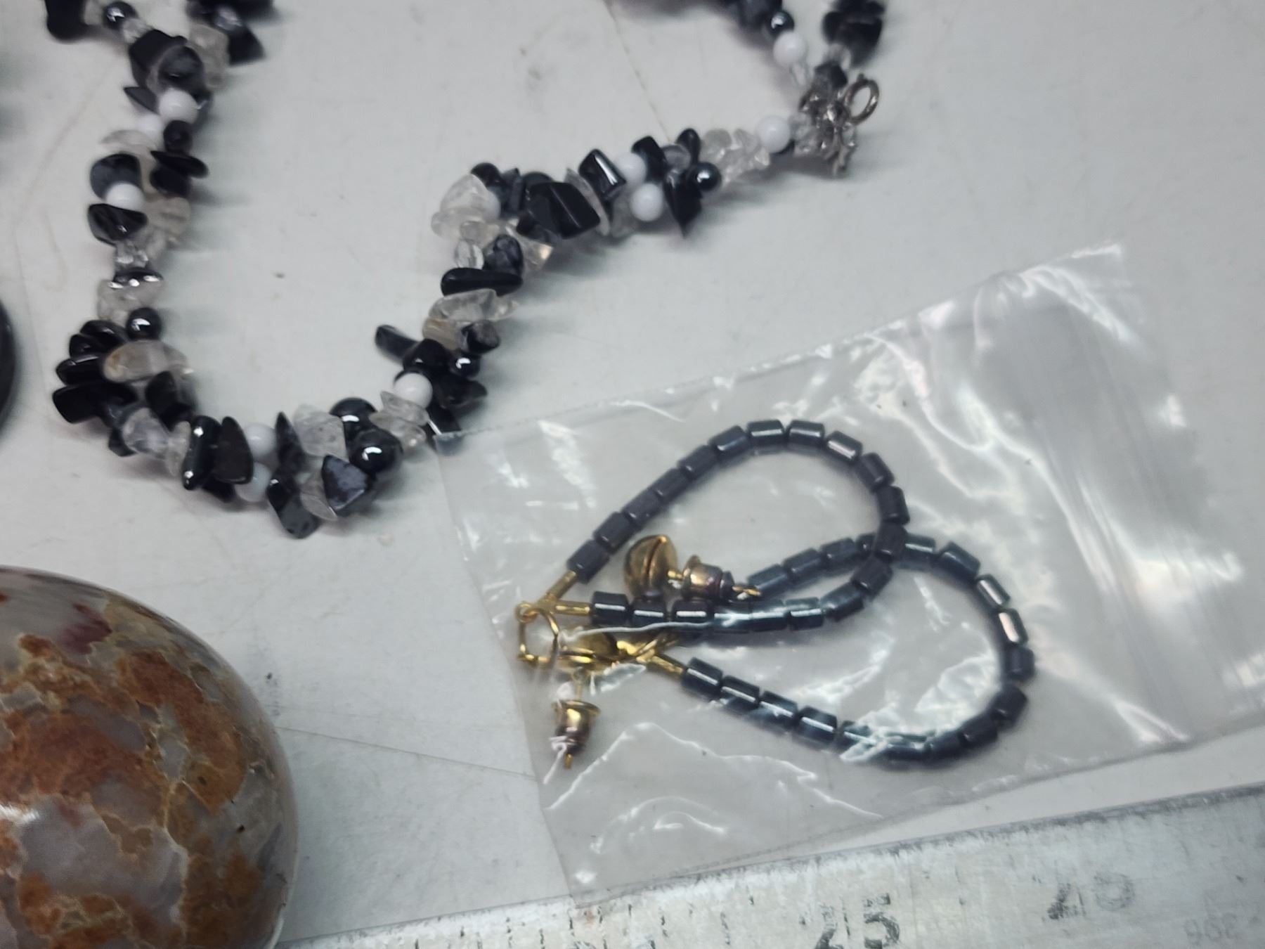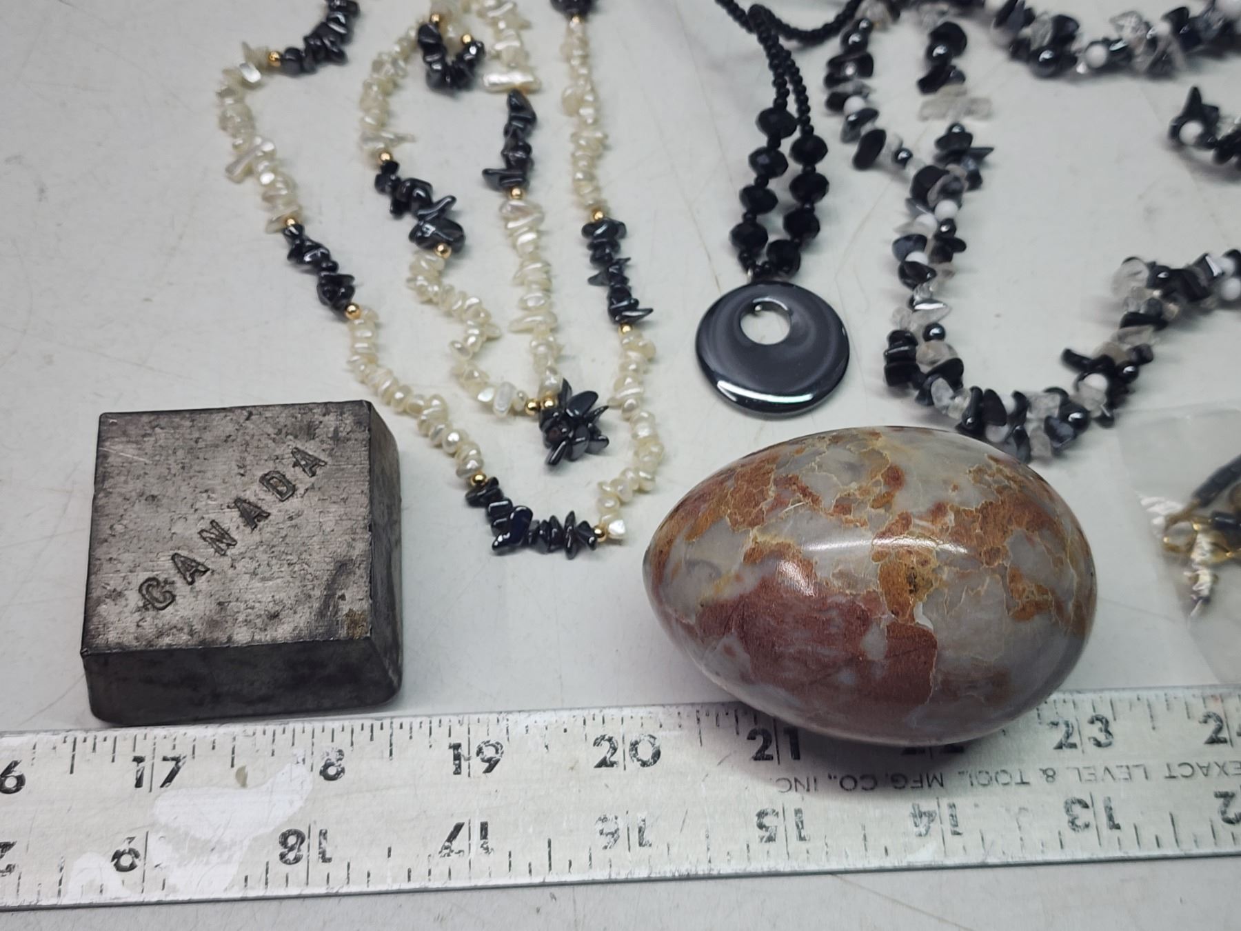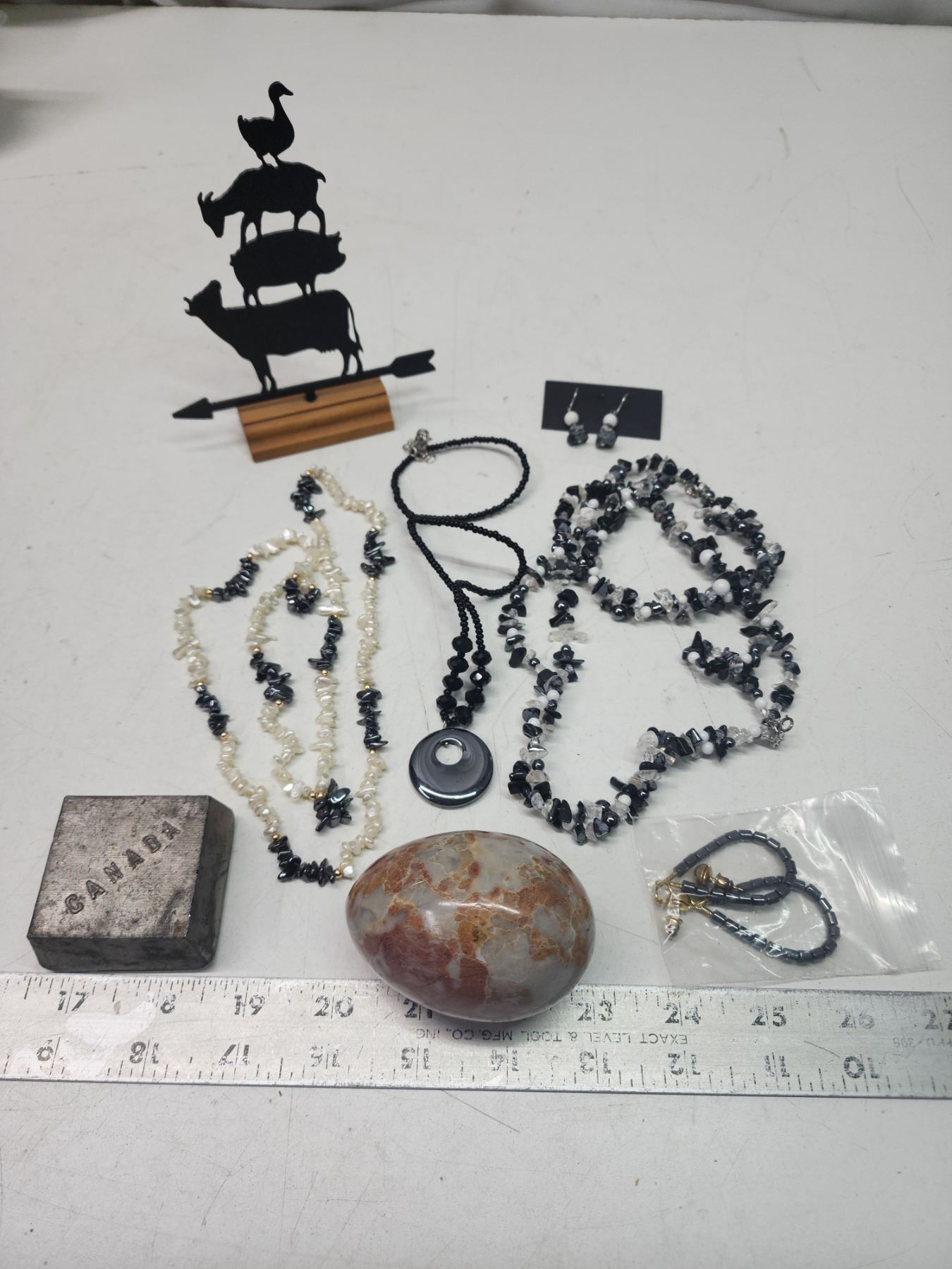 Misc. items - Lead paper weight, Quartz crystal egg, hematite necklaces, etc.