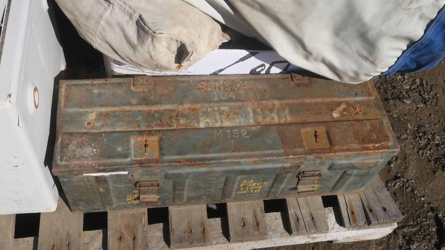 Misc. items , glassware set, money safe, military older metal ammo box
