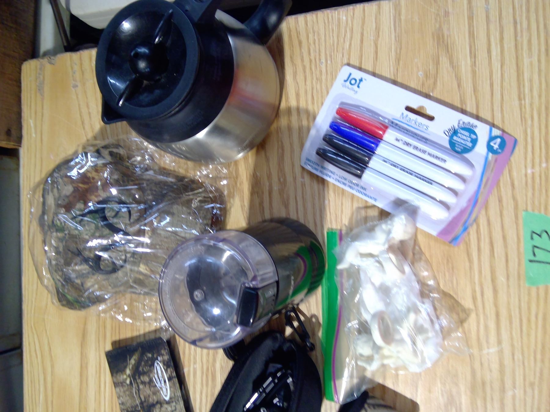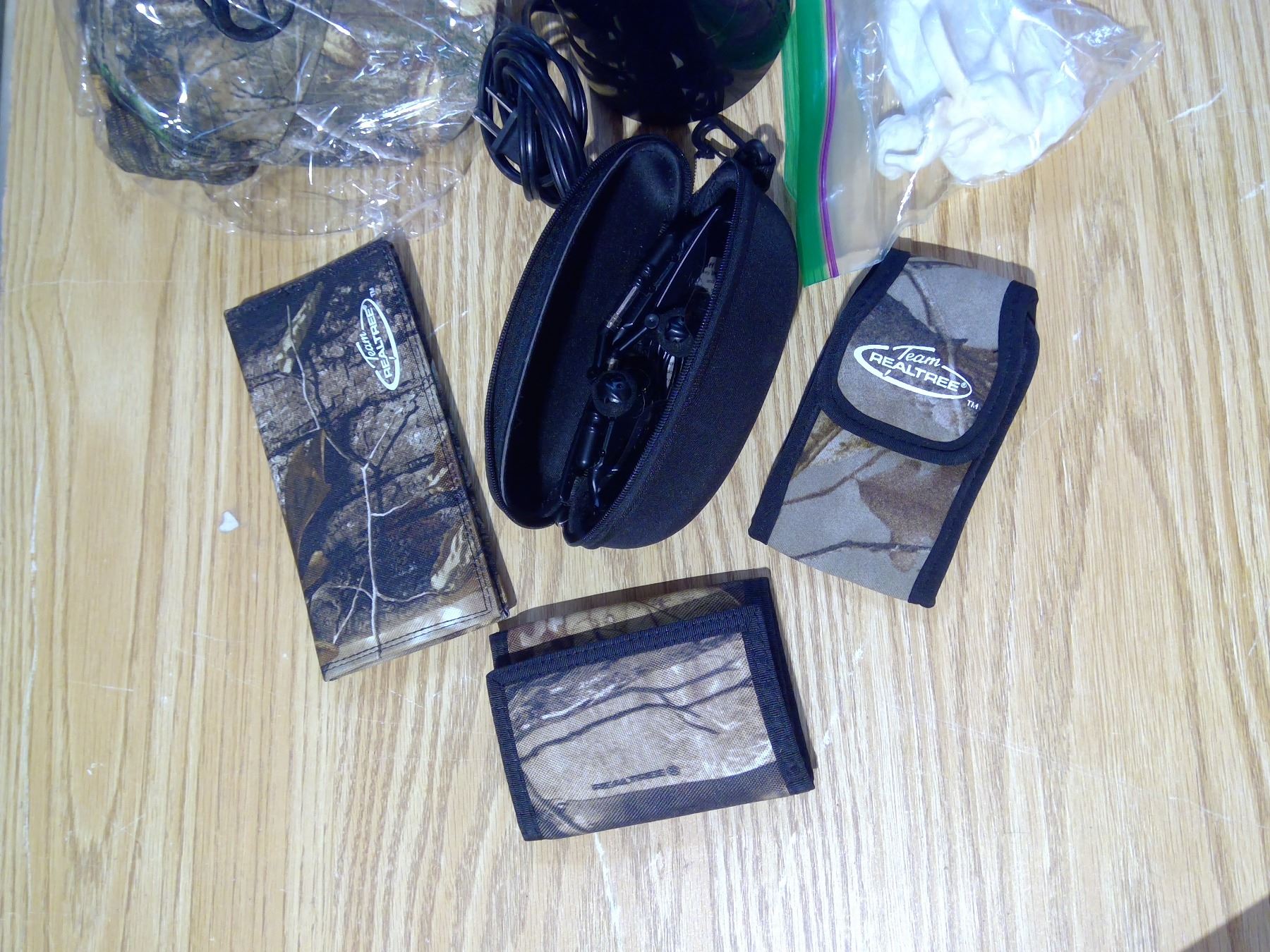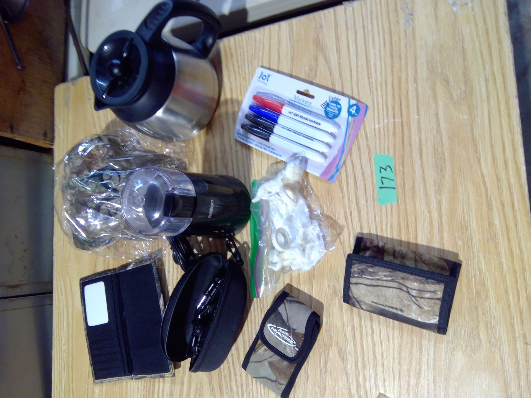 Misc lot of markers, sunglasses, cap, knife holder, cheque book cover, wallet, salton and pot