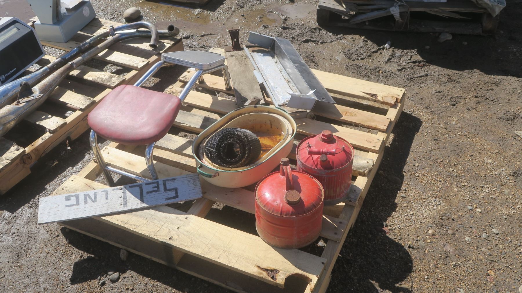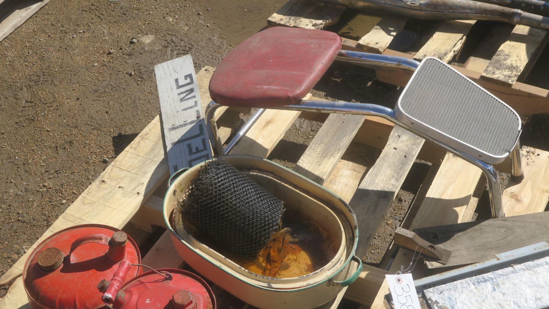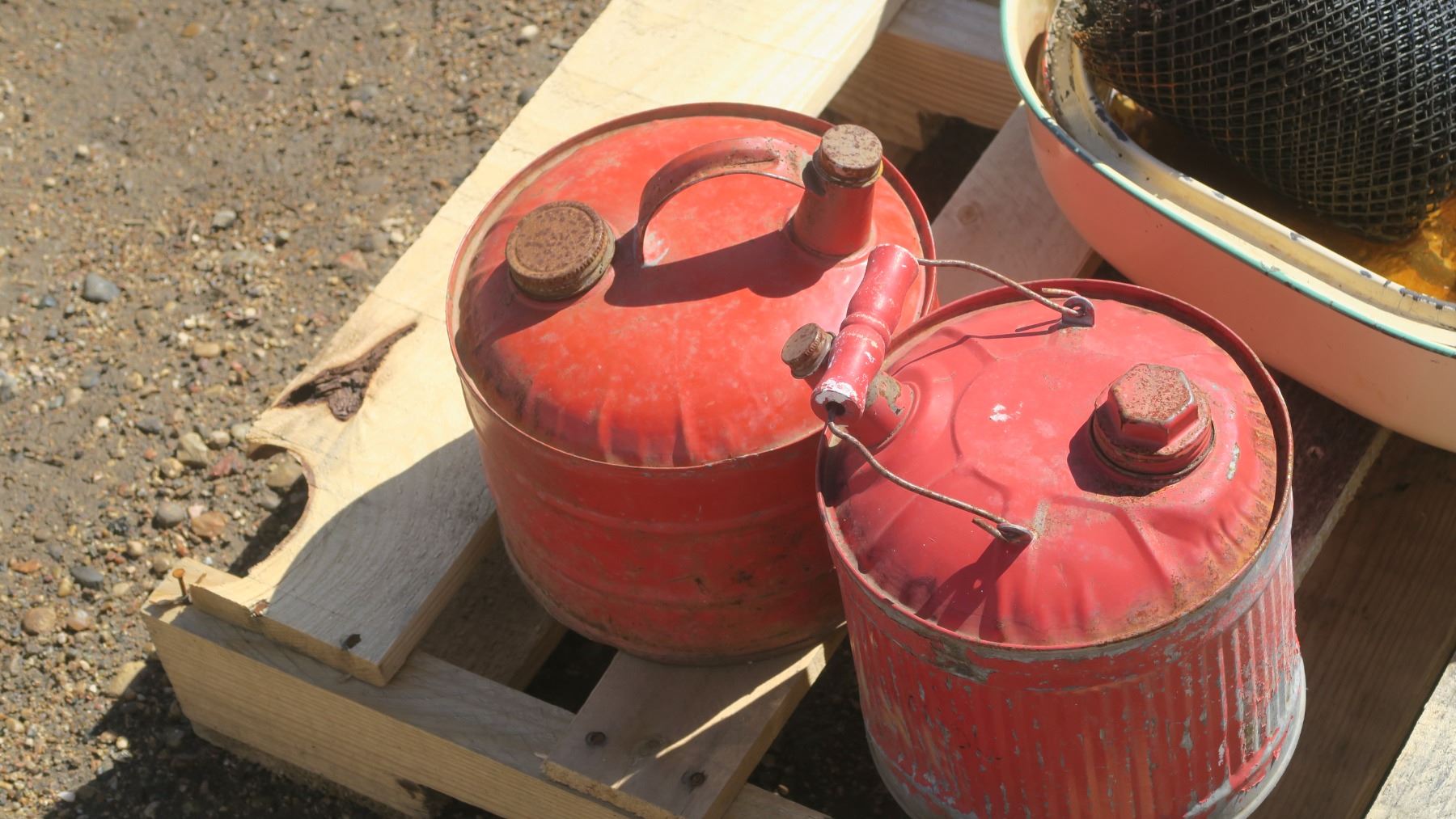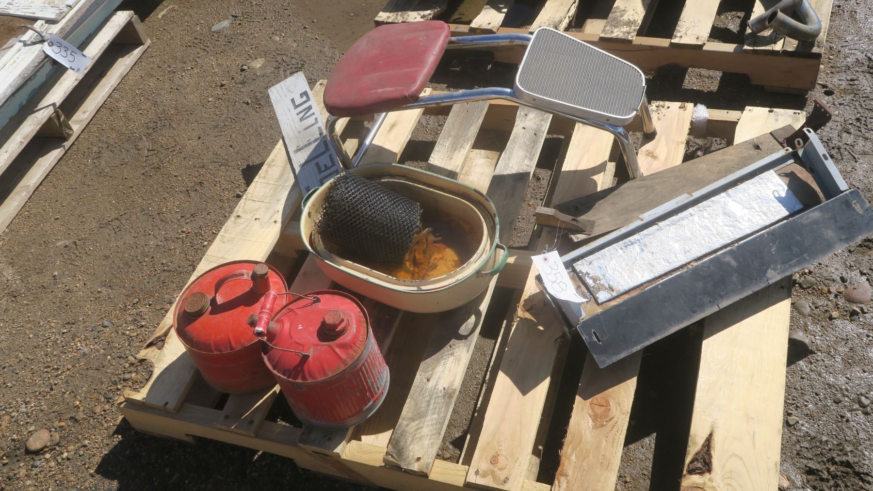Misc. pallet of older items, 2- antique gas cans, stool, pots and other items.