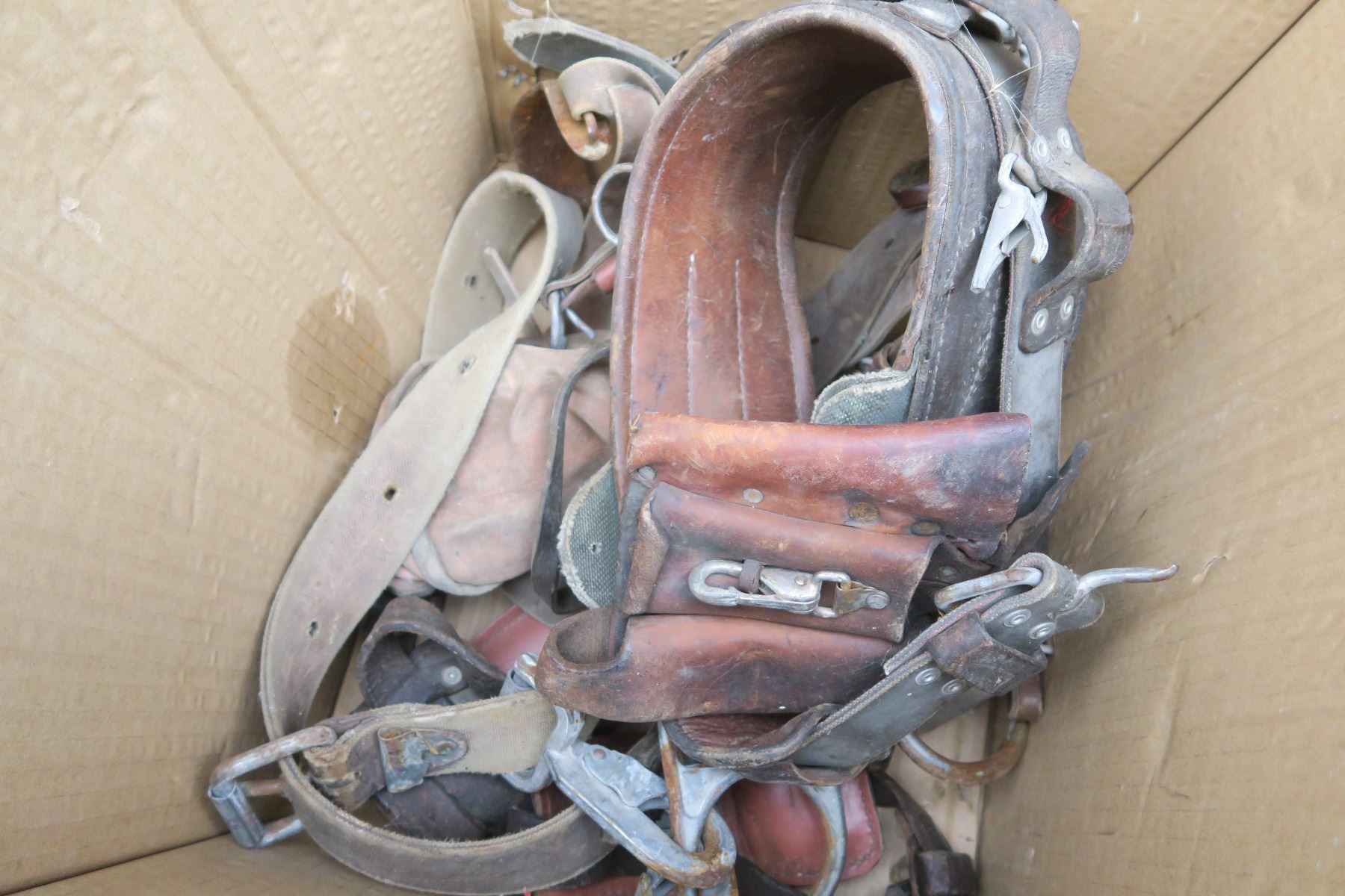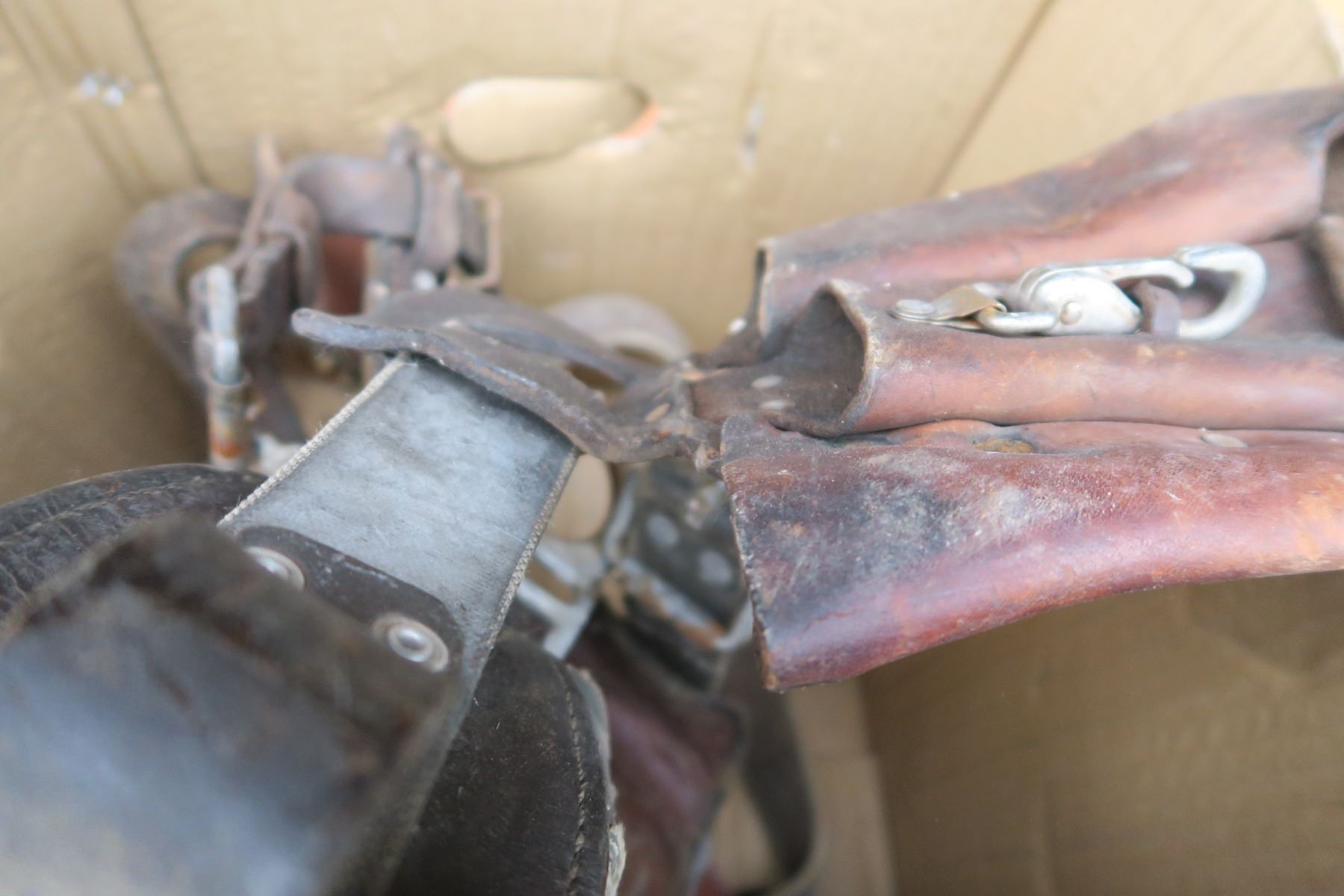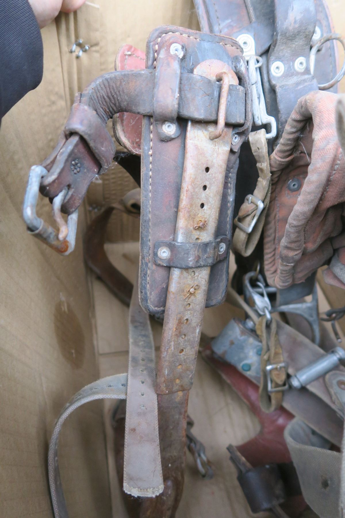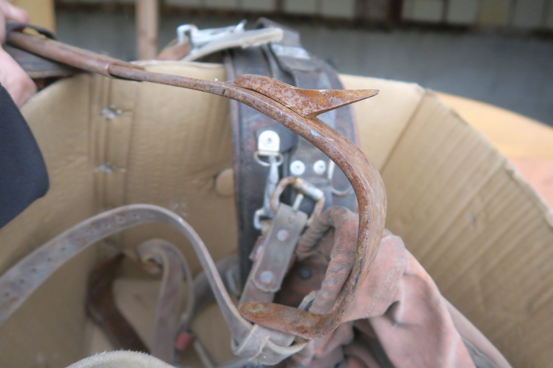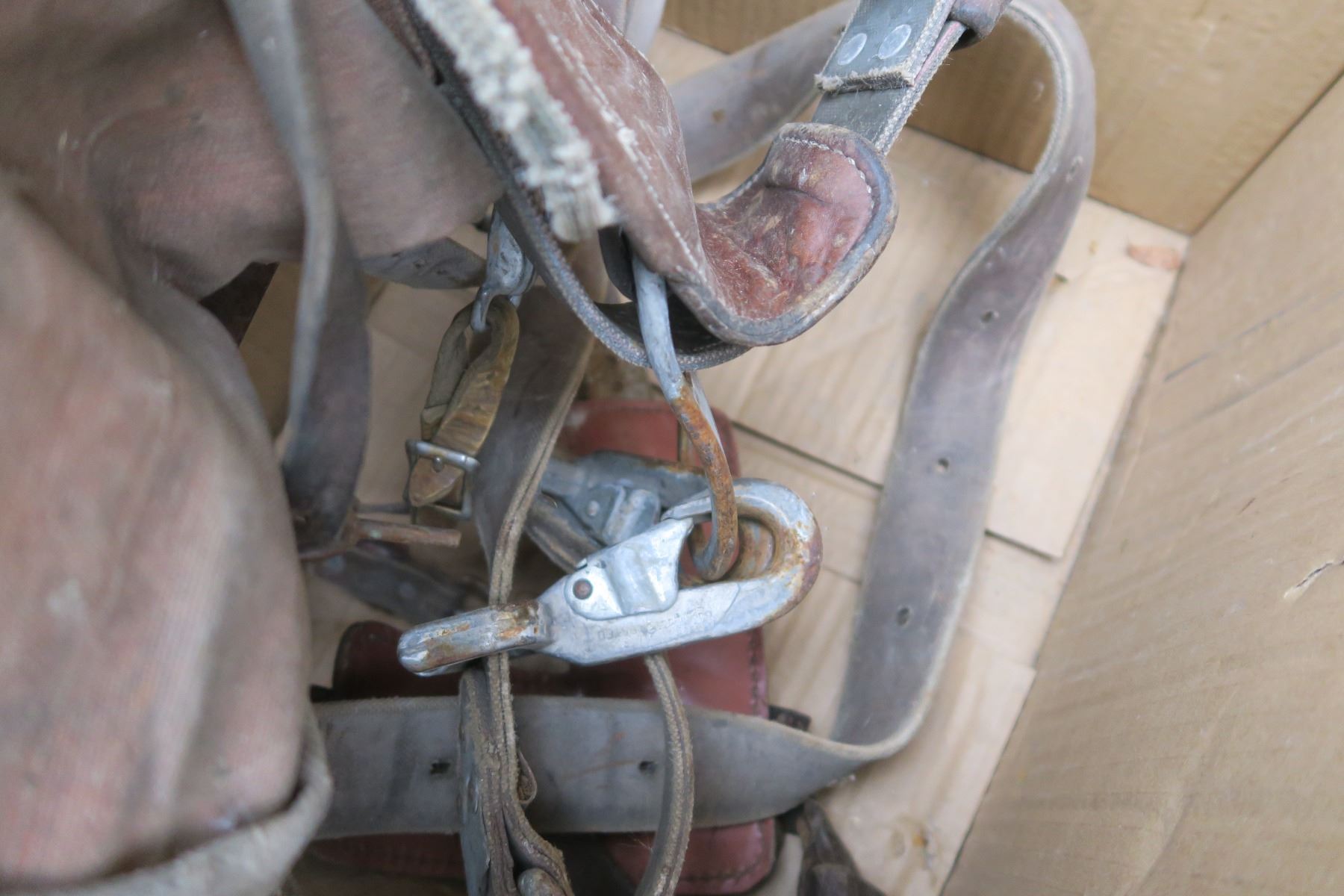 Misc tool belt with tree climbing spurs.
