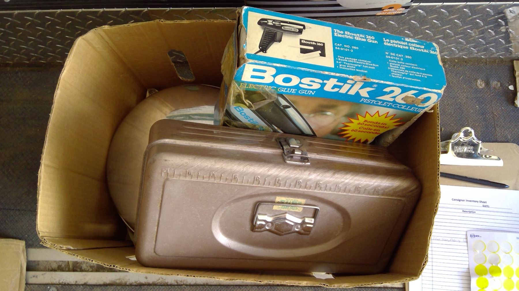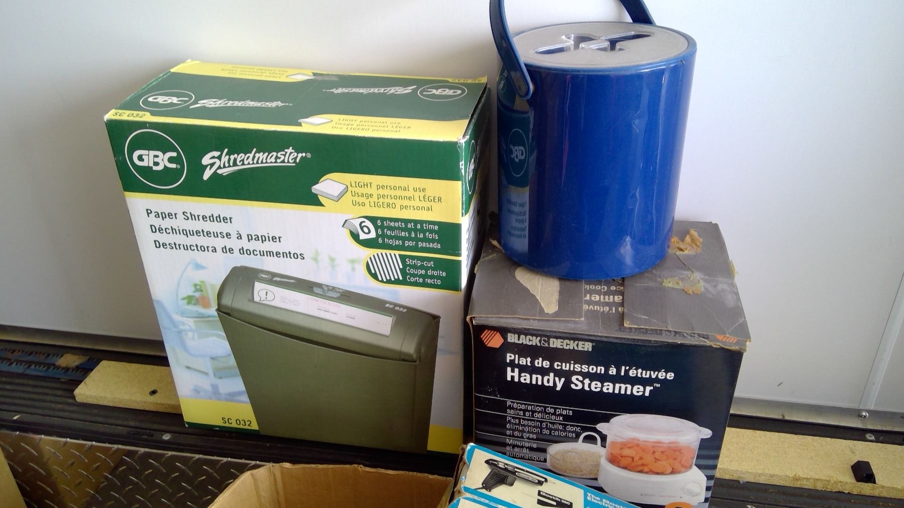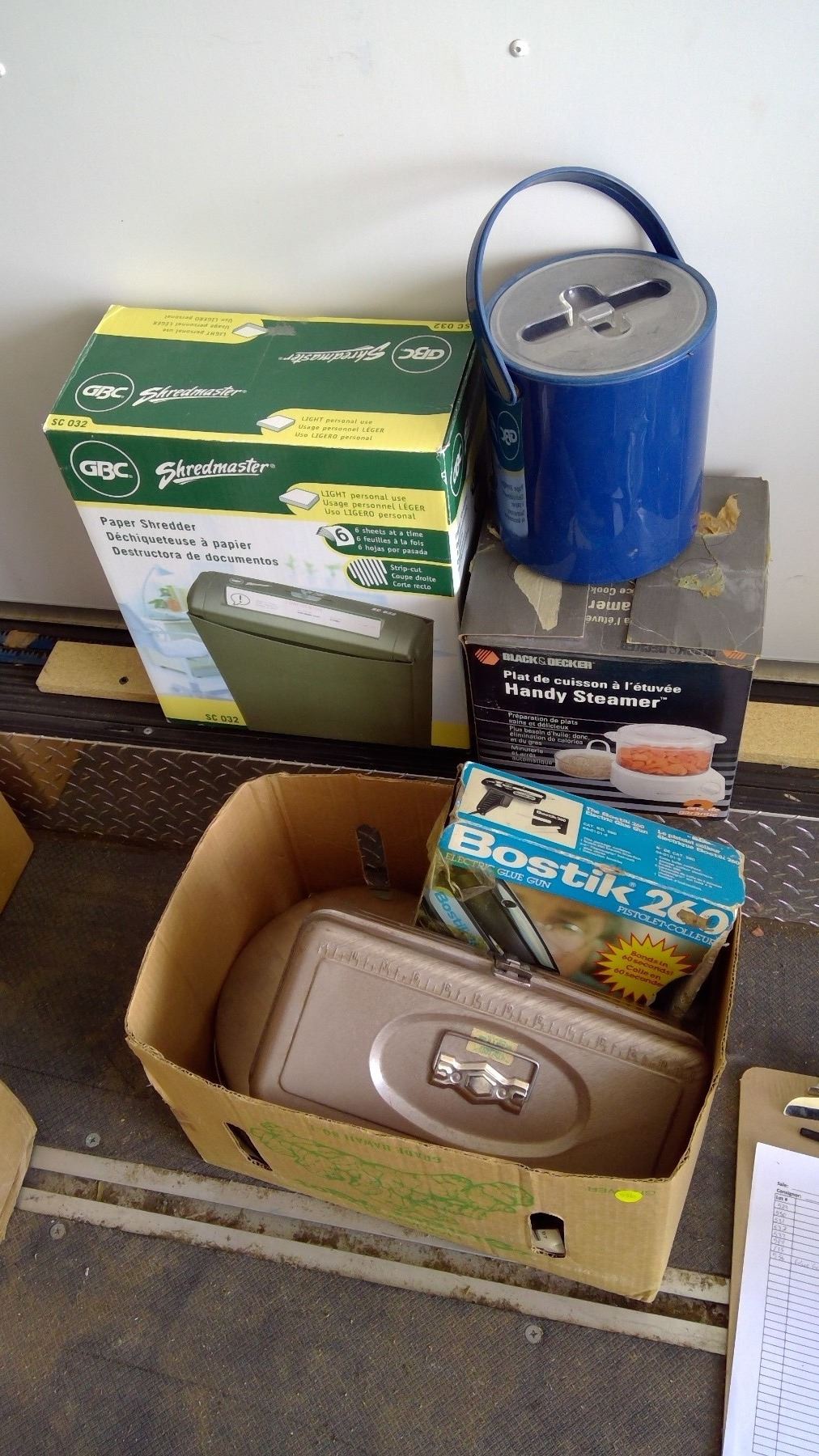 The boxes contain a glue gun, fishing tackle, frying pan, steamer, and paper shredder, located at Schmalz Auctions