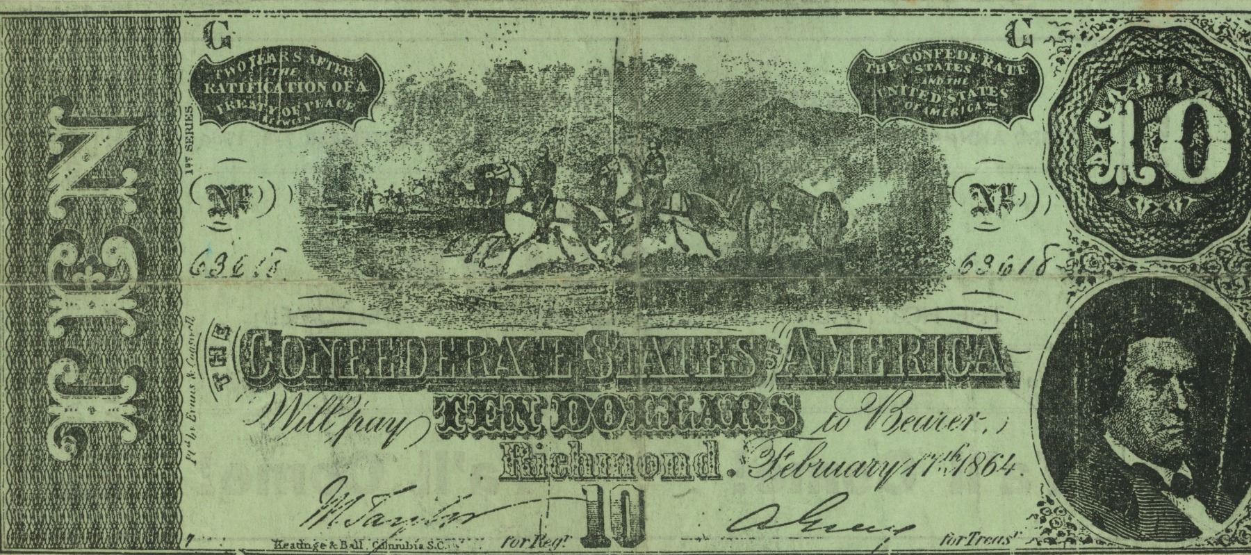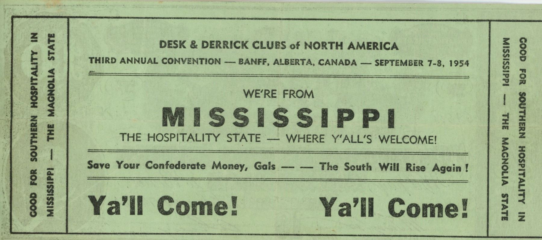 Mississippi advertising note that depicts a Confederate States of American 1864 $10 on the face, with Desk & Derrick Clubs of North America Third Annual Convention held in Banff, Alberta in 1954 on the back. Scarce.