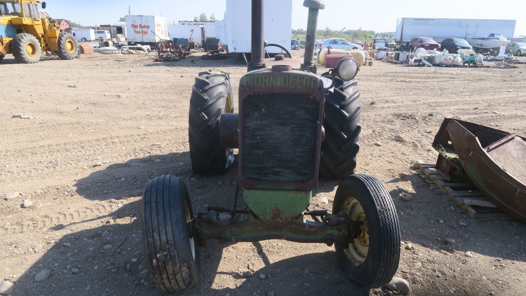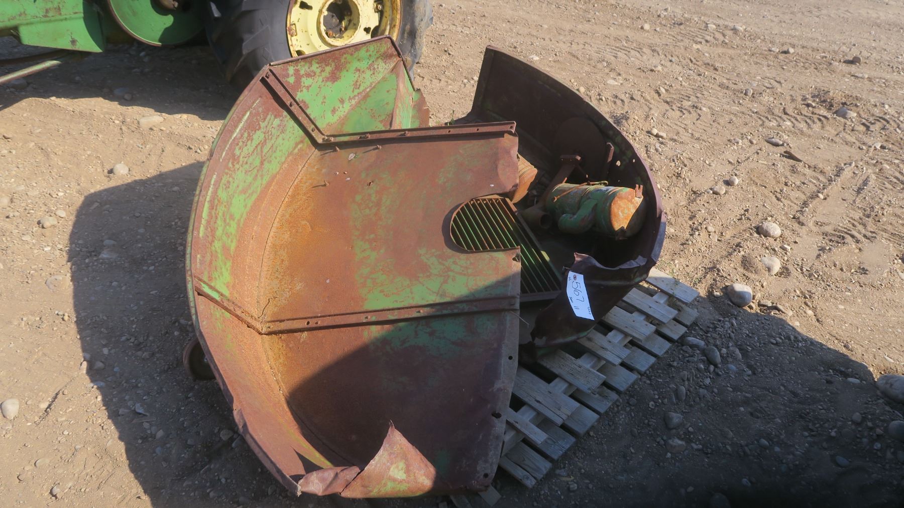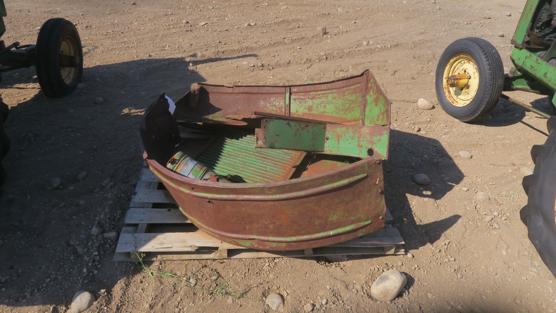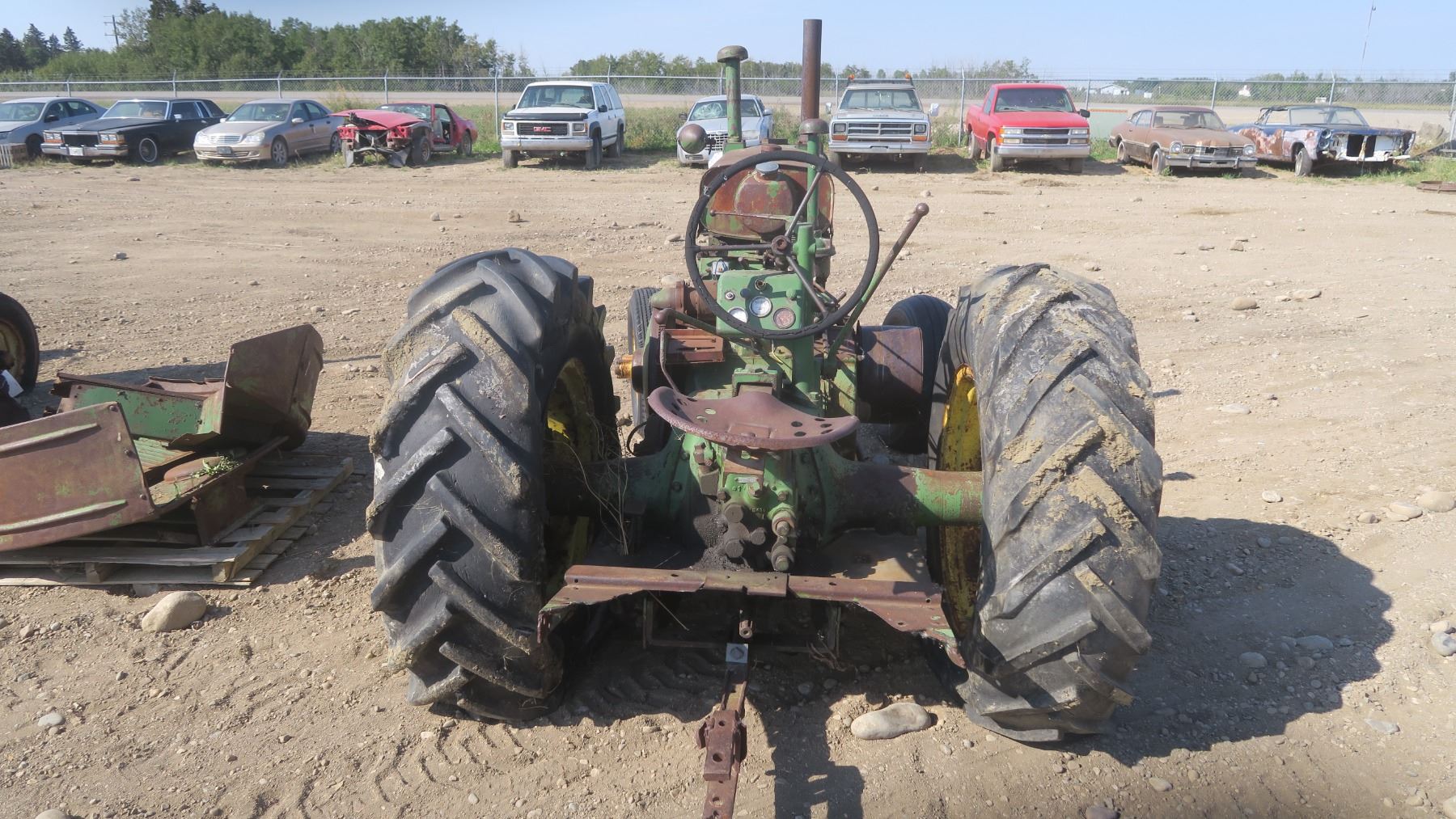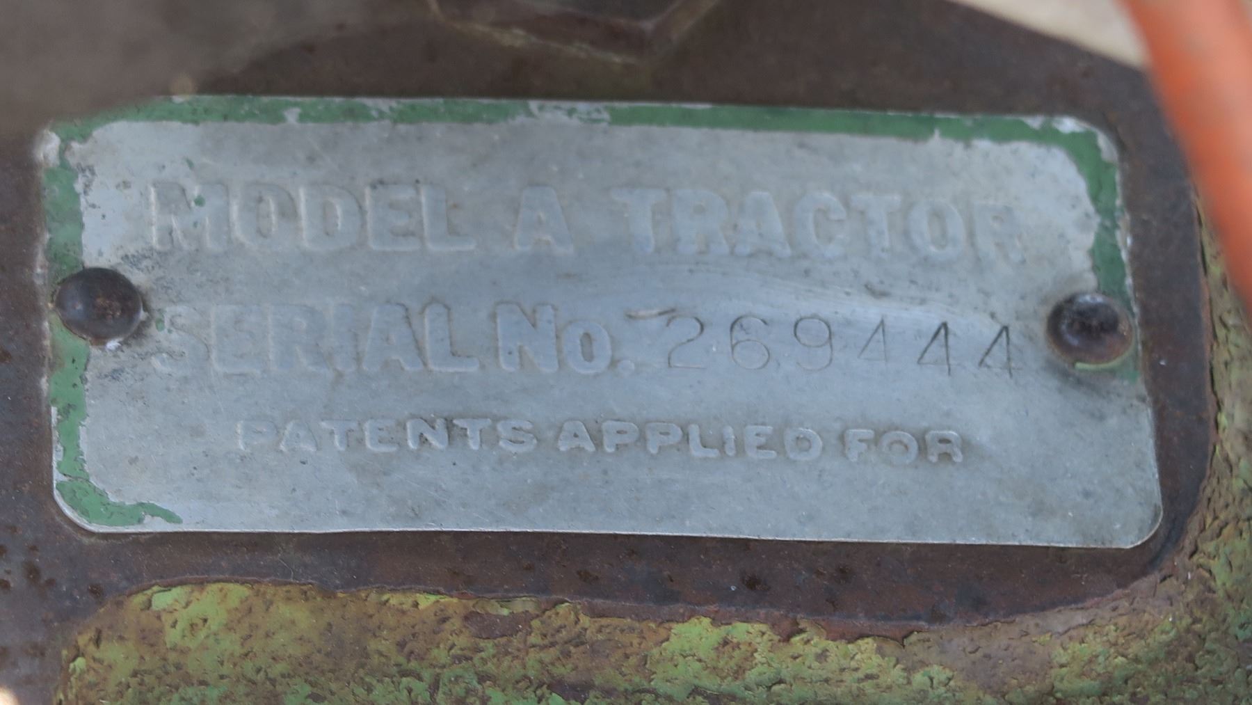 Model A John deer tractor #269444 with pallet of fenders and items for tractor.