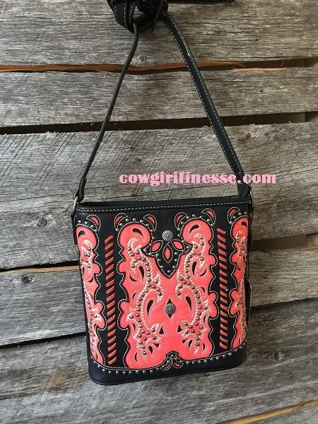 Montana West western beauty! Rich coral color has a scrolling design accented with silver concho. A zipper enclosure on top of the bag.Inside of bag include a zippered pocket and 2 open pockets.An open pocket and zippered pocket on the back. A crossbody adjustable strap