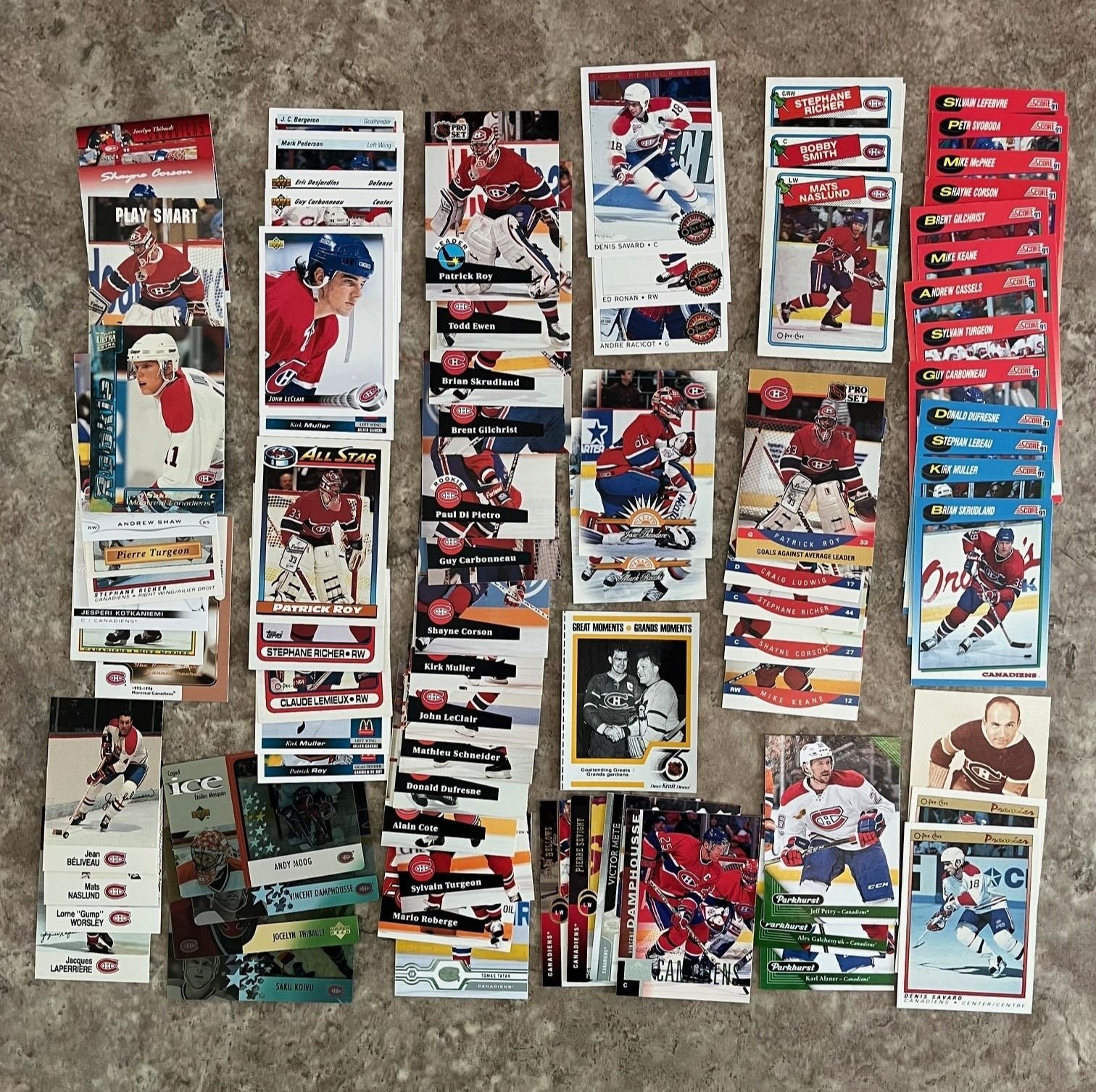 Montreal Canadians lot of 80 different hockey cards. Mixed brands. Mixed years. Patrick Roy.