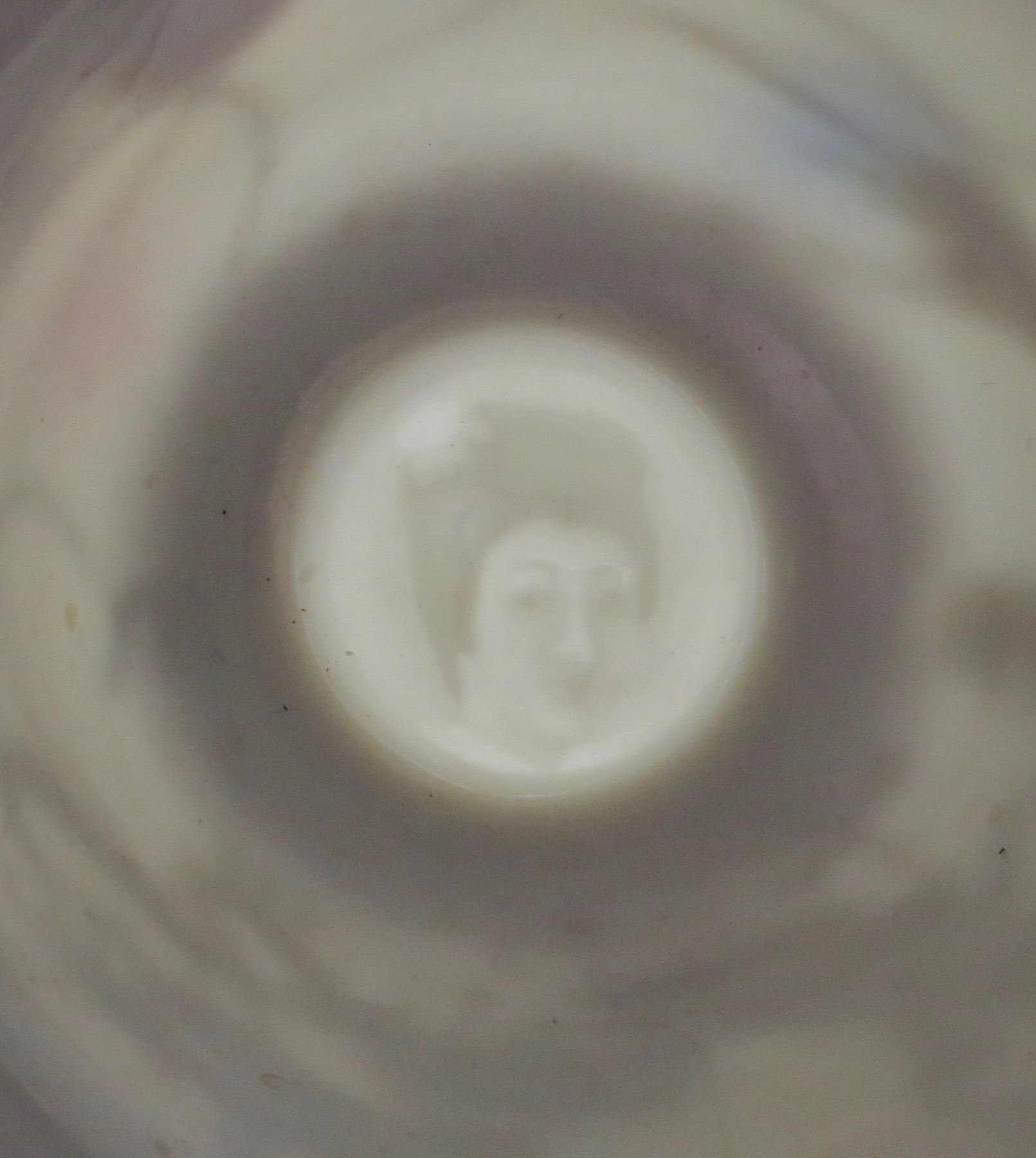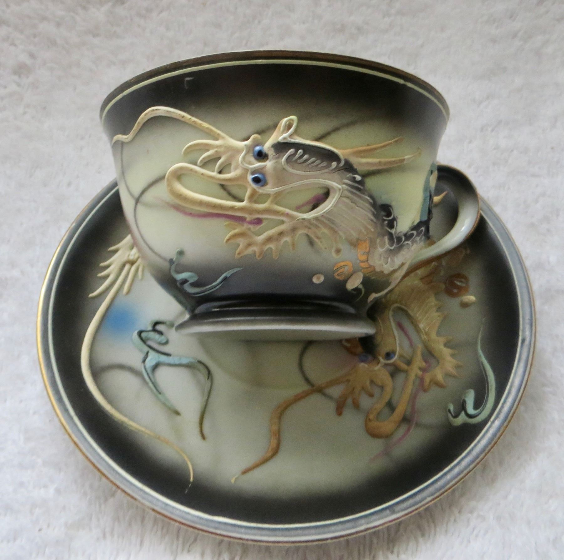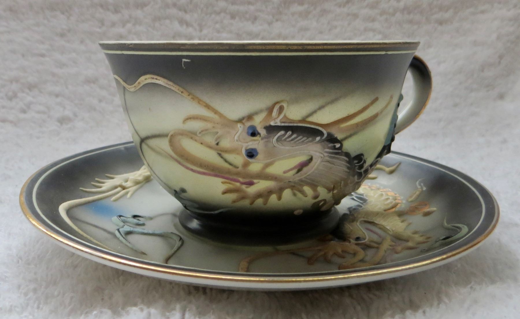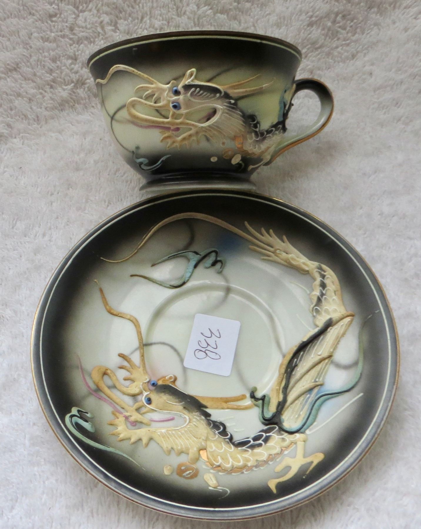 Moriage slipware Dragon tea cup & saucer Geisha Girl - in bottom of cup