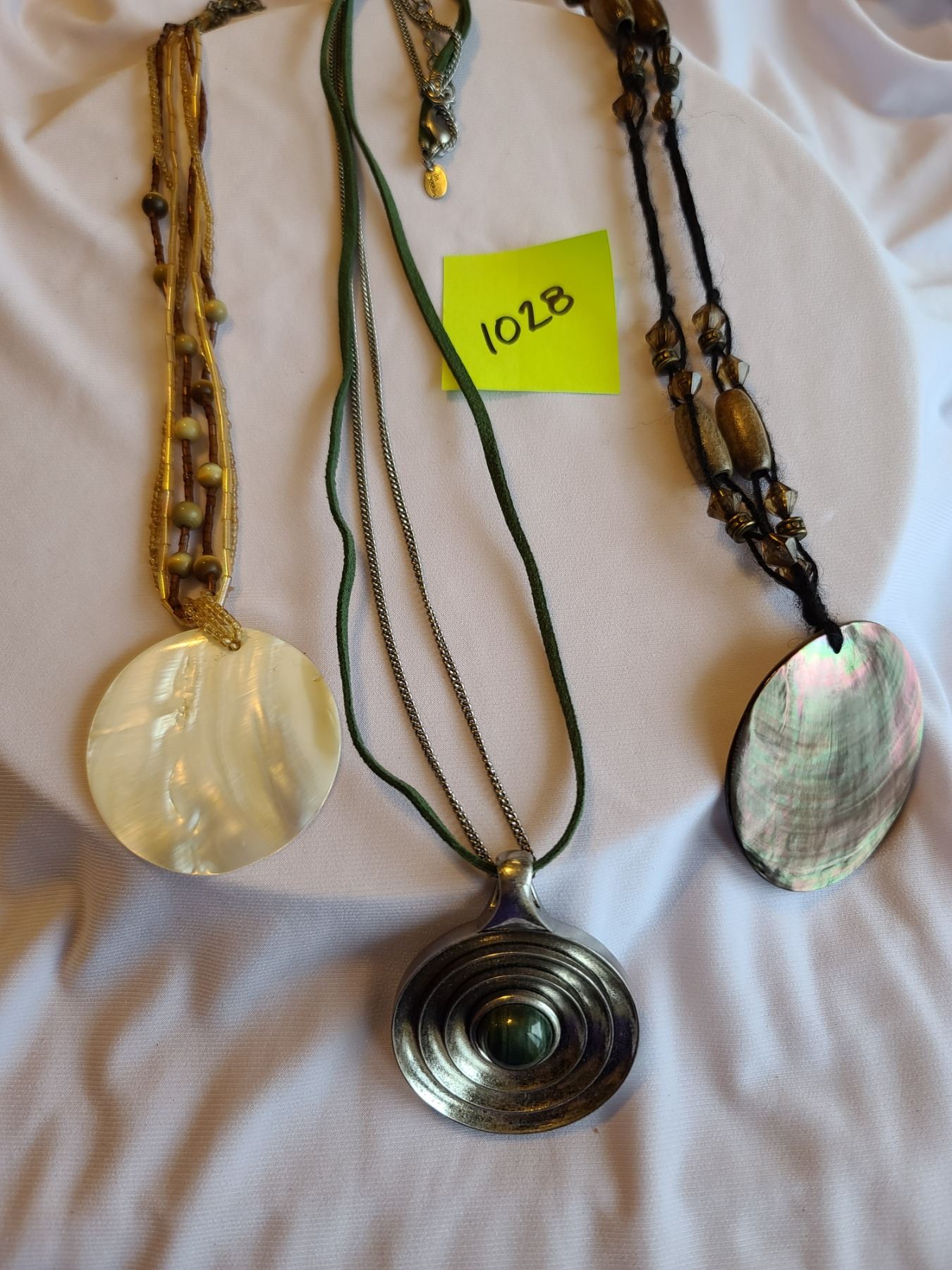 Mother of pearl beaded necklace, Abalone beaded necklace, “Lia Sophia” green suede necklace with silver colored pendant and green stone