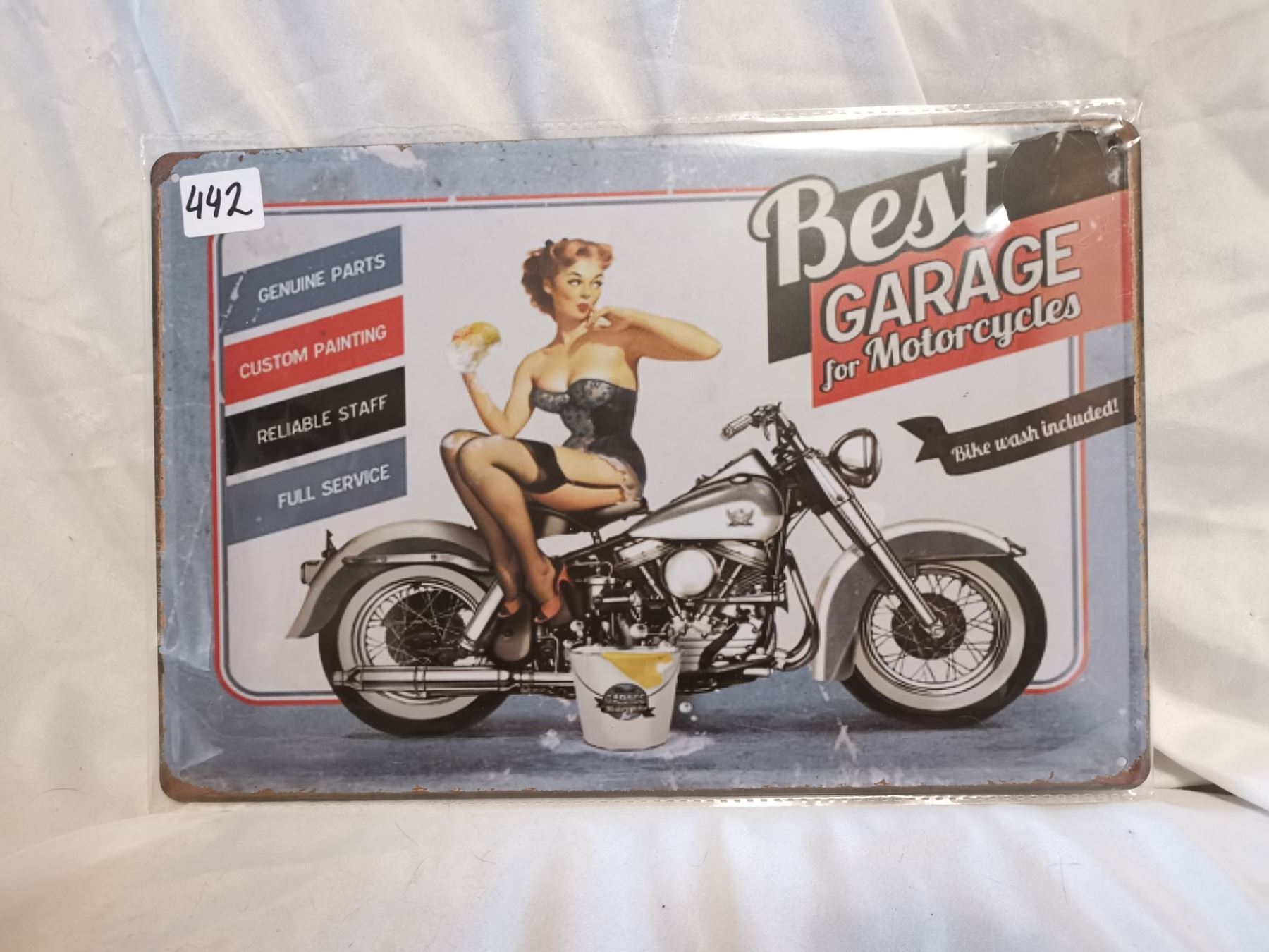Motorcycle Garage Pin-Up Tin Sign 12"x8"