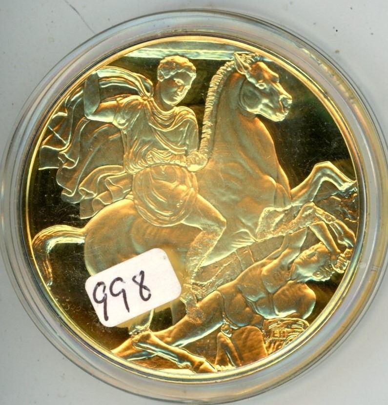 Mourning Athena. From the Ancient Greece Medals Series. A beautiful gold-plated bronze medal measuring 50mm in diameter and weighing 80.3 grams. In hard plastic holder. BU.