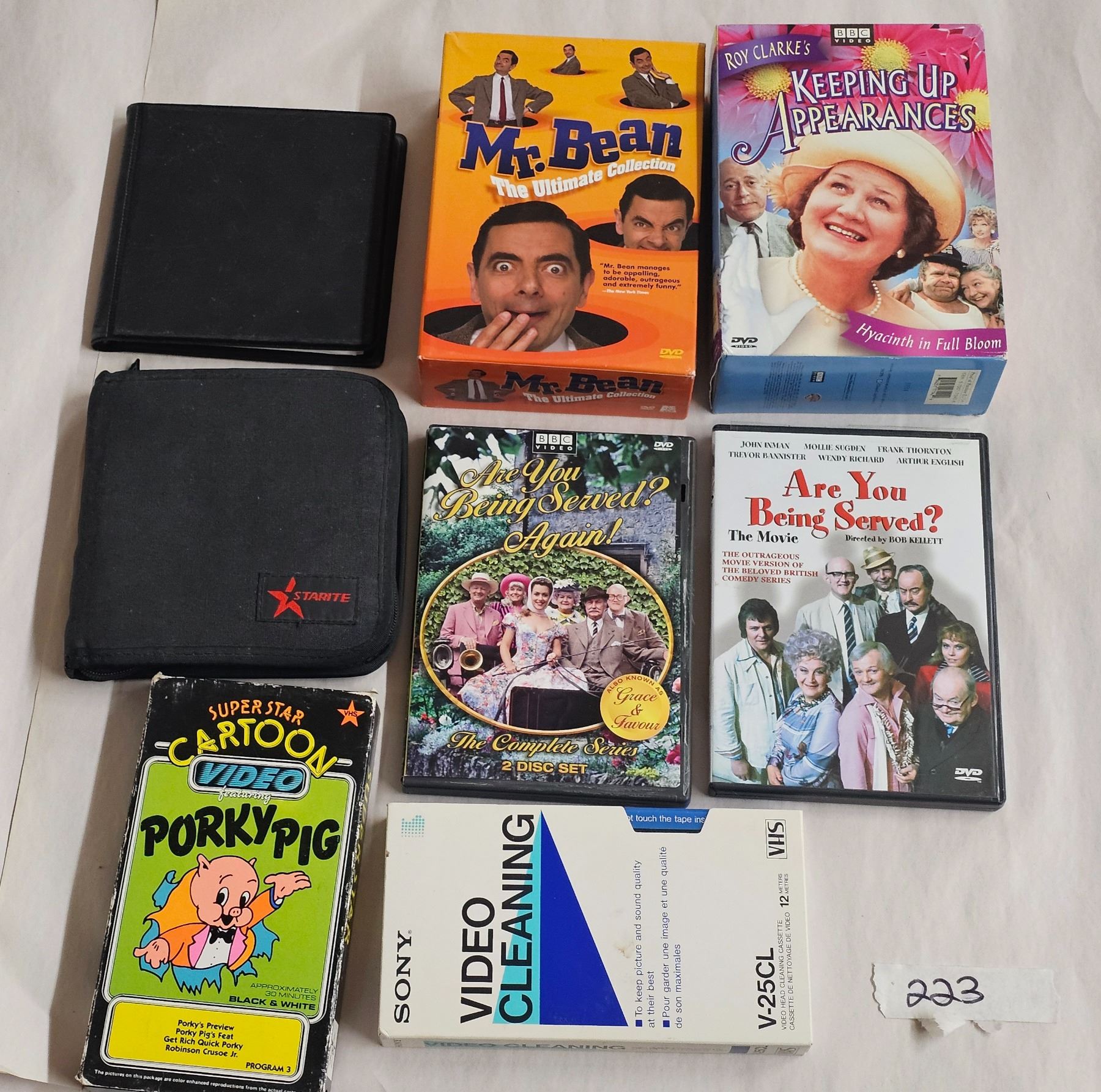 Movie CDs: A Fish Called Wanda, Mr. Bean Collection (7 volumes), Keeping Up Appearances (4 volumes), Are You Being Served (movie) and complete 2 disc series and Porky Pig video. Plus Video cleaner, 2 containers for CDs