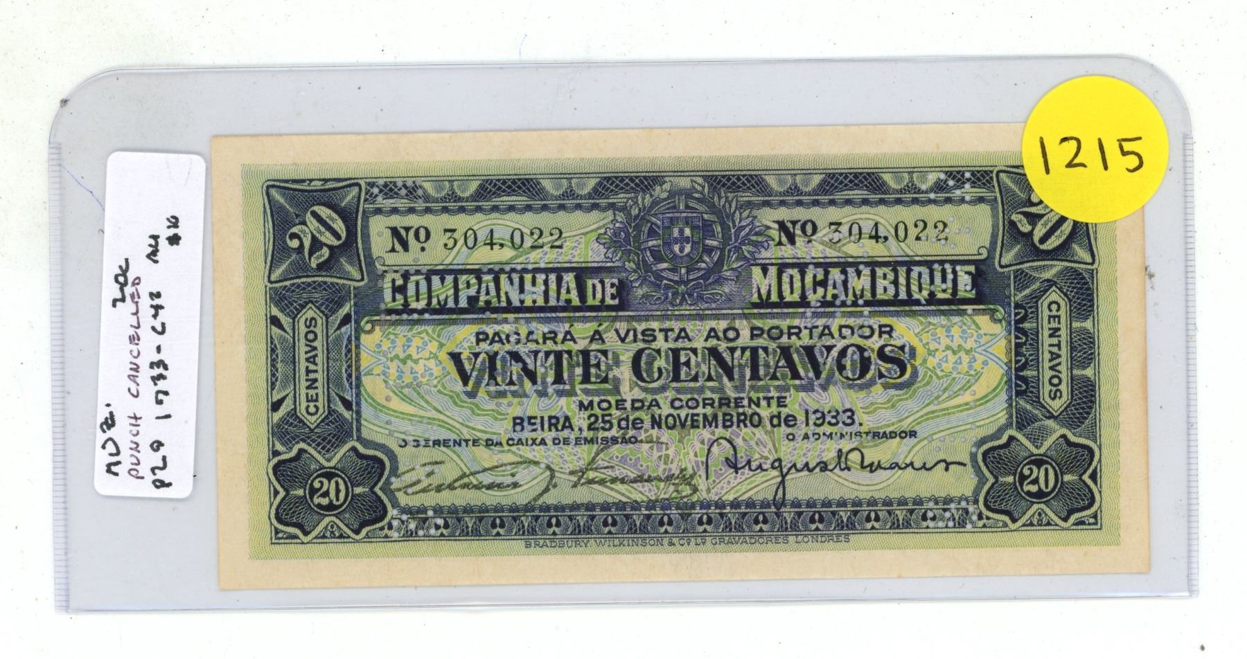 Mozambique. 1933 – 1942 20 Centavos. Punch Cancelled. AU.