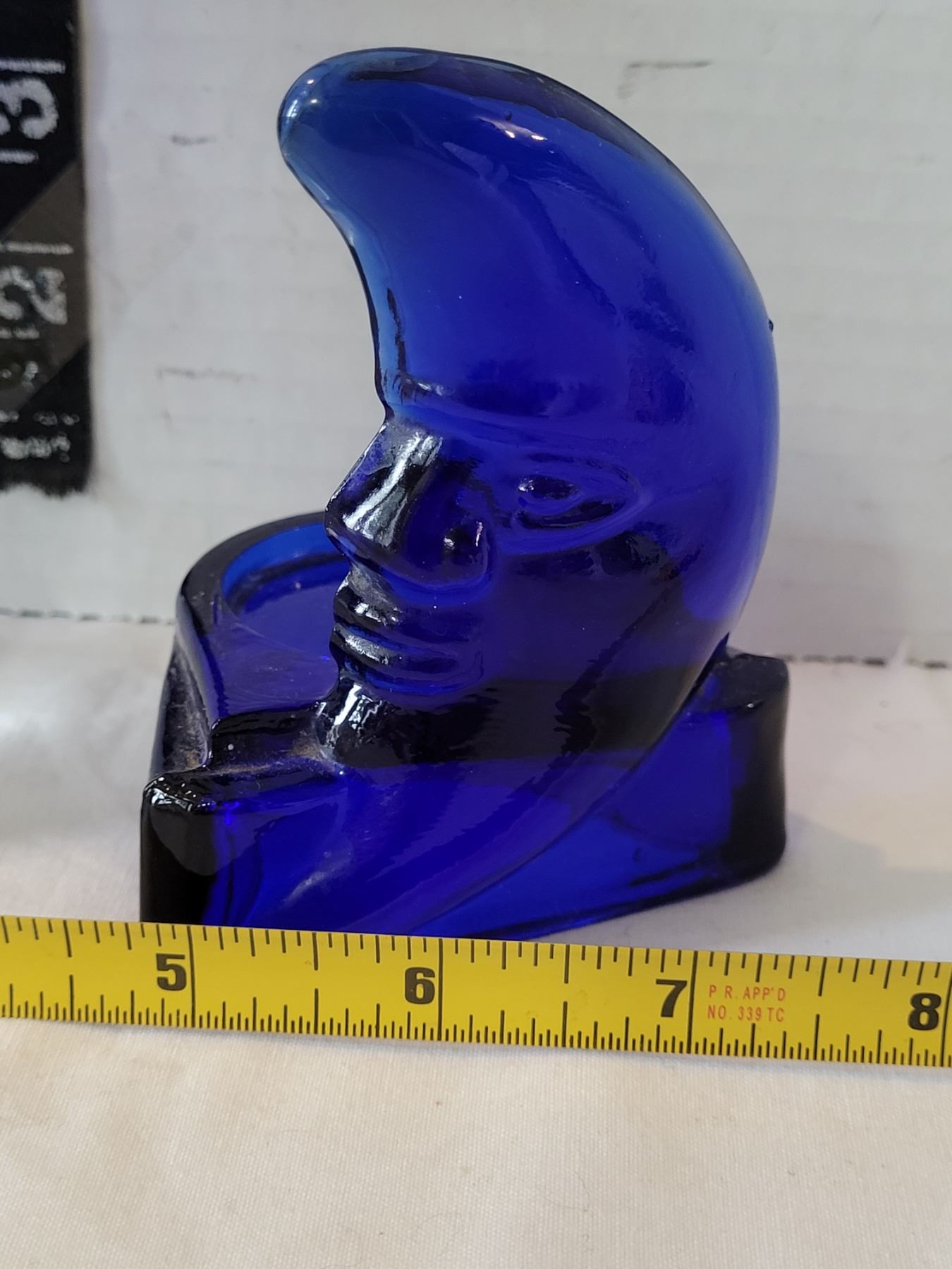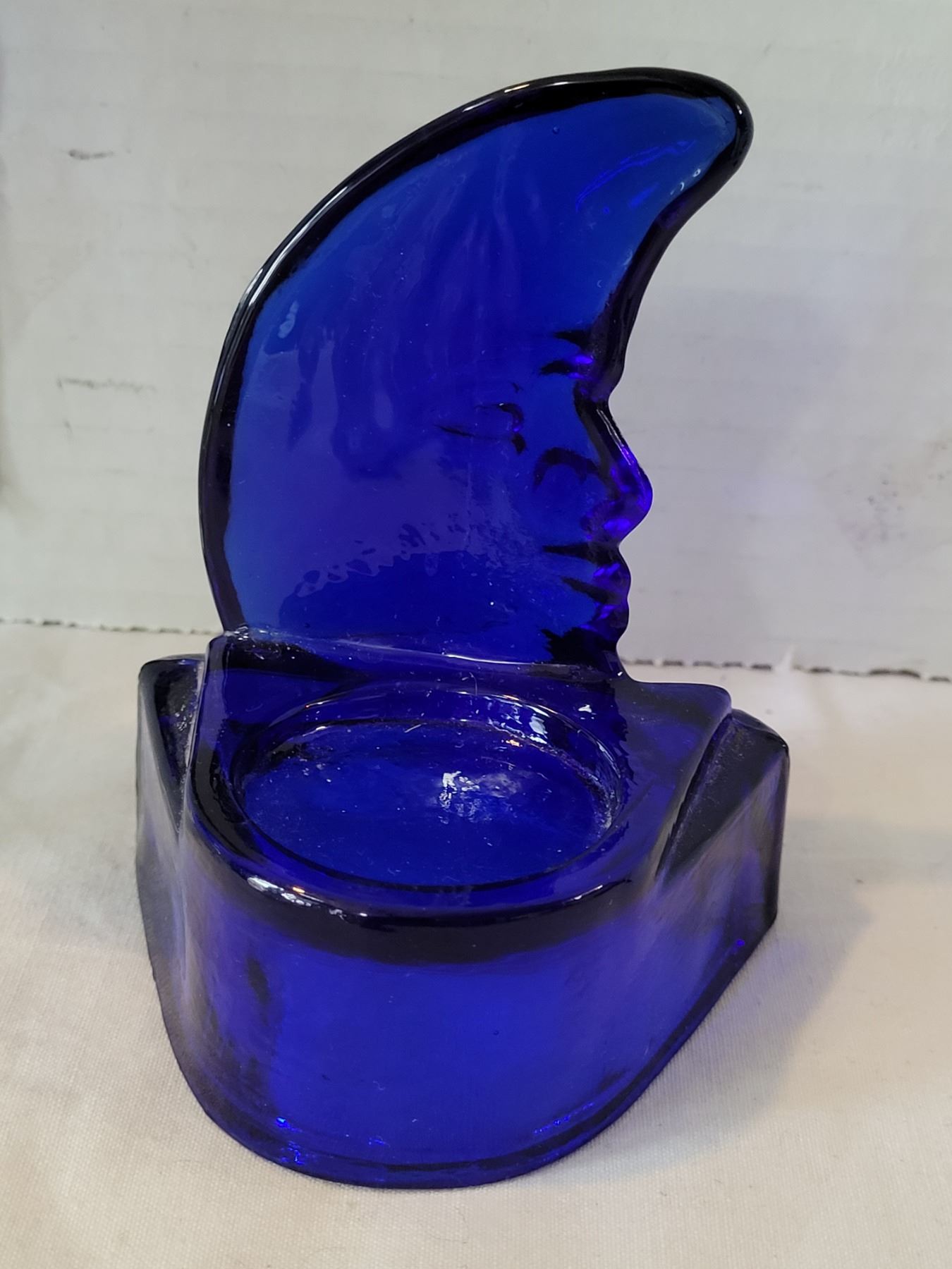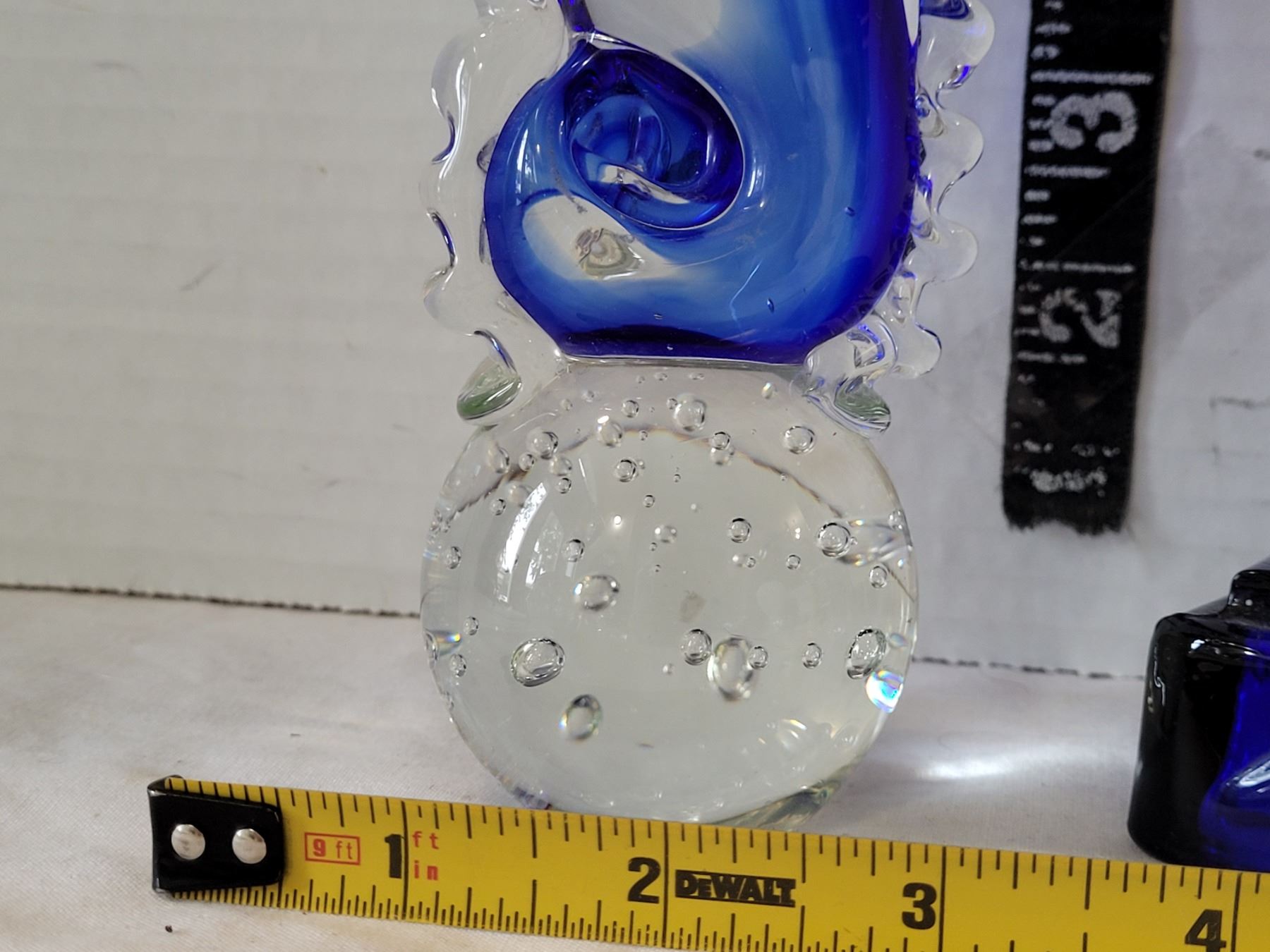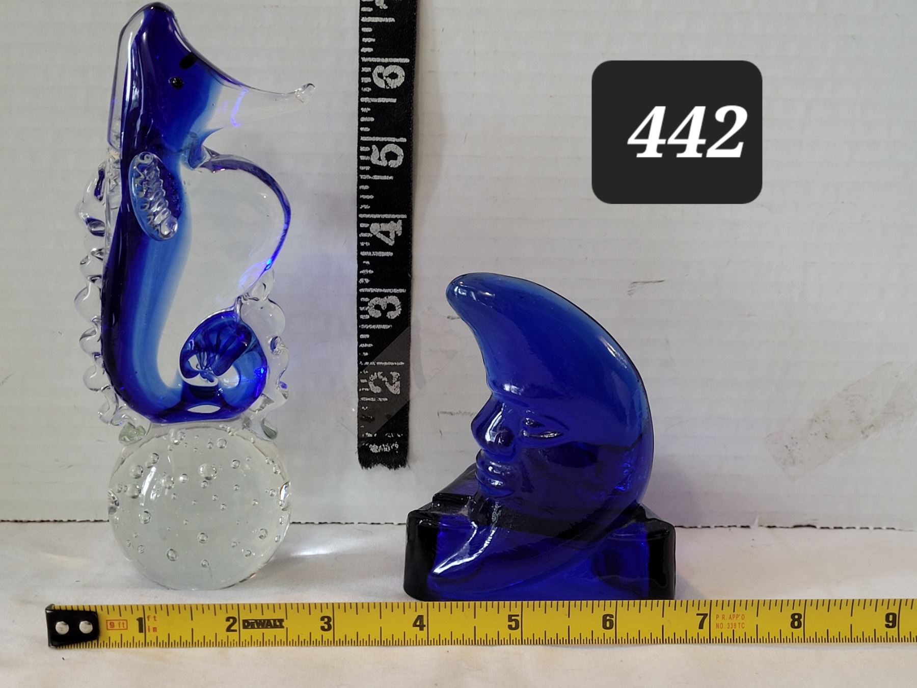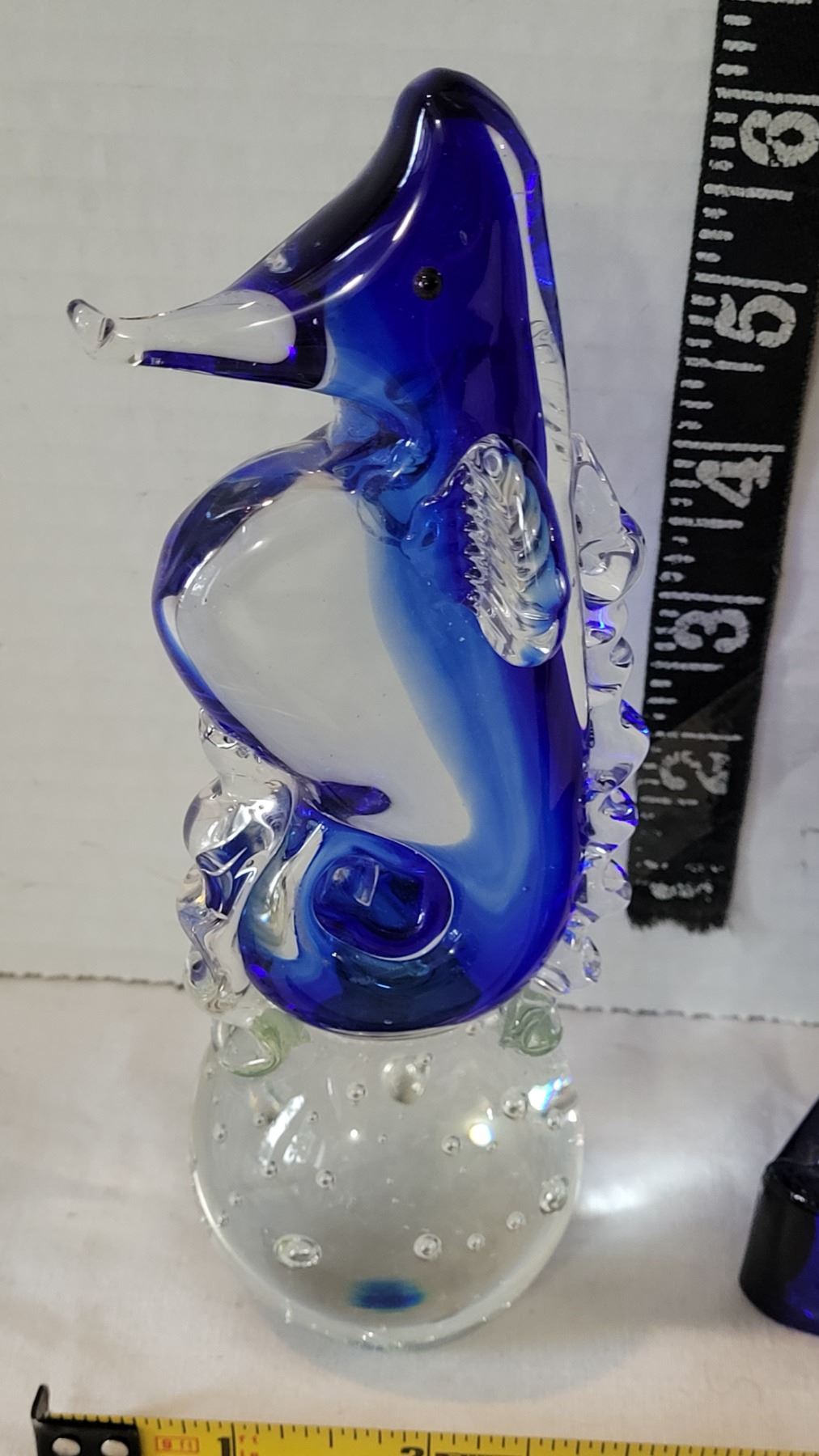Murano style hand blown, cobalt blue glass seahorse on bubble ball plus Crescent moon glass tea light holder.