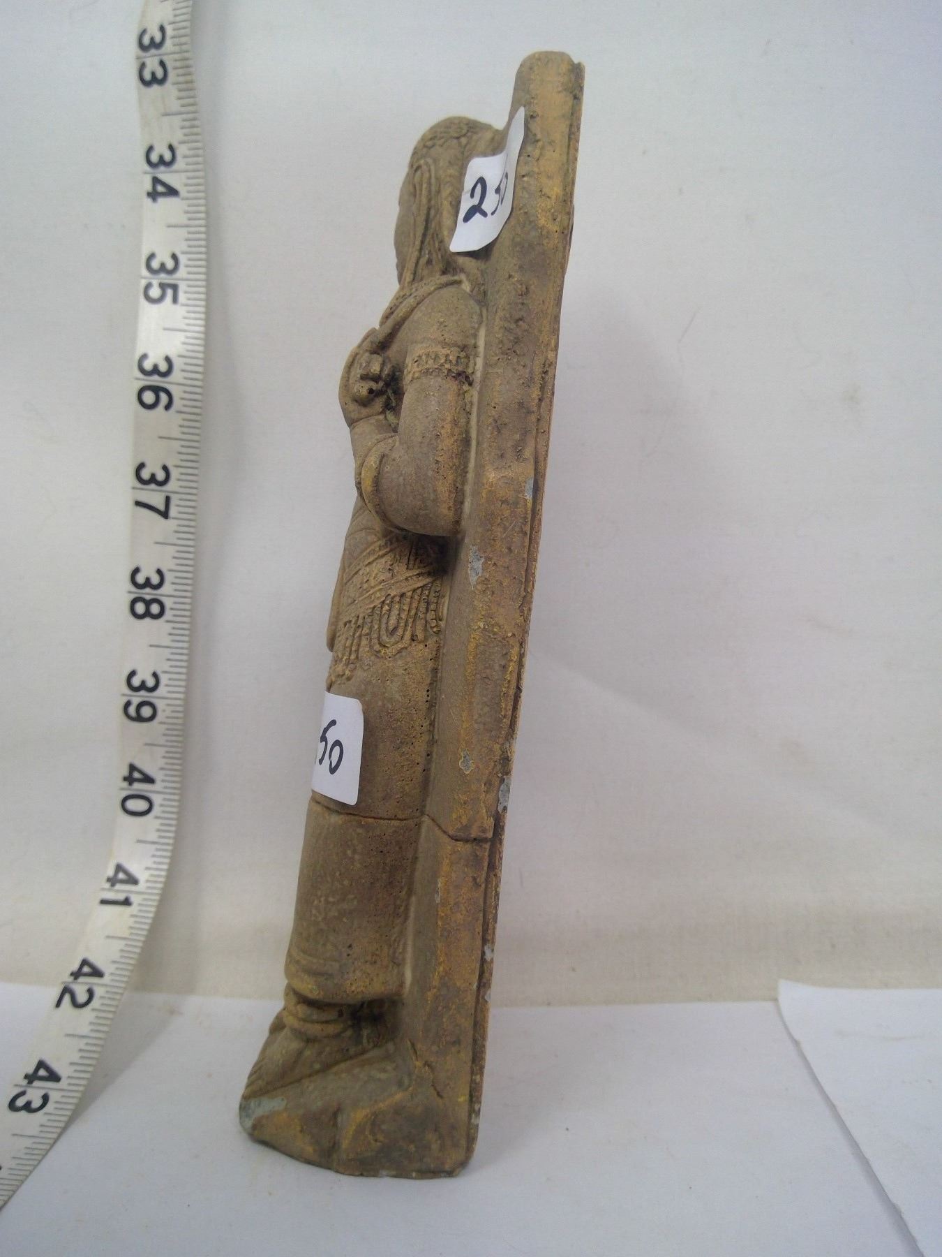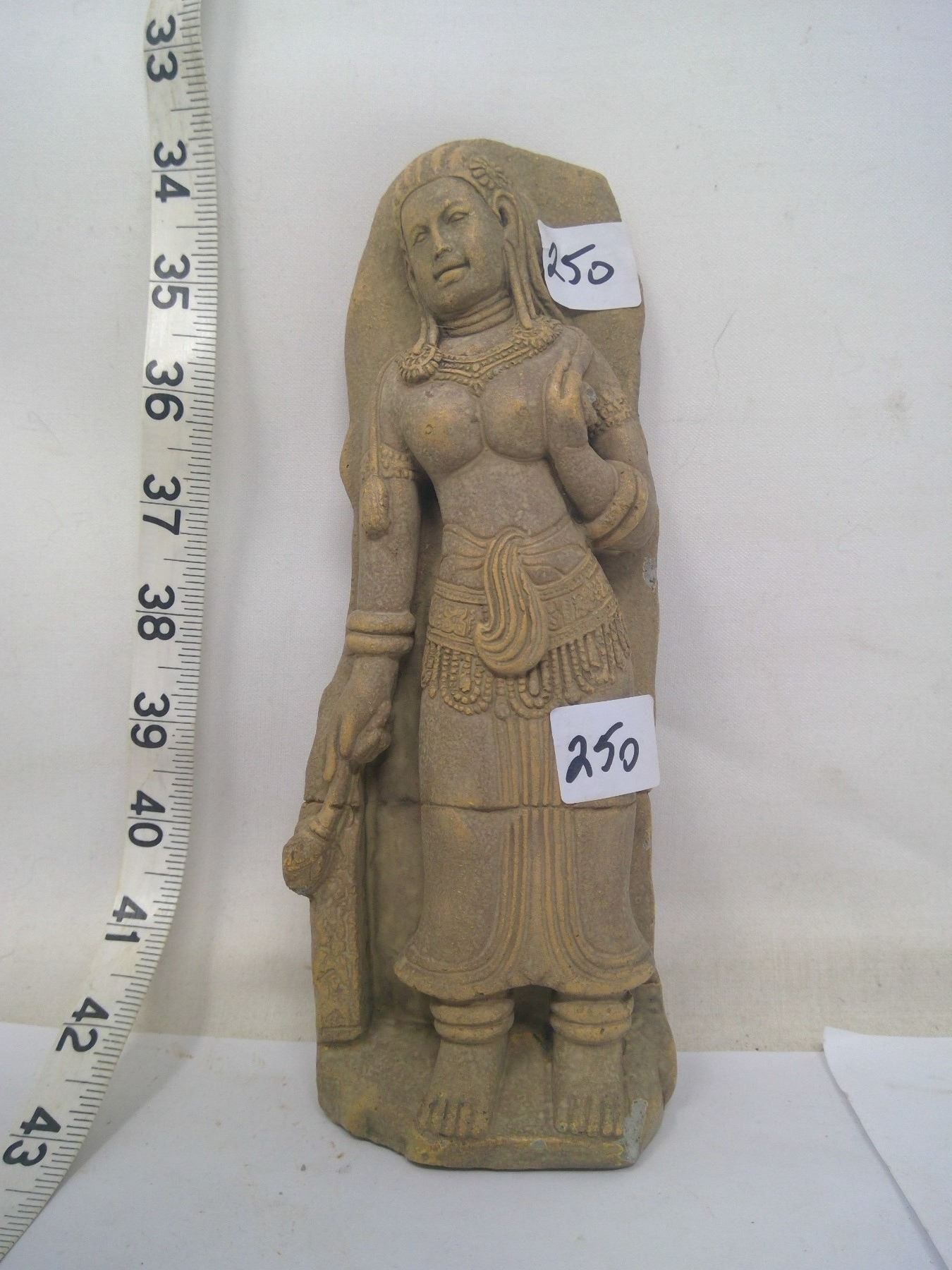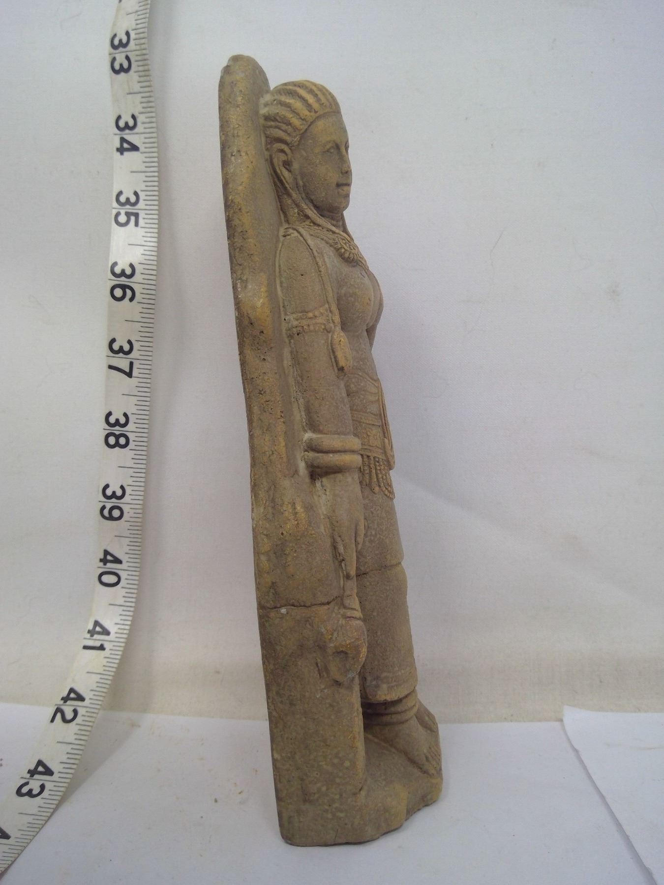 Museum copy Khmer culture Cambodia 700 A.D. Part of carved stone wall Siem Riep, goddess. Height: 9”