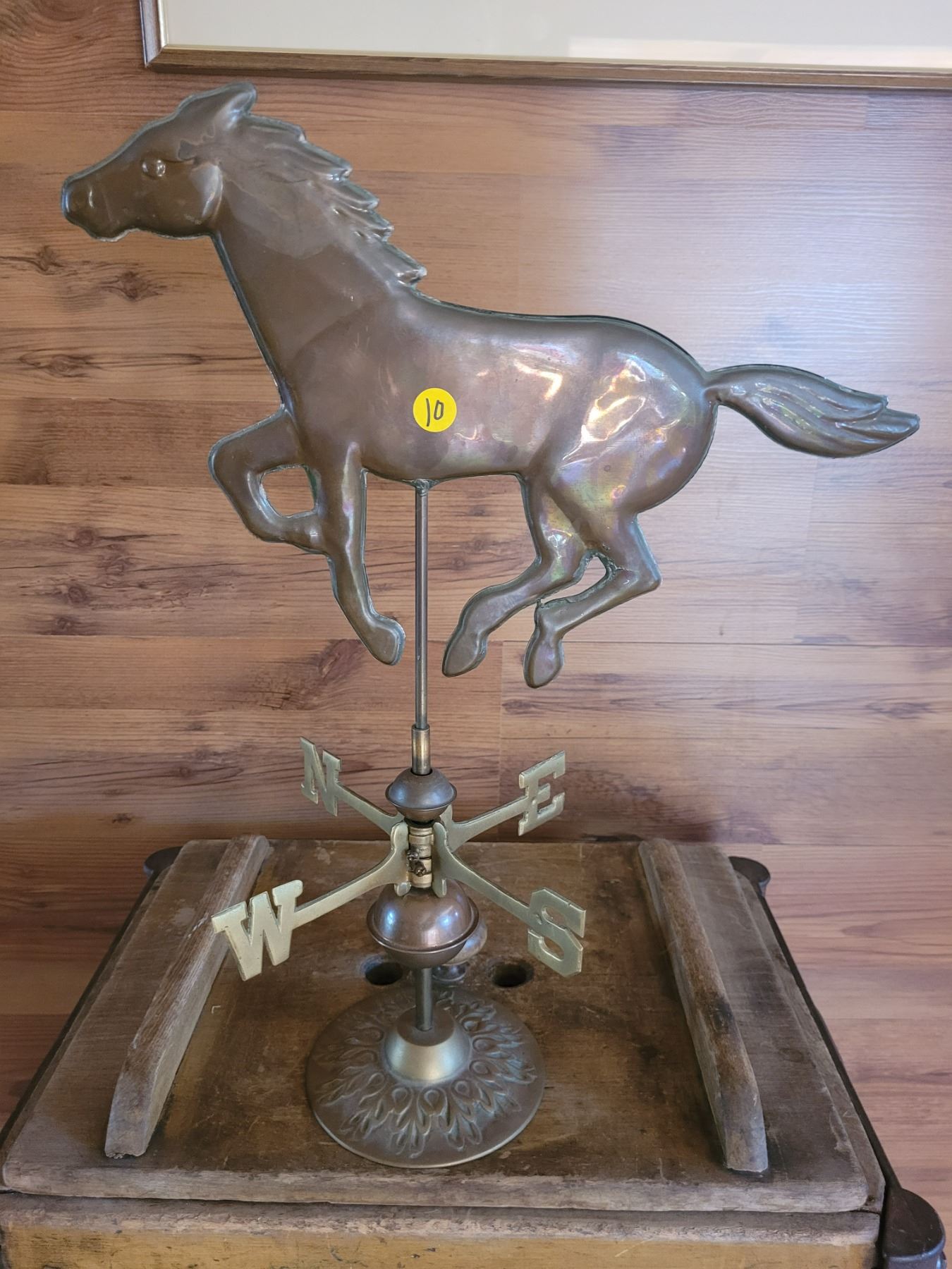 Mustang weather vane-made of brass and copper. 20" tall and horse is 16" long. No damage/bullet holes etc