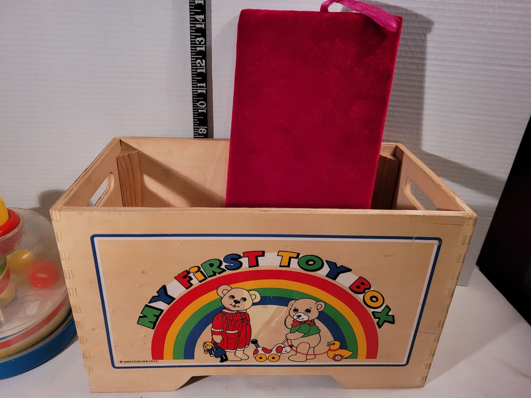 My First Toy box. Wood, velvet lid. Toys, some vintage.