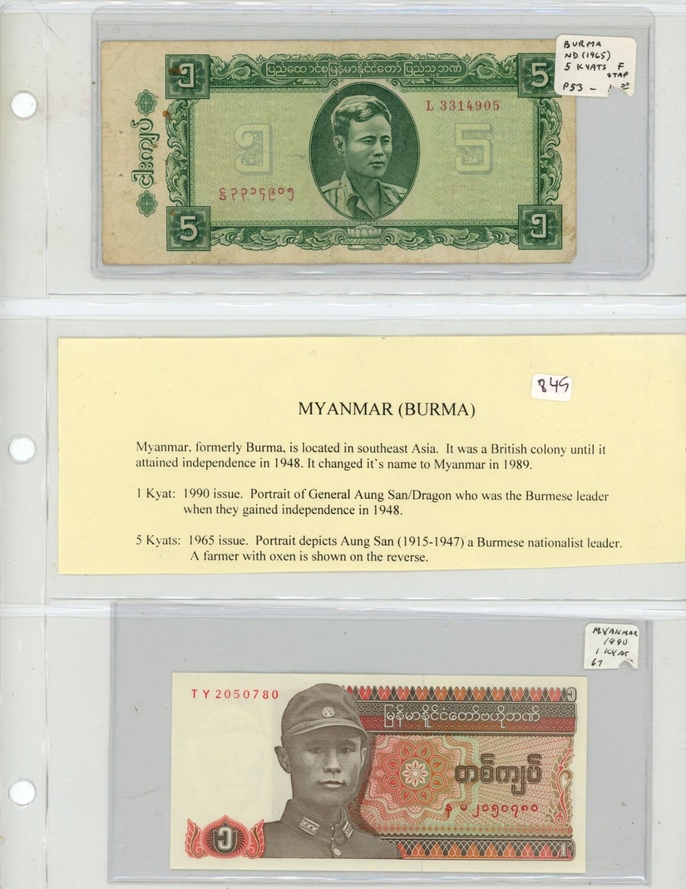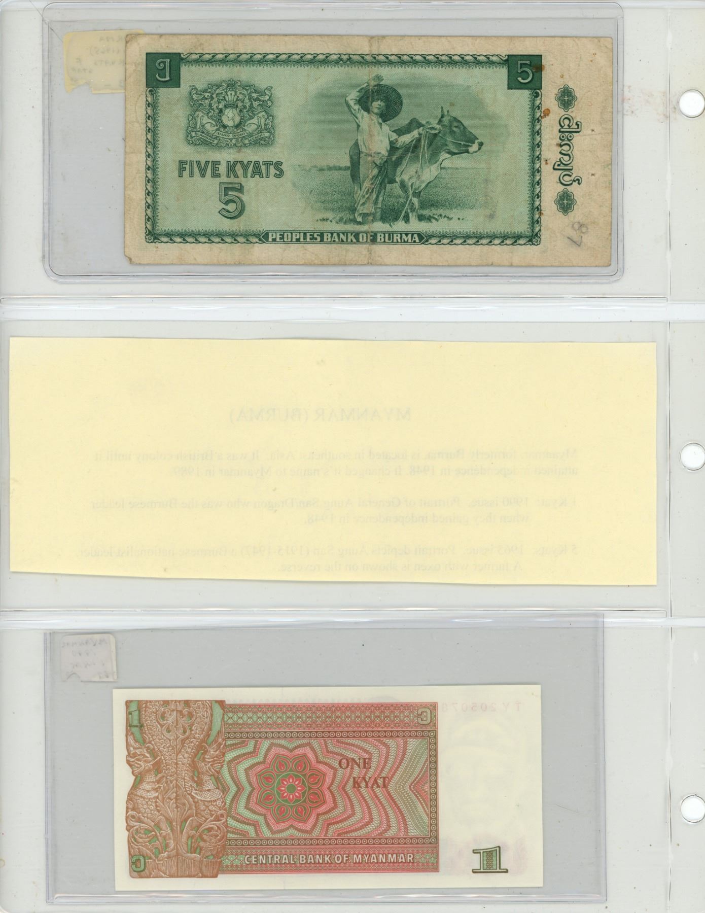 Myanmar. Lot of 2 notes, one under the old name Burma, the other from Myanmar. Burma 1965 5 Kyats P53 F and Myanmar 1990 1 Kyat P-67 Unc.