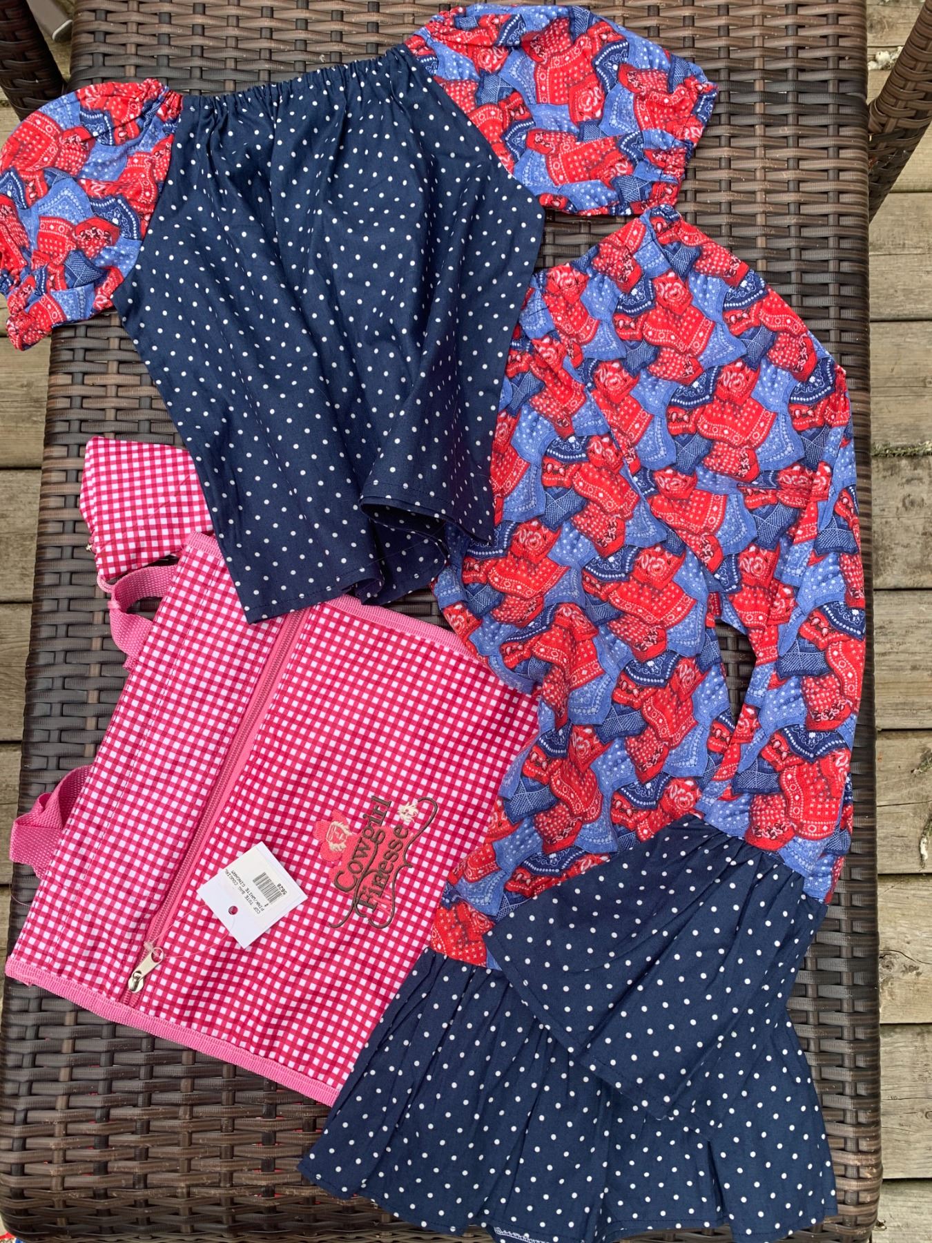 NAVY BLUE POKA DOT/RED PAISLEY GIRLS OUTFIT SIZE6/GREY/DENIM GIRLS DRESS SIZE 10/COWGIRL FINESSE TOTE BAG!!