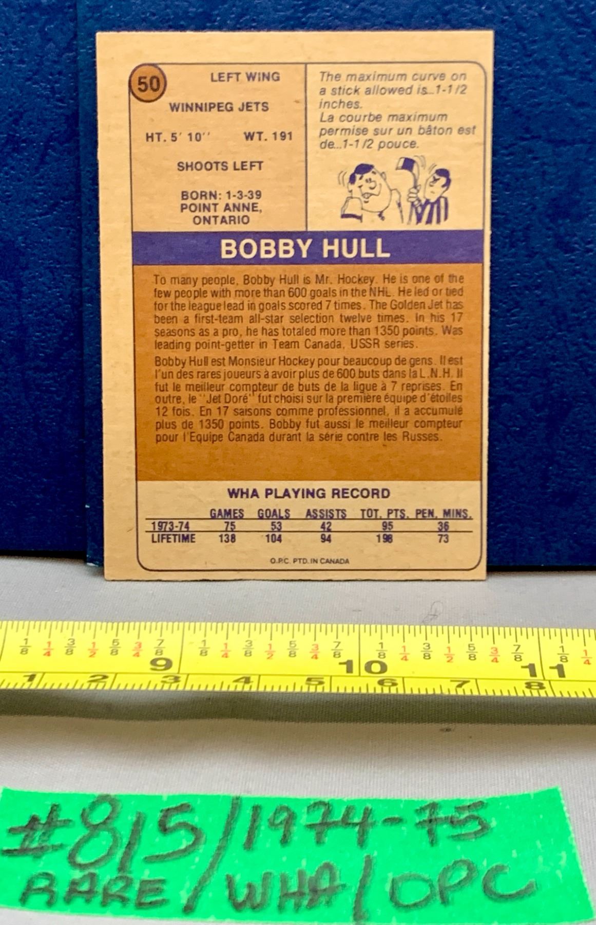 NHL HOCKEY - OPC 1974-75 Rare WHA Golden Jet Bobby Hull Winnipeg Jets
