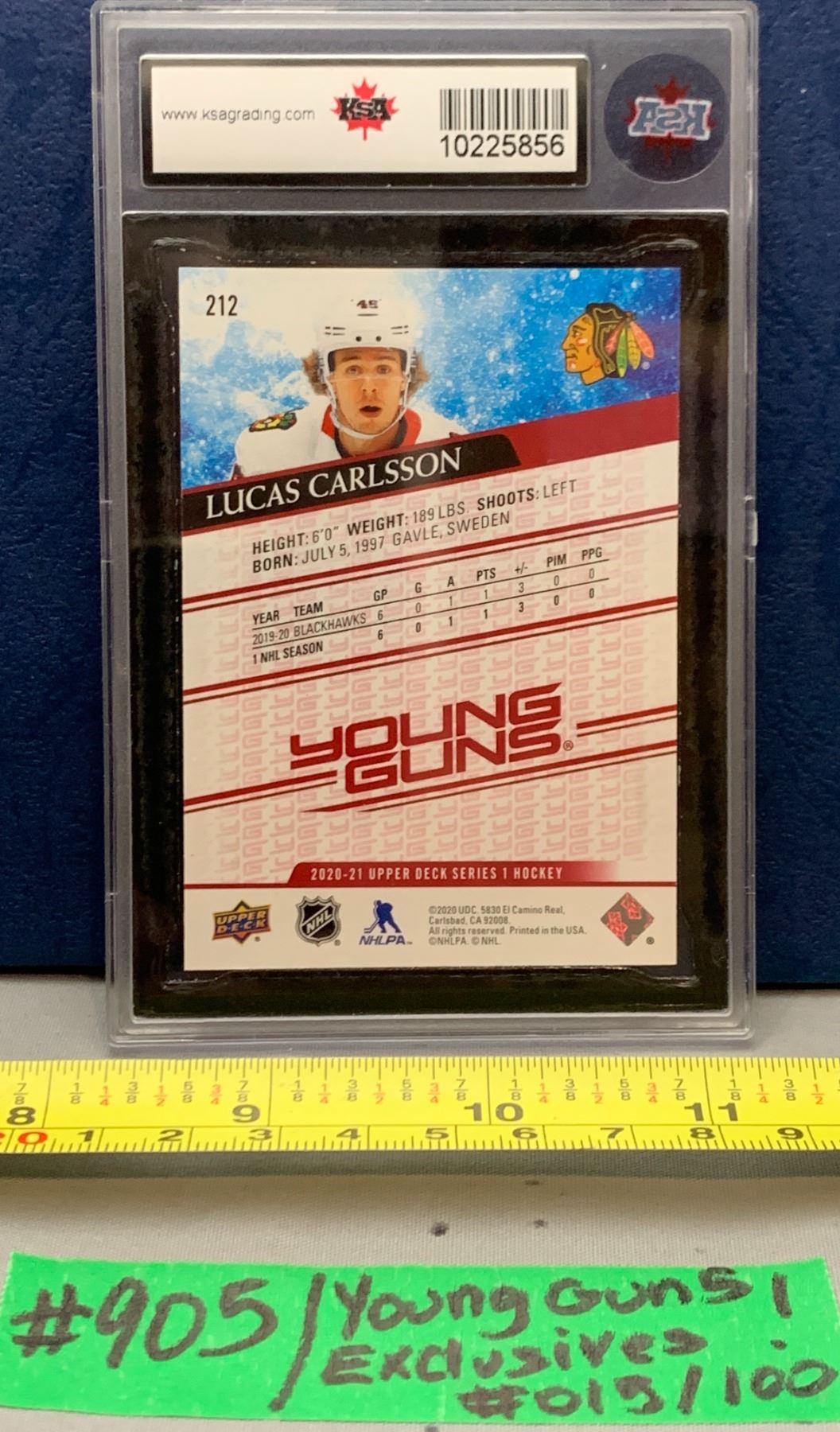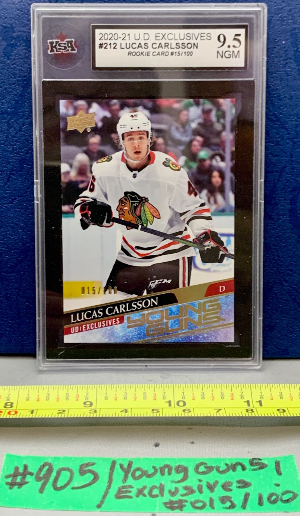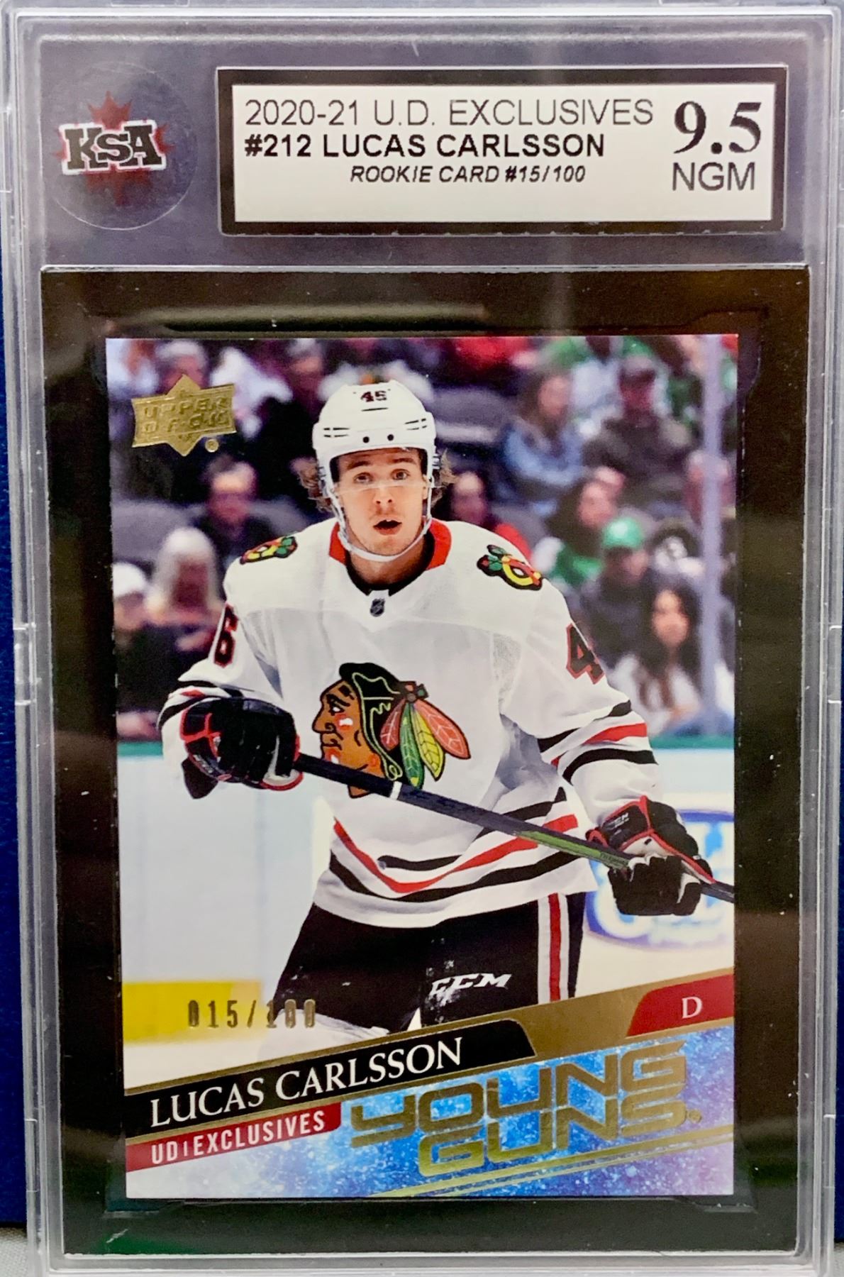 NHL HOCKEY - UD Exclusives RARE #015/100 Lucas Carlsson Young Guns Rookie Card KSA 9.5
